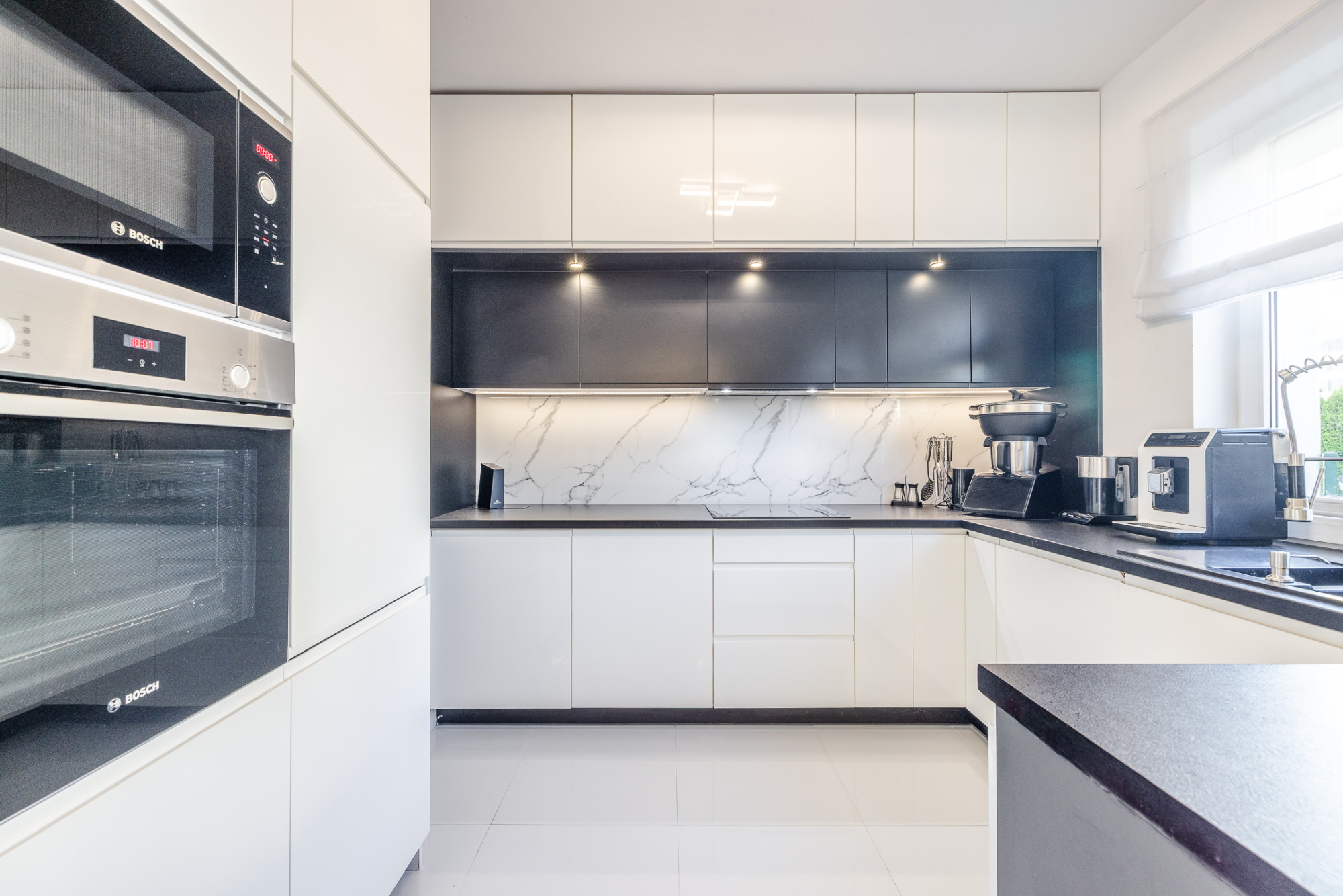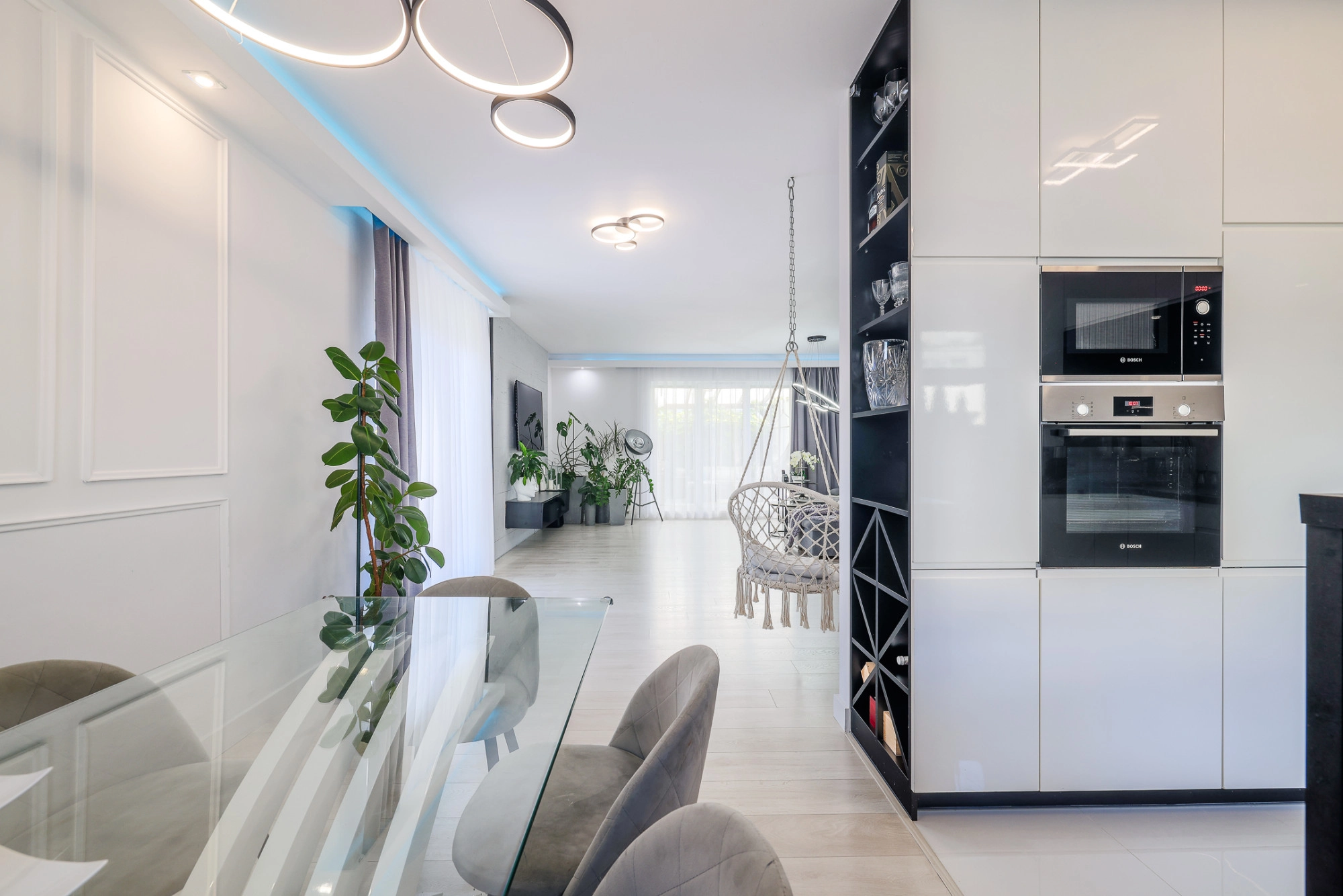 – wysokiej jakości wykończenie – zabudowy i kuchnia wykonane przez stolarza, sprzęt AGD Bosch,