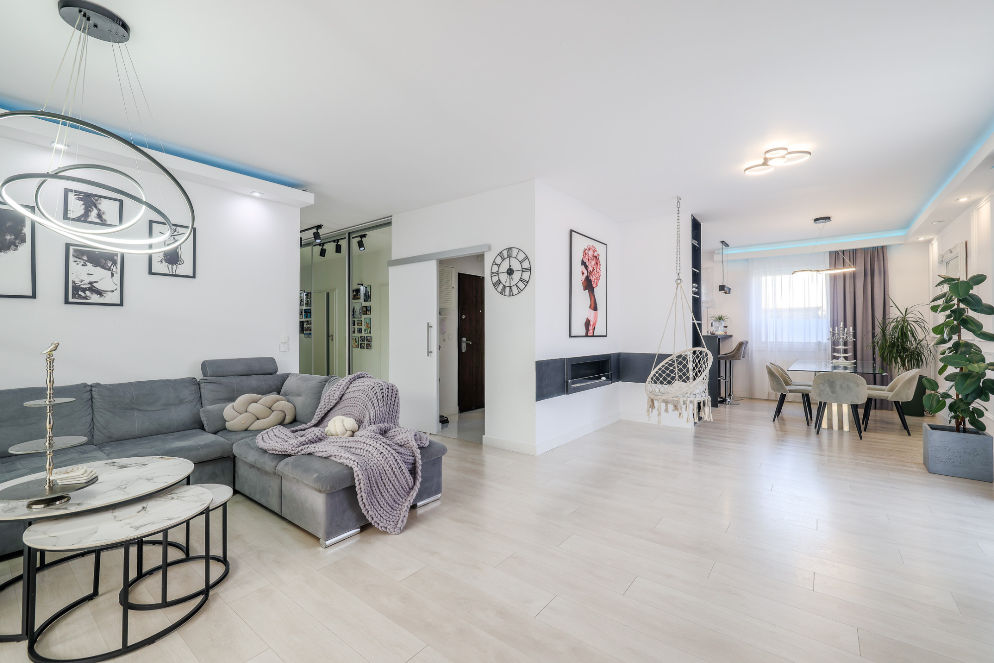 – przestronny salon z aneksem kuchennym i jadalnią,