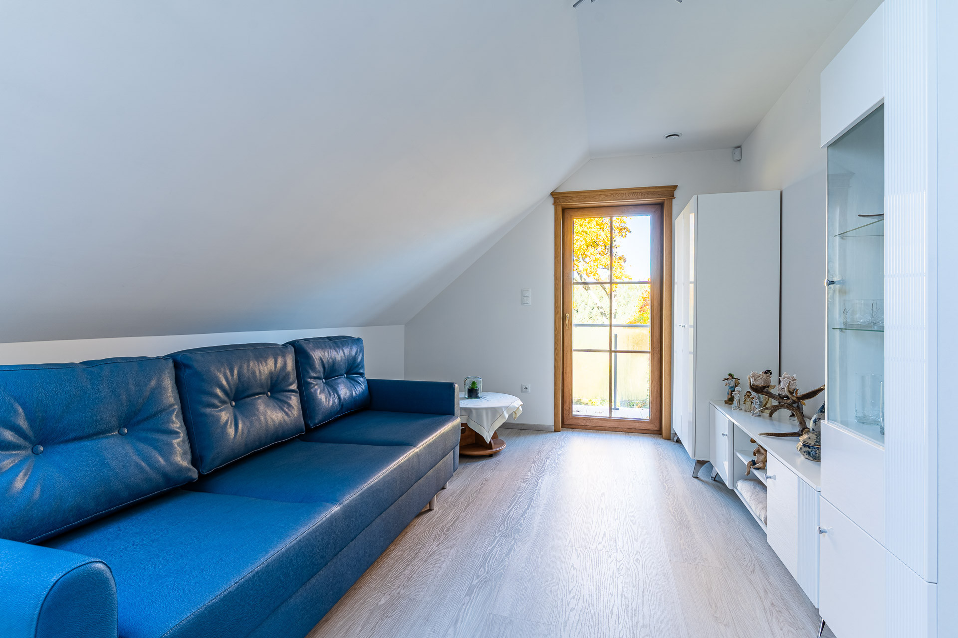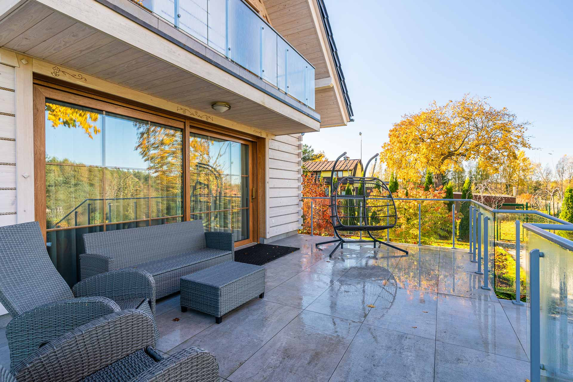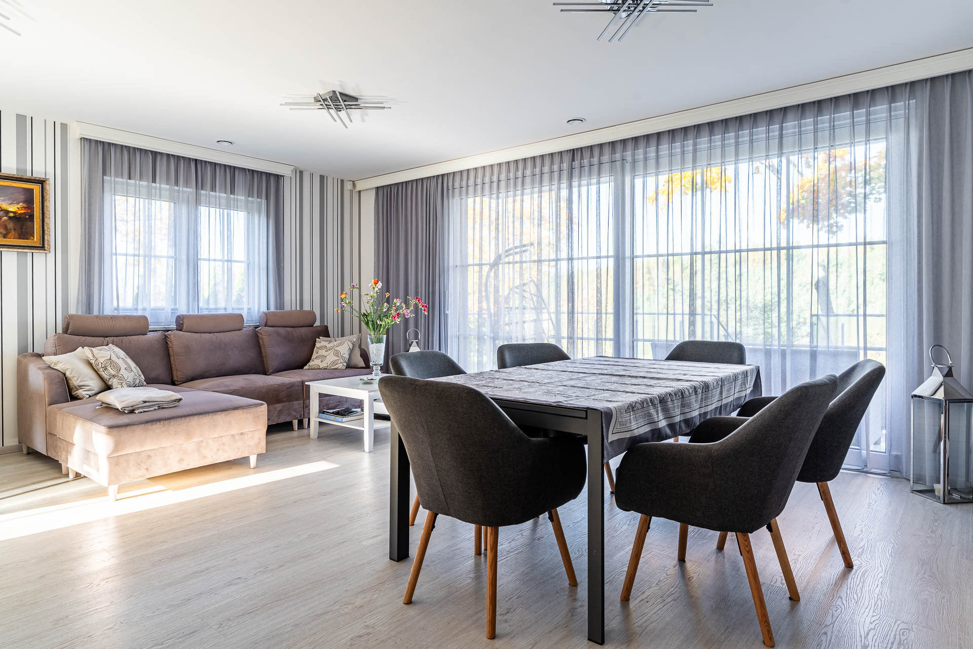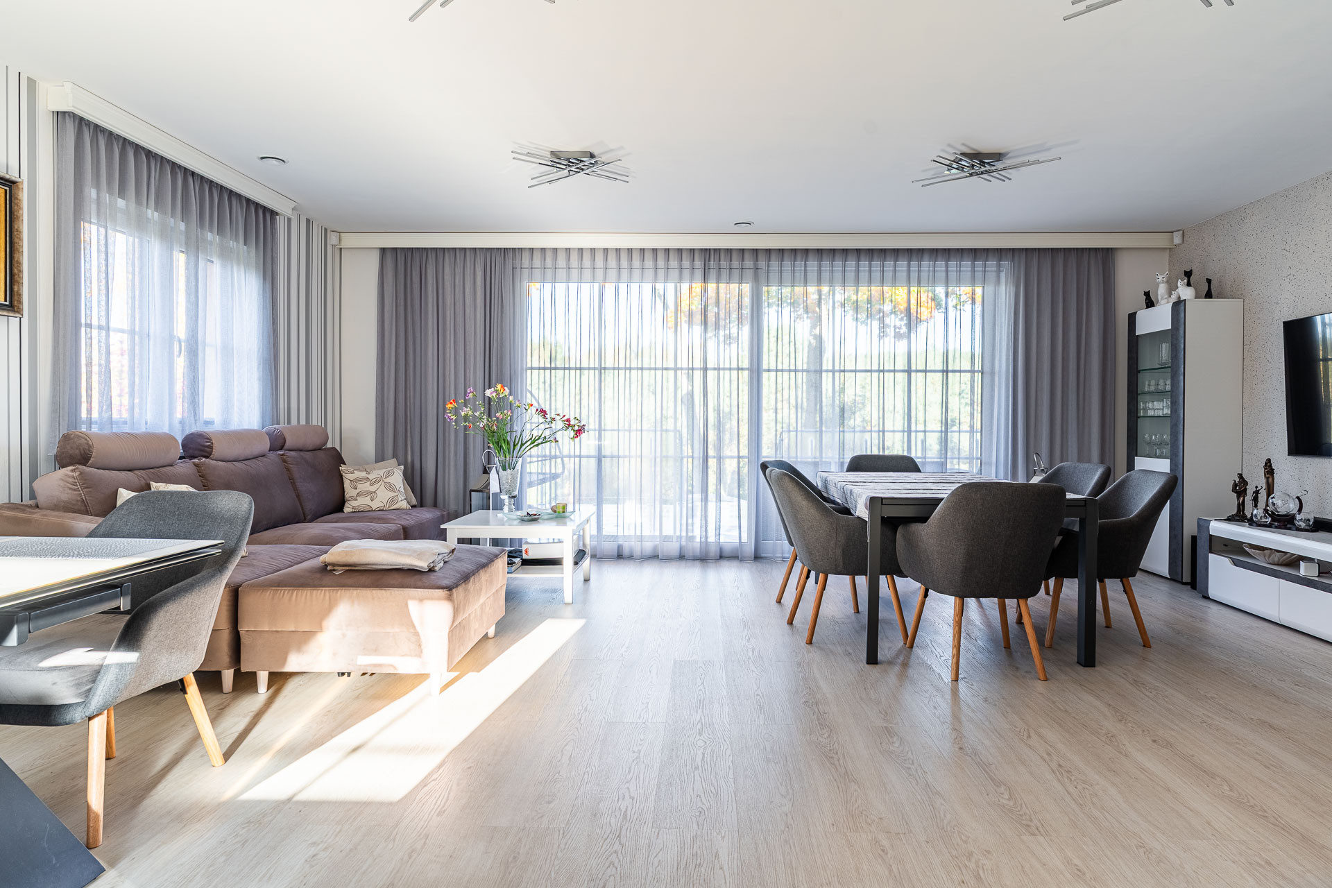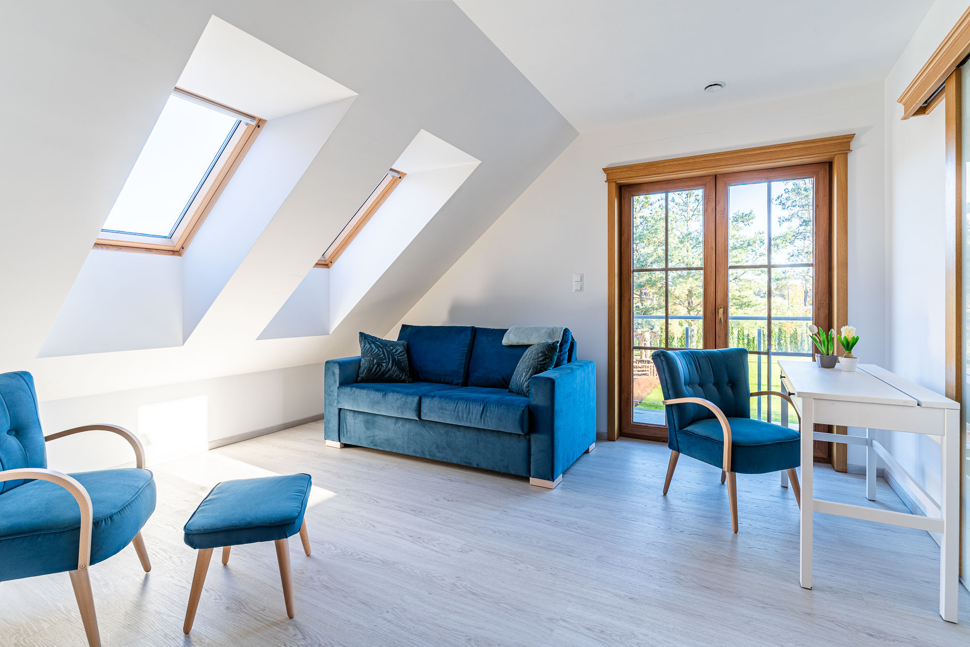 – salon  ok. 34 m2 z wyjściem na duży i wygodny taras z widokiem na ogród i las