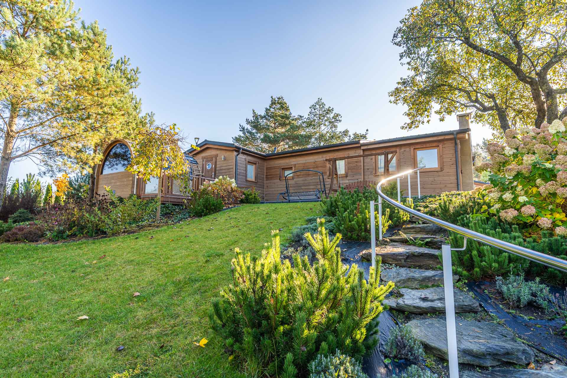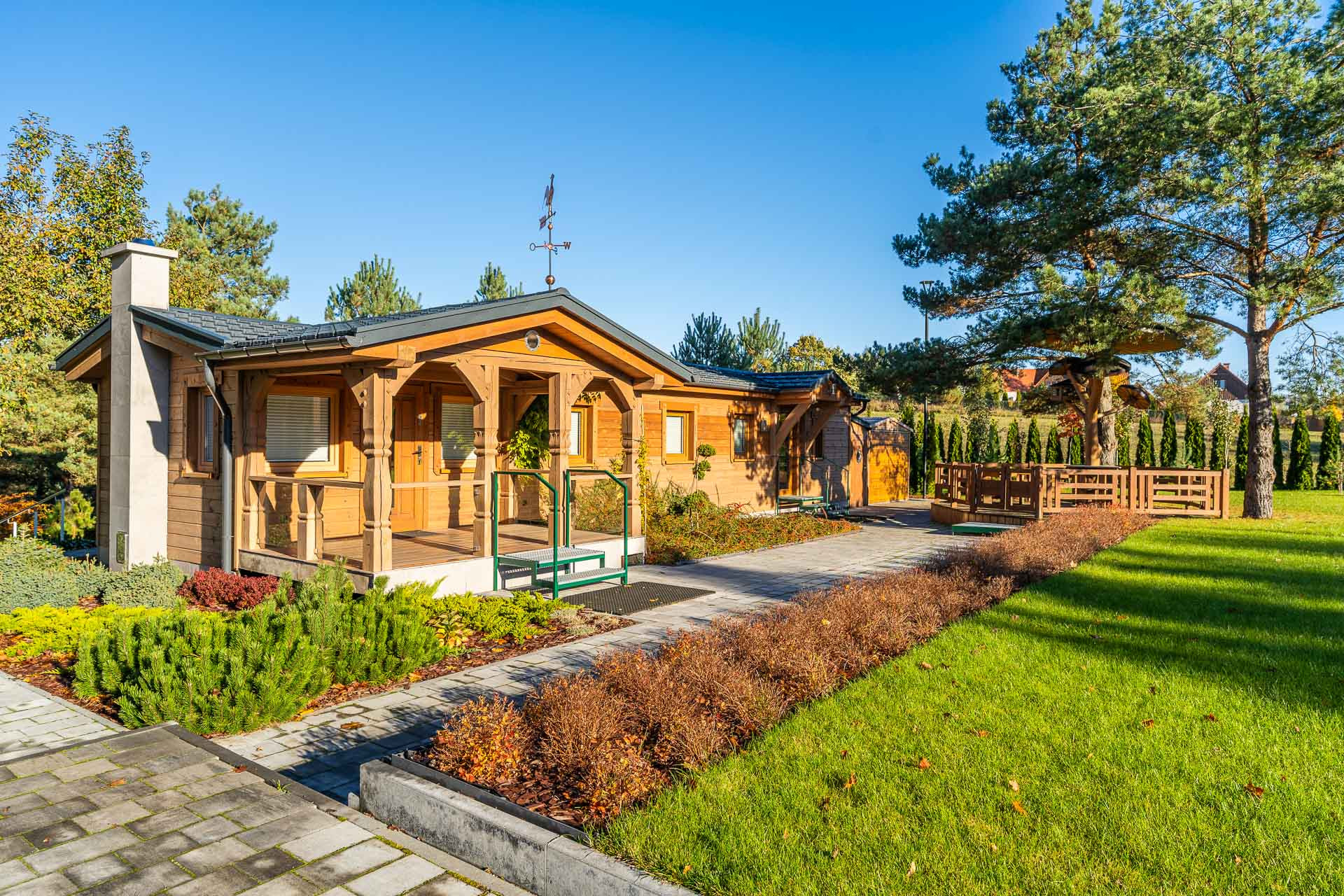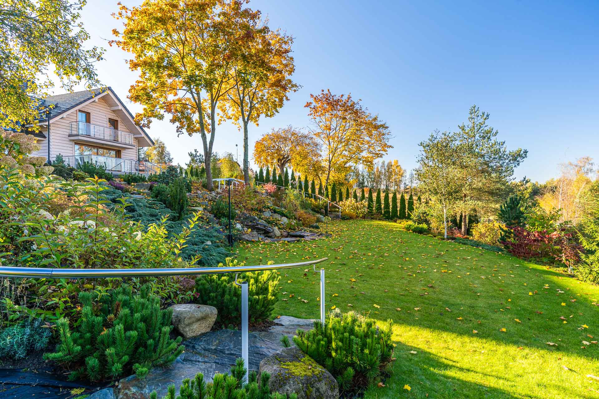Zaprojektowana i całkowicie zagospodarowana. Nawadnianie ogrodowe sterowane automatycznie, liczne nasadzenia oraz ścieżki kamienne. Trawnik i rośliny ogrodowe systematycznie przycinane i pielęgnowane.