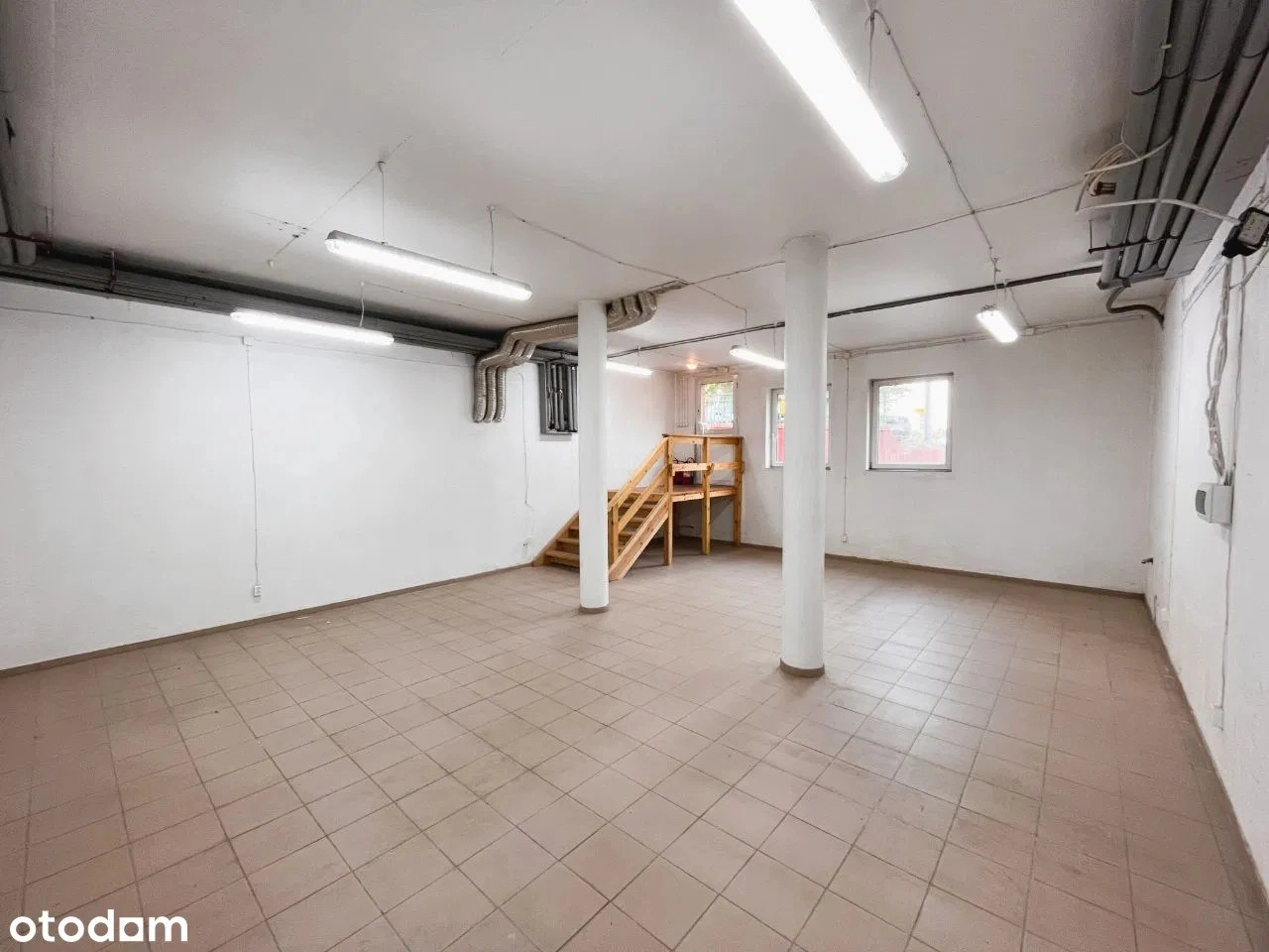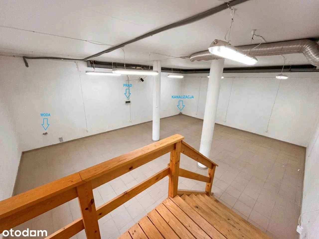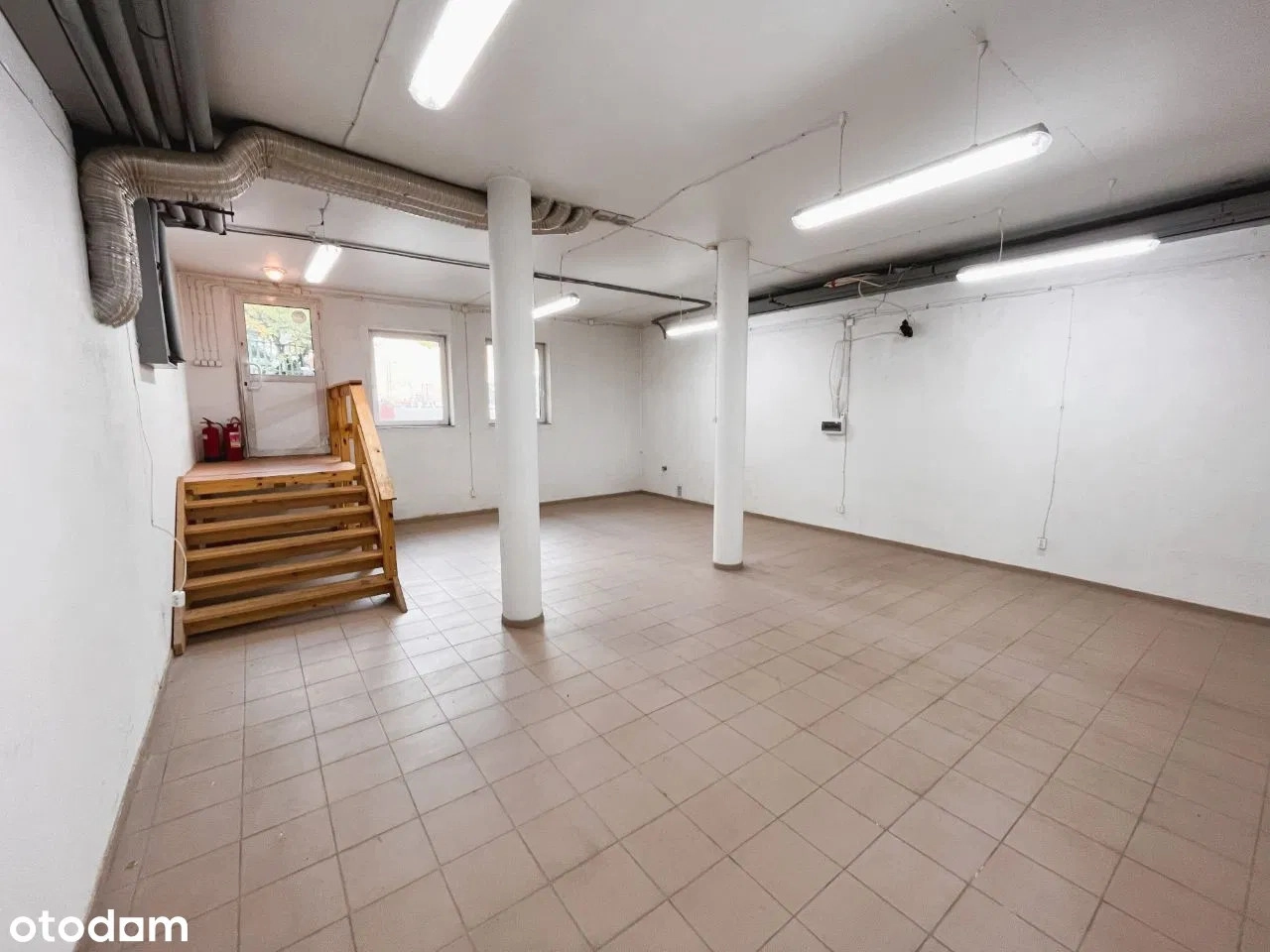 Lokal o powierzchni 63 m2 mieszczący się w przyziemiu. Wymiary 9,06m x 6,95m, wysokość 3,27m.
