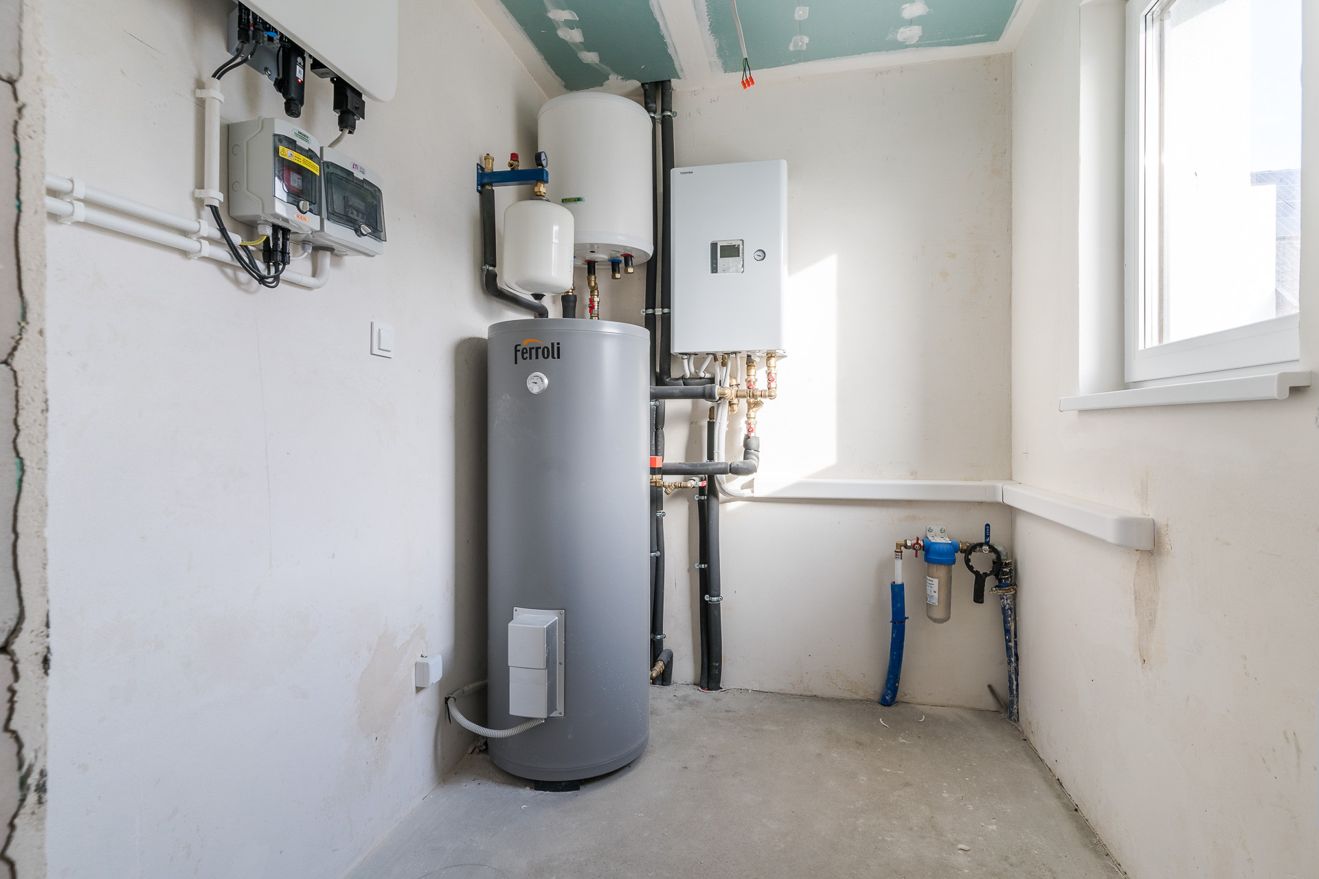 pompa- Toshiba ESTIA R32 HWT-401HW-E / HWT-601XWHT3W-E ze sterownikiem przewodowym i agregatem skraplającym, zasobnik CWU emaliowany o pojemności ok. 200l, pompa cyrkulacyjna, zbiornik buforowy ok. 80l