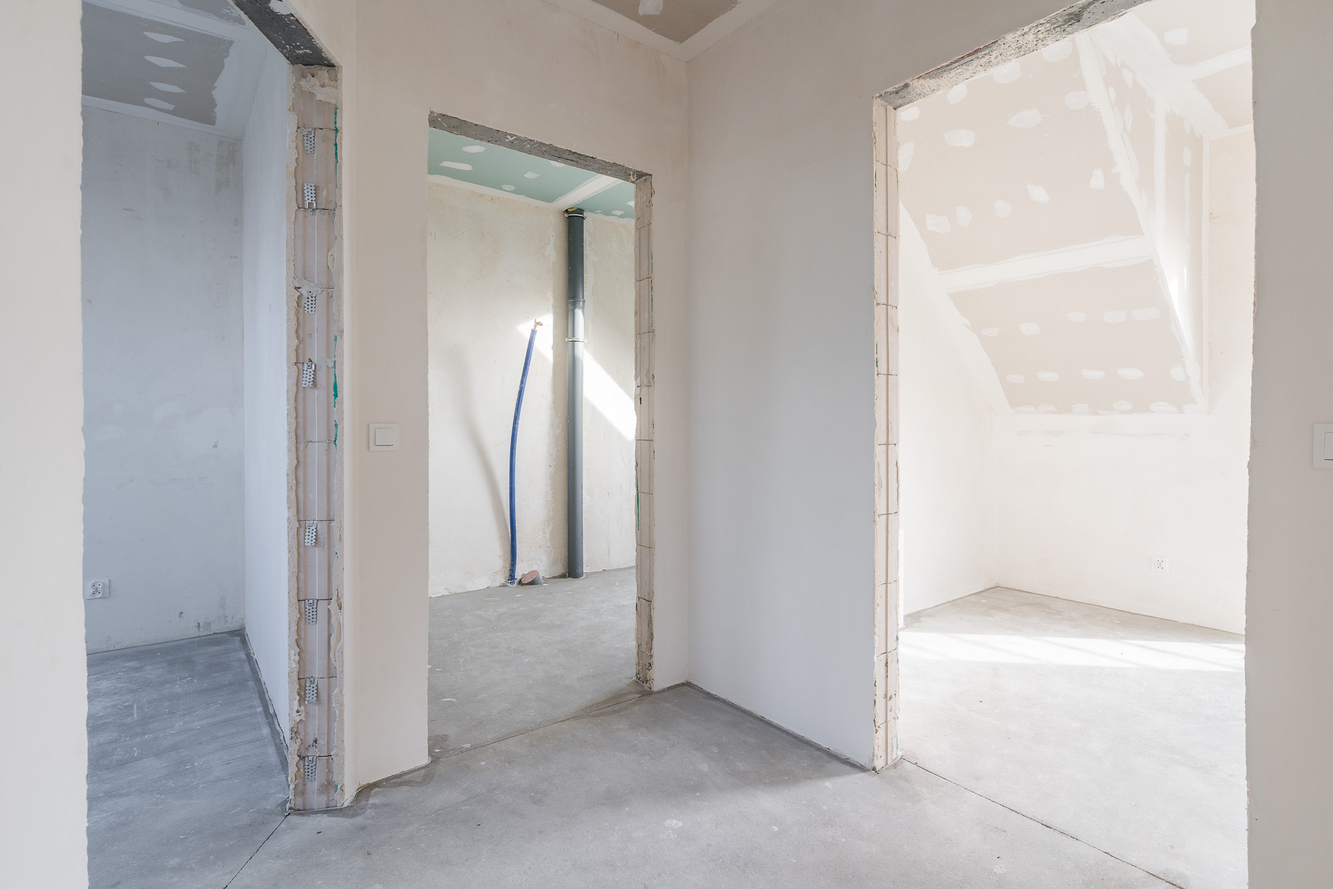 strop: nad parterem – sprężone płyty stropowe Teriva panel obudowane płytami GK na ruszcie metalowym, nad poddaszem – strop drewniany obudowany płytami GK na ruszcie metalowym i ocieplony wełną mineralną,