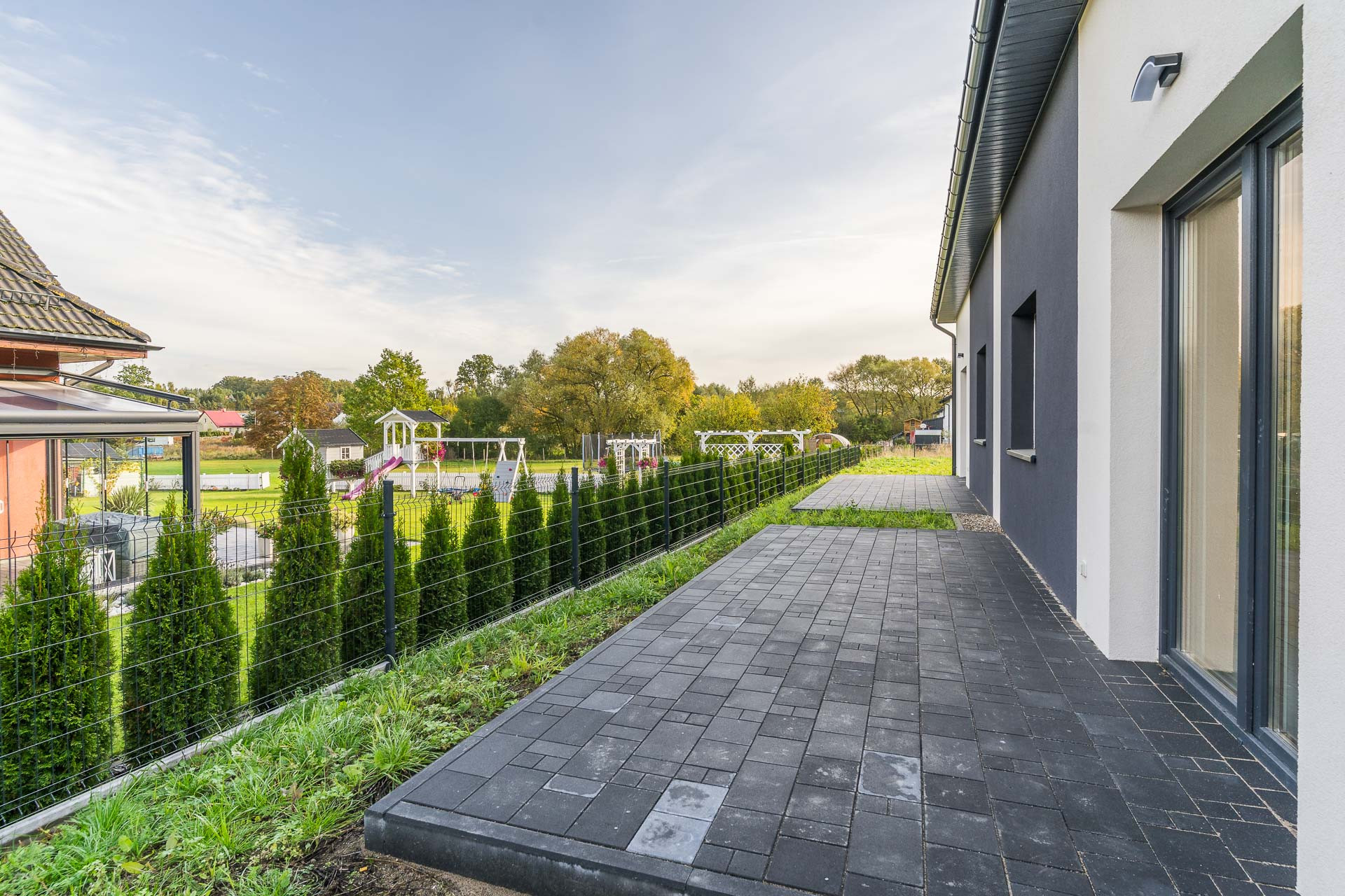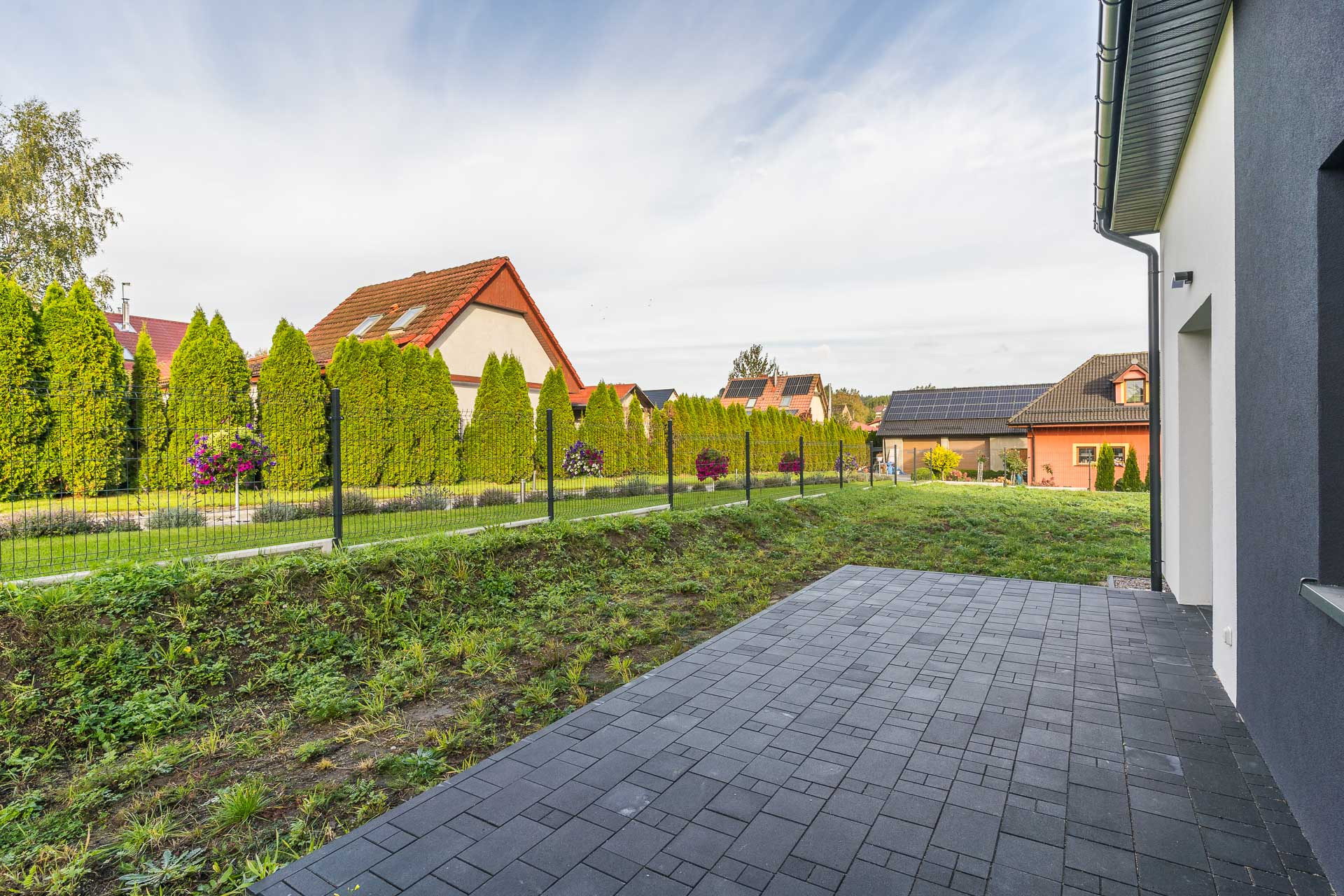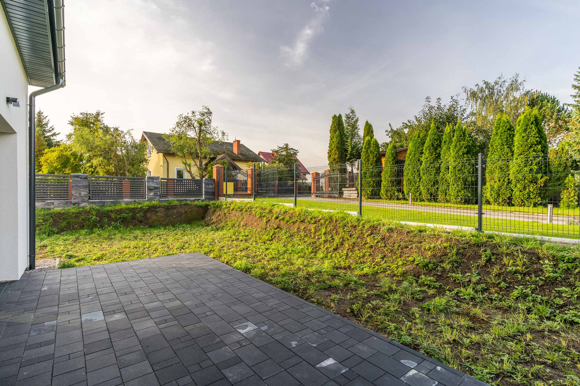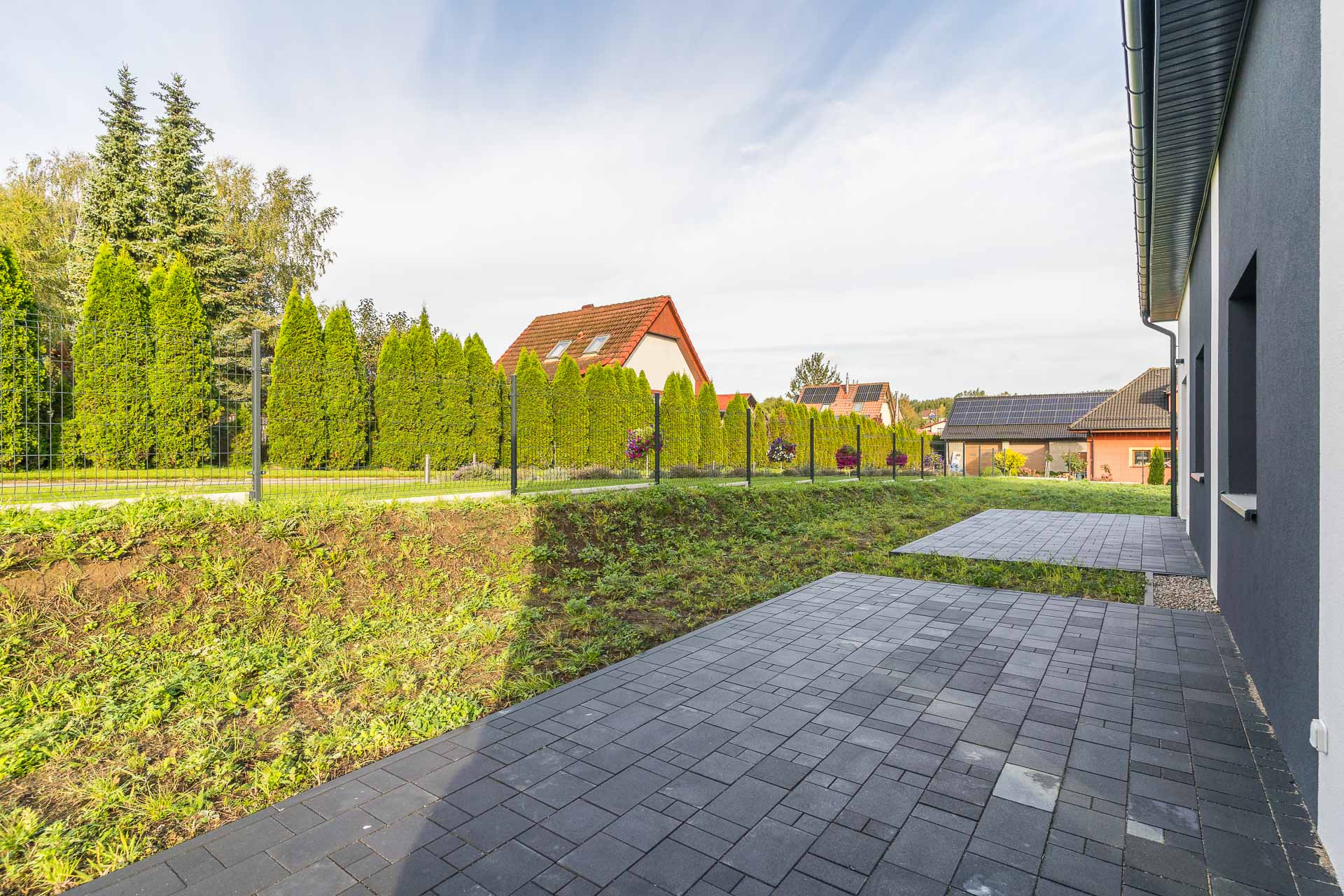 ogrodzenie: od strony drogi – murowane z bloczków FINI w kolorze stalowo białym+ szlaban + furtka, pozostałe strony – panel ogrodzeniowy 3D 250/123 fi 4 kolor antracyt wraz z podmurówką betonową