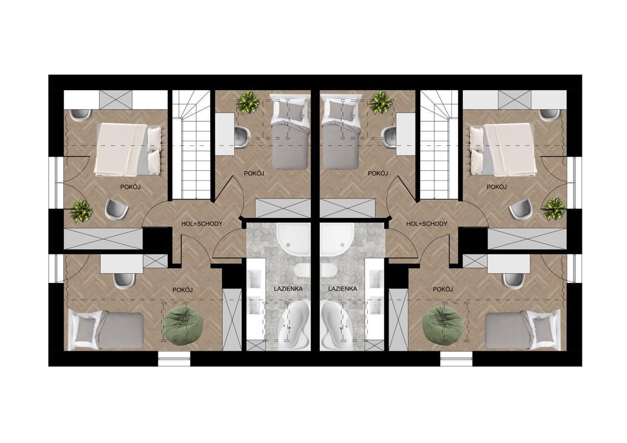 Domy są w stanie deweloperskim i zostały zaprojektowane z myślą o potrzebach rodzin. Na parterze znajdują się przestronny salon, pokój, kuchnia, łazienka, kotłownia, wiatrołap oraz hol. Na poddaszu znajdują się trzy sypialnie, łazienka oraz hol ze schodami.