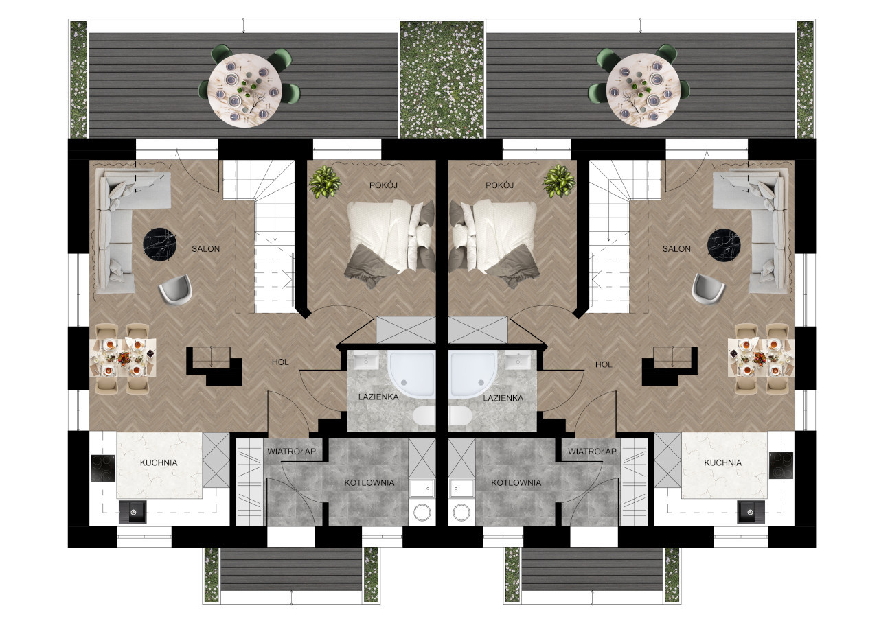– Dwa miejsca postojowe przypisane do każdego domu.