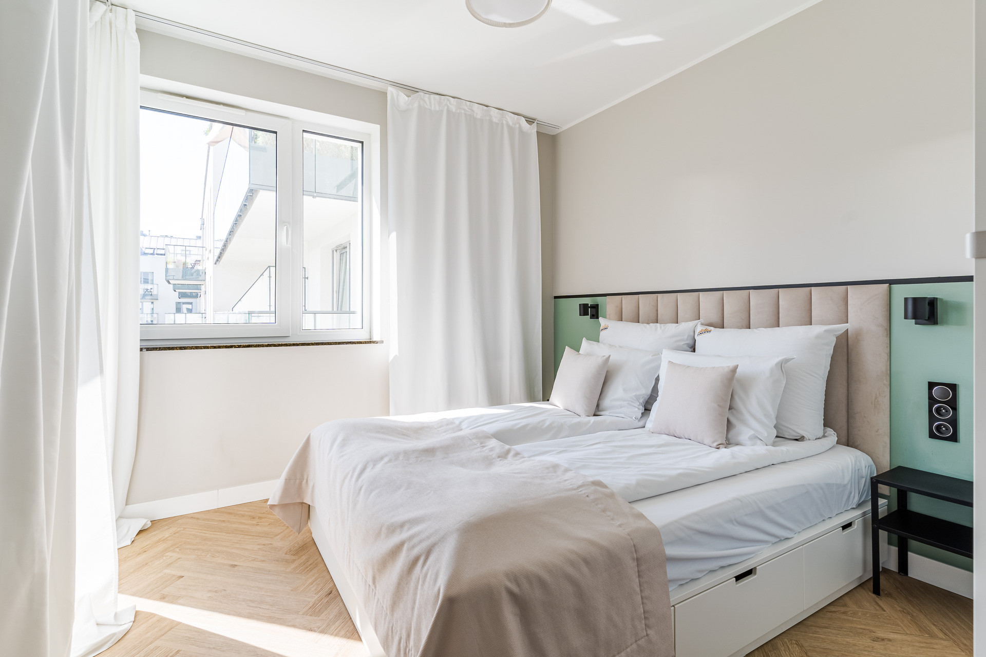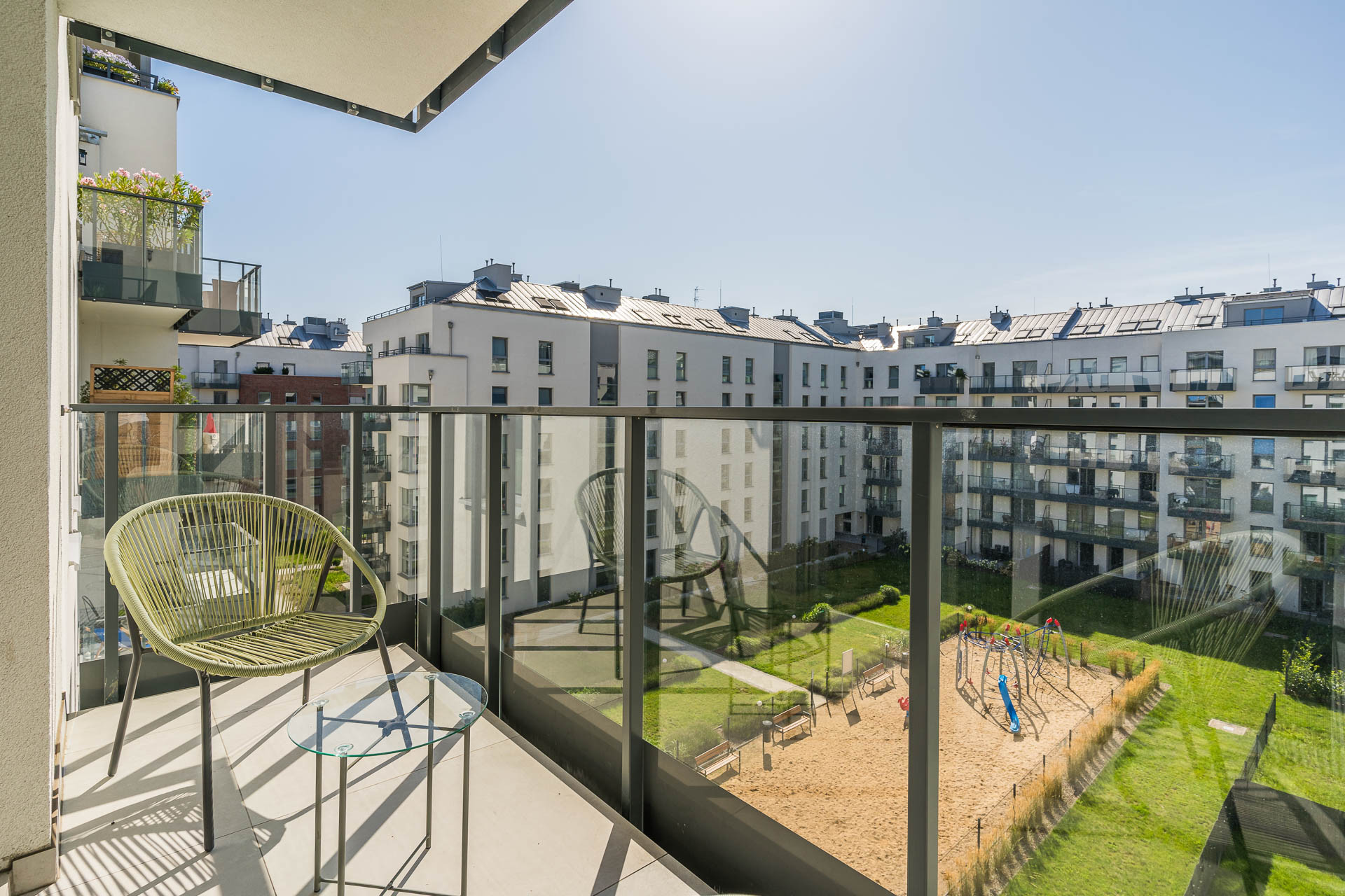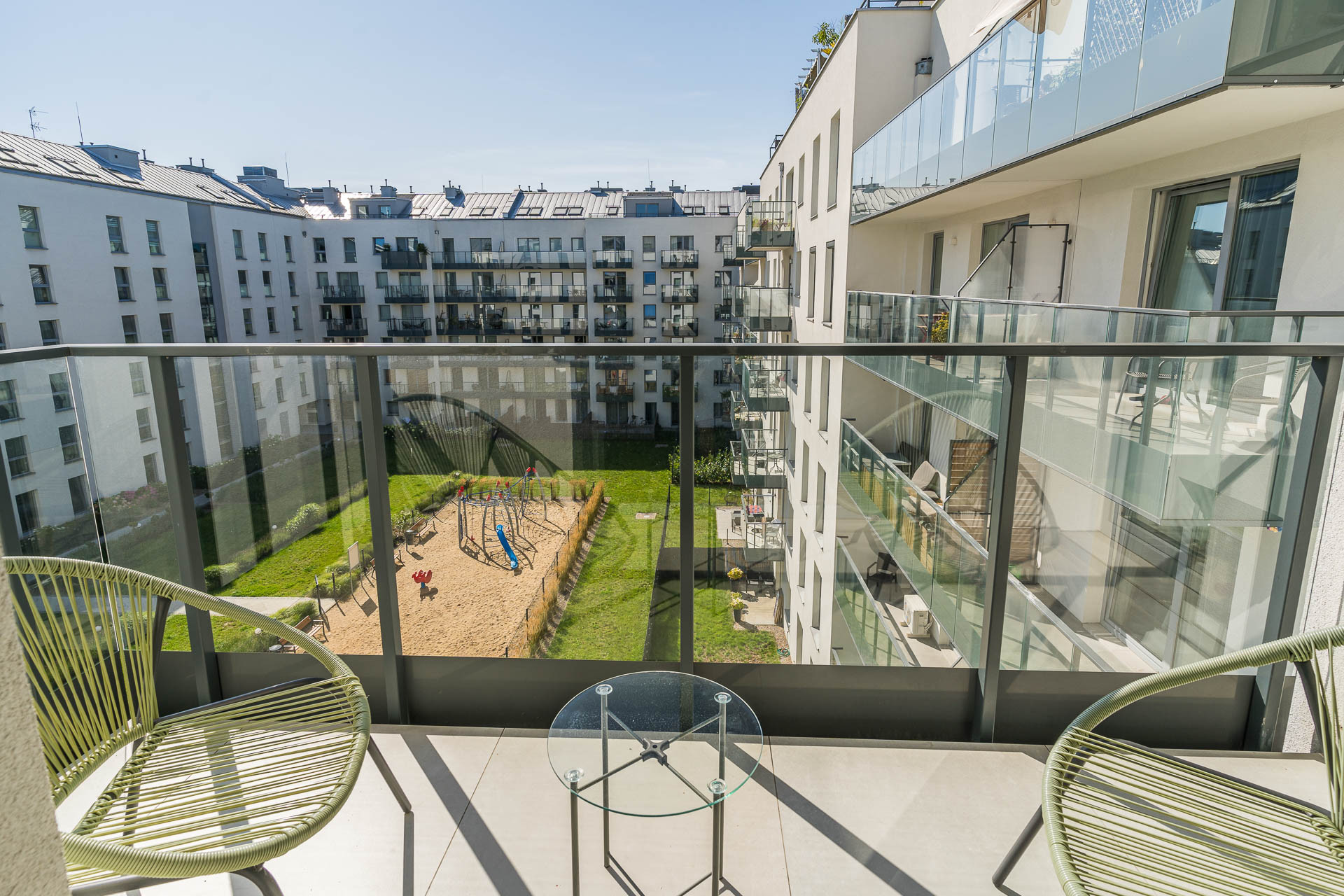 Apartament oferuje piękny widok na zielone patio, zachodnią ekspozycję i gwarantuje ciszę oraz spokój.