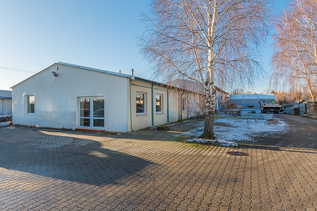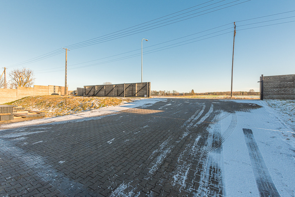 działka o powierzchni 2540 m2 zabudowana budynkiem z częścią biurową (ok. 190 m2) oraz halami o powierzchni łącznej około 390 m2 i wysokości 5 oraz 3 metry.