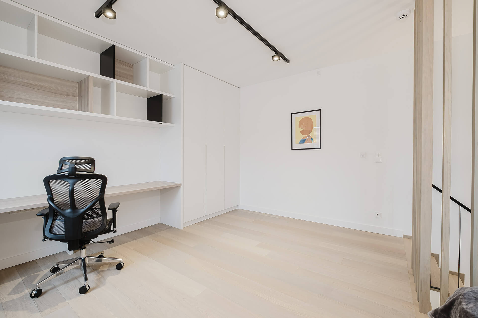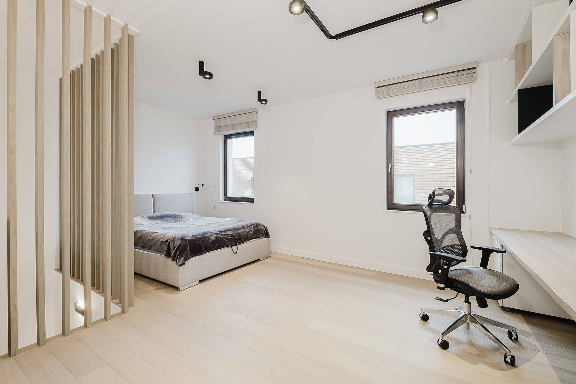 – sypialnia na piętrze z wydzieloną przestrzenią do pracy;