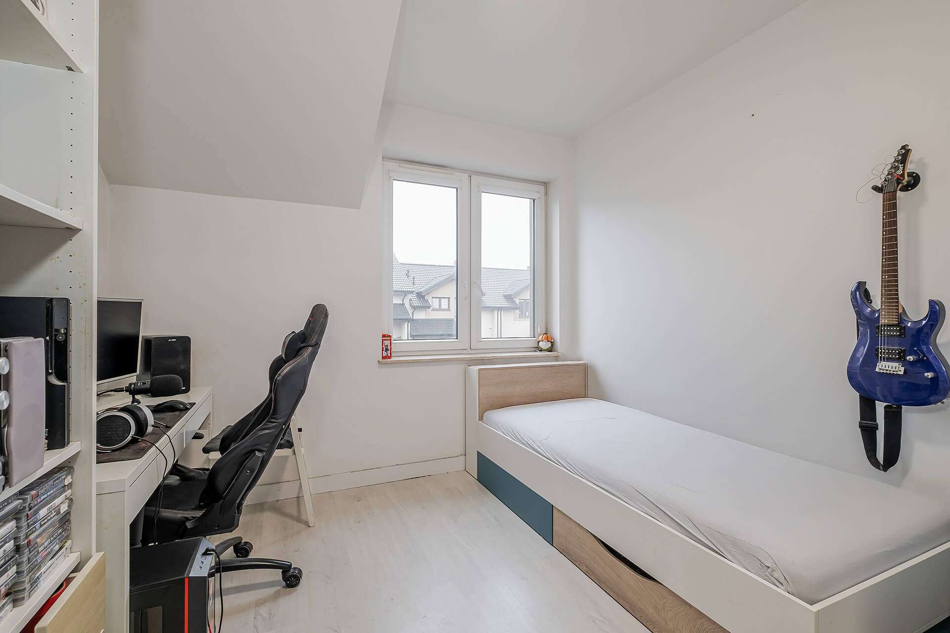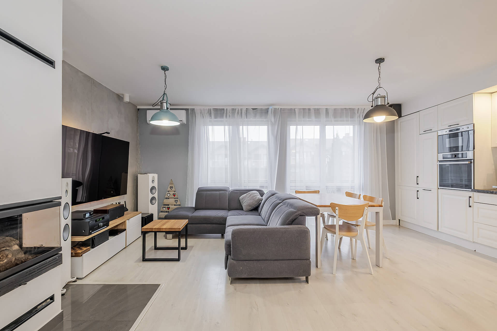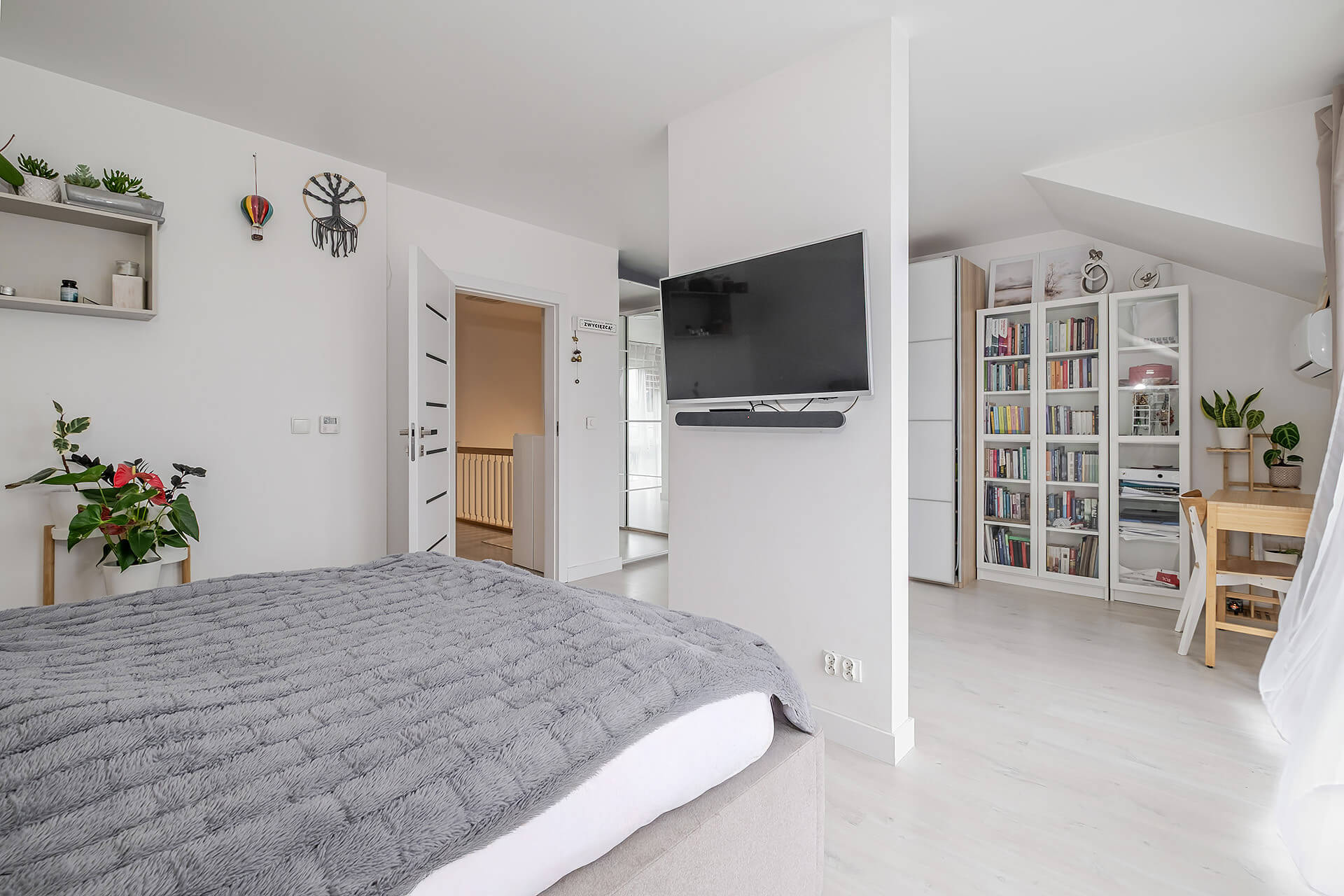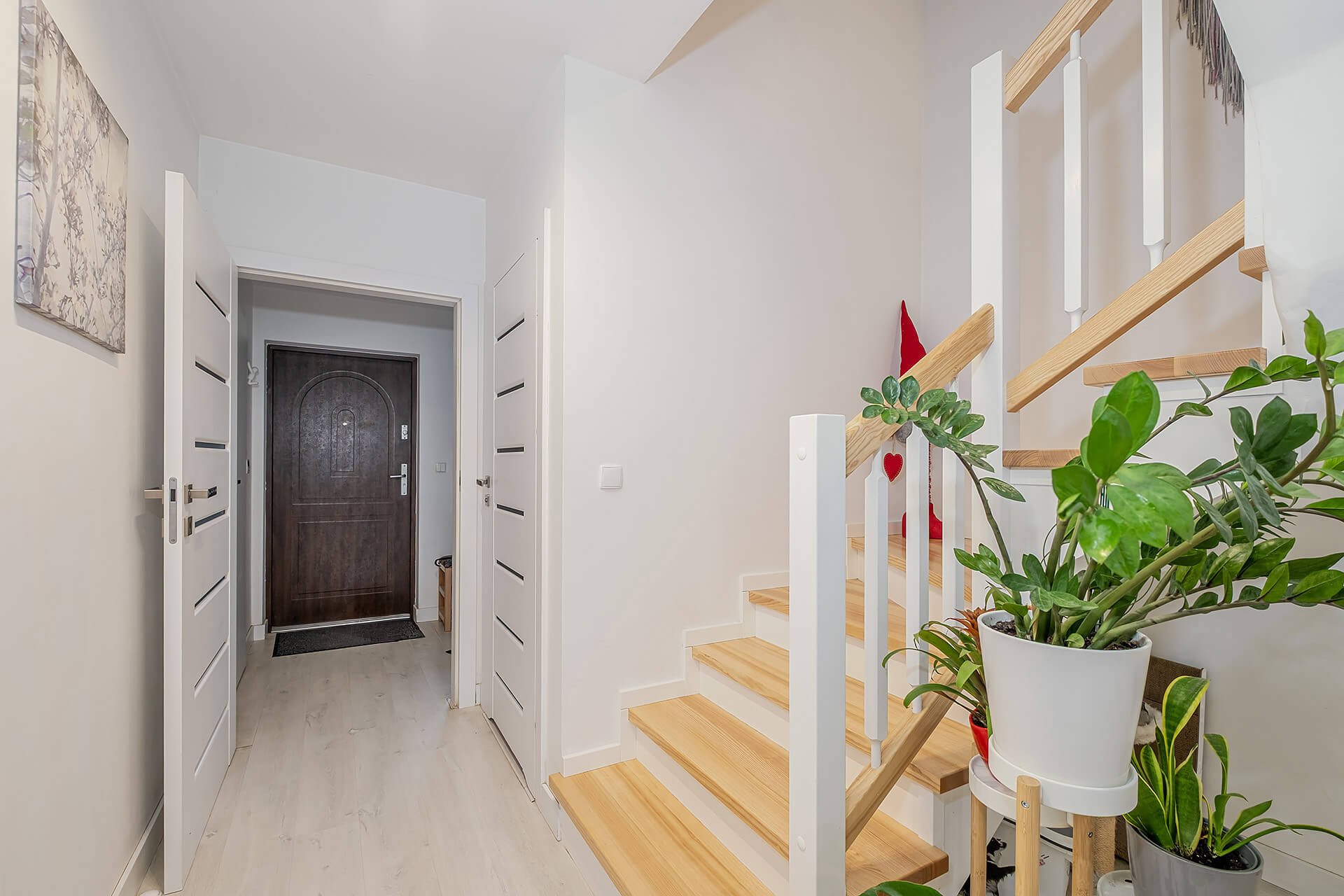 Na parterze jest salon + aneks kuchenny z wyjściem na ogród. Przy wejściu znajduję się mały przedsionek oraz WC. Na piętrze są 3 sypialnie (oryginalnie były 4) i przestrzenna łazienka. Duża sypialnia ma wyjście na balkon. W przedpokoju znajduję się wejście na poddasze.