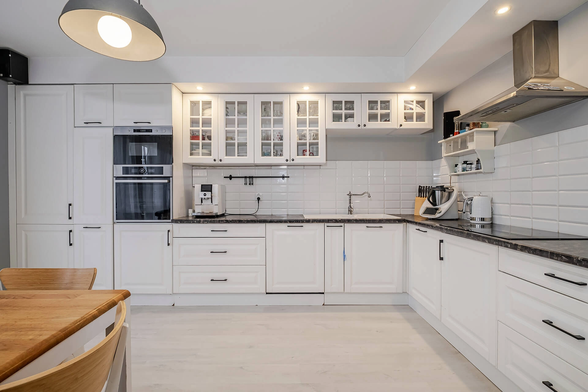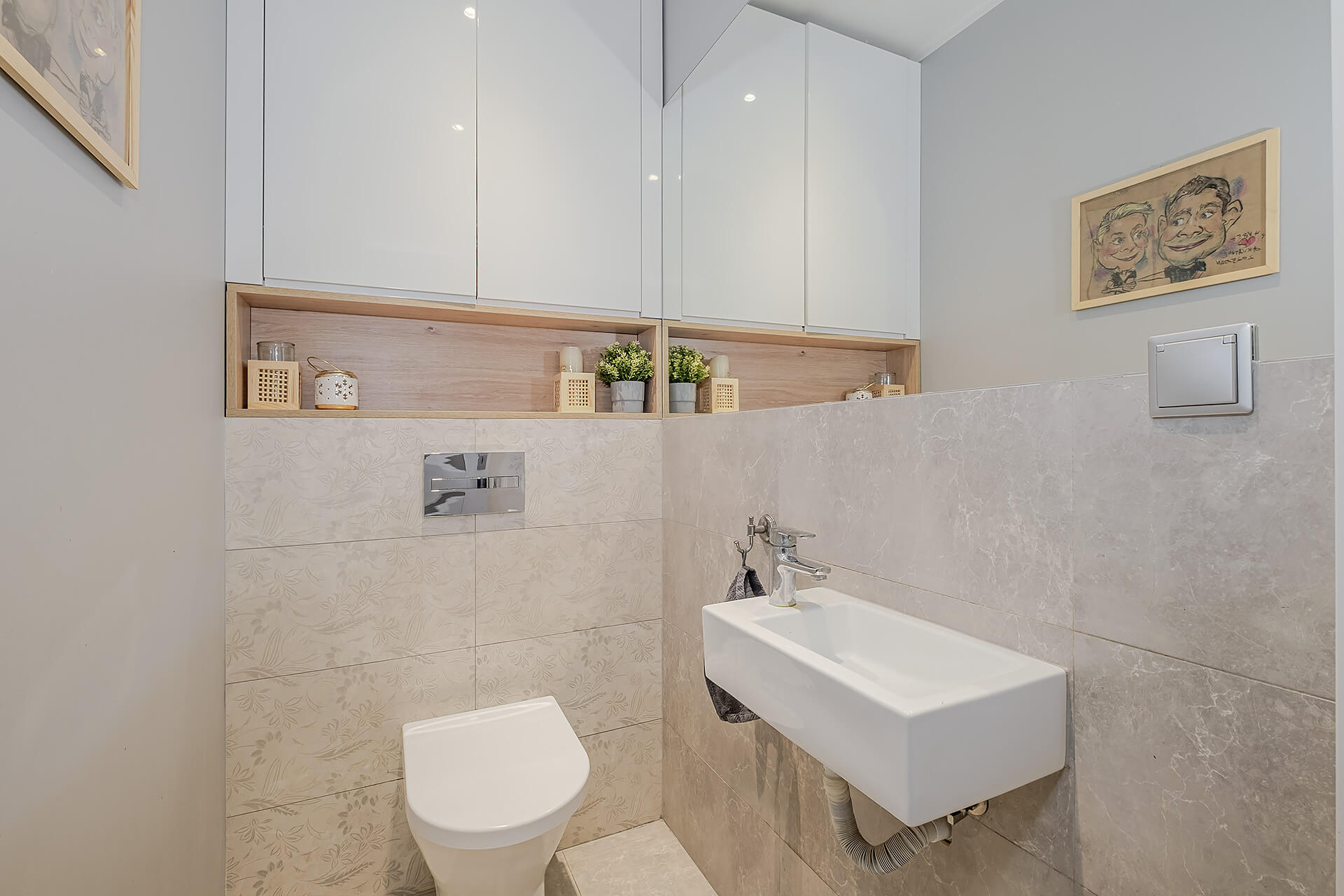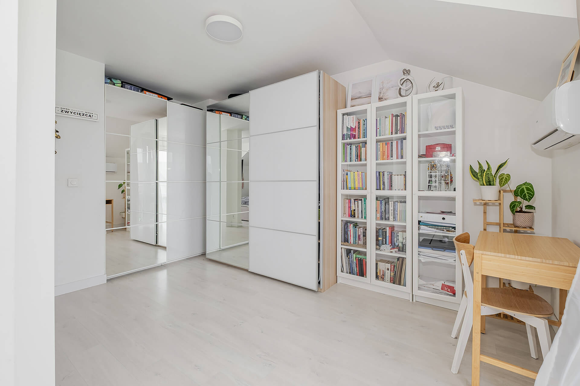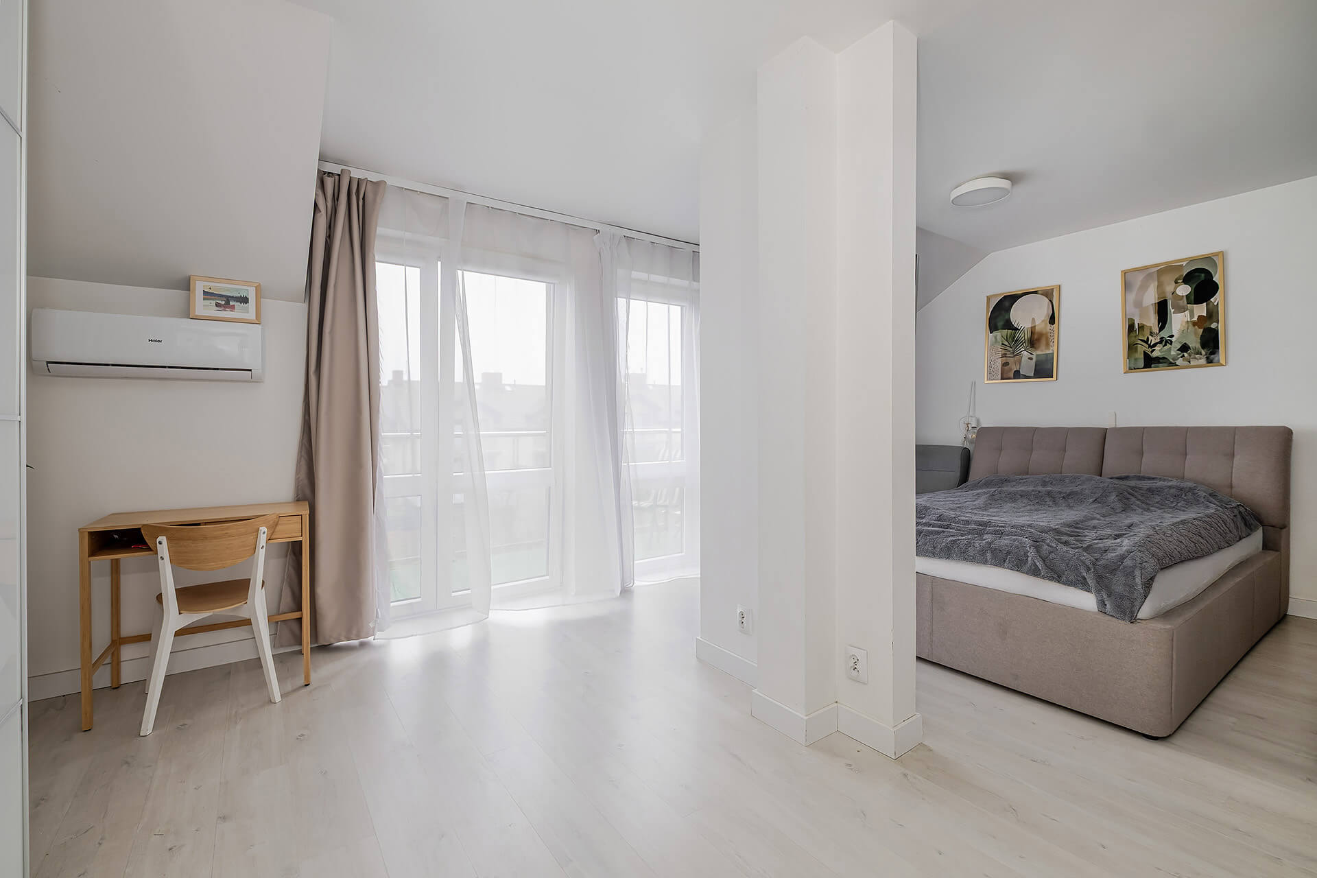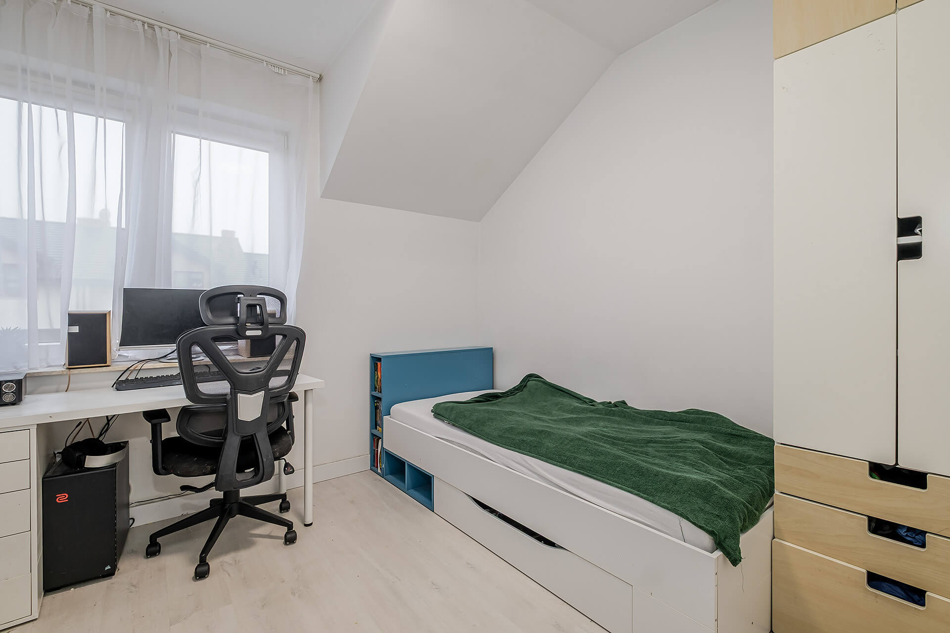 Na parterze jest salon + aneks kuchenny z wyjściem na ogród. Przy wejściu znajduję się mały przedsionek oraz WC. Na piętrze są 3 sypialnie (oryginalnie były 4) i przestrzenna łazienka. Duża sypialnia ma wyjście na balkon. W przedpokoju znajduję się wejście na poddasze.