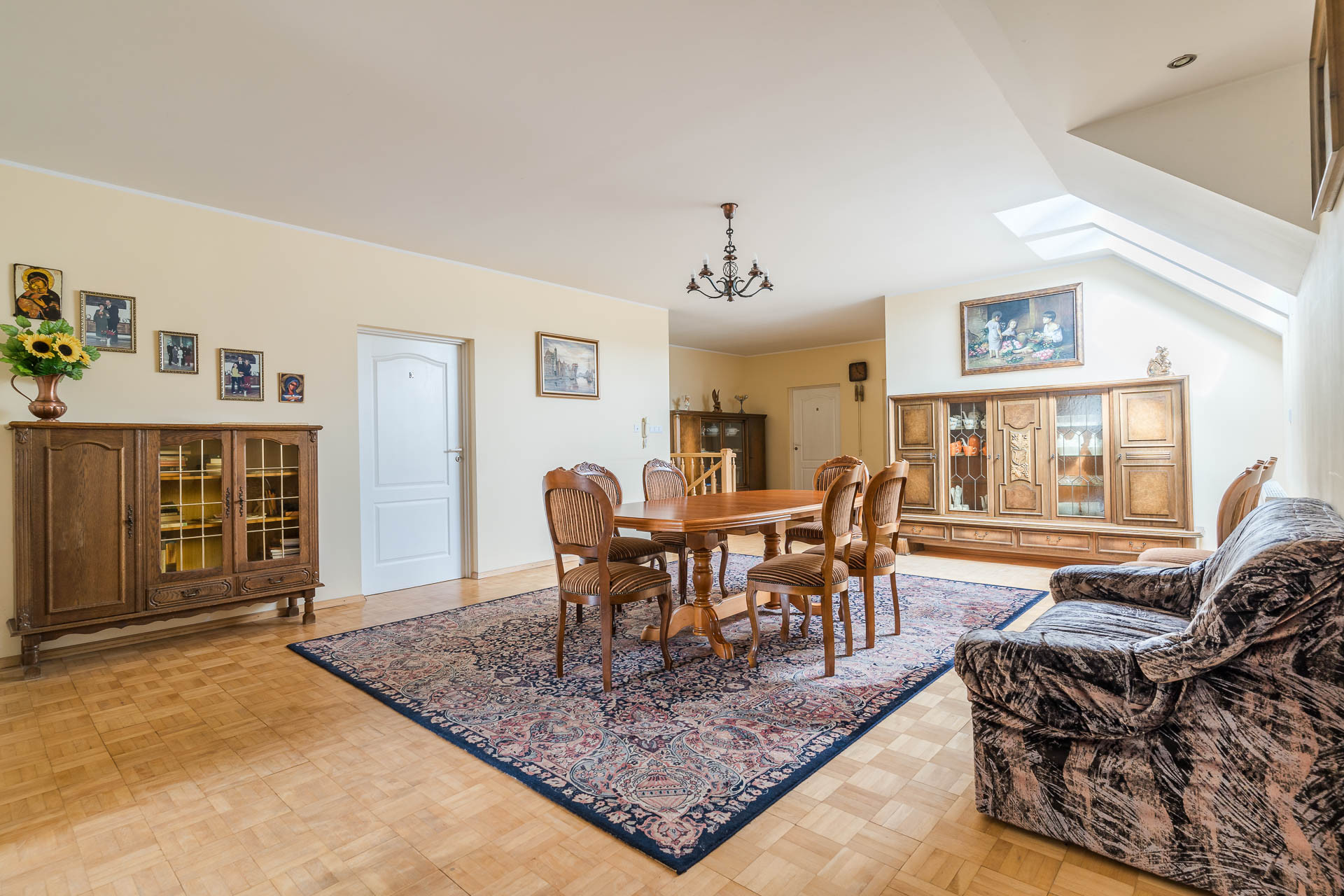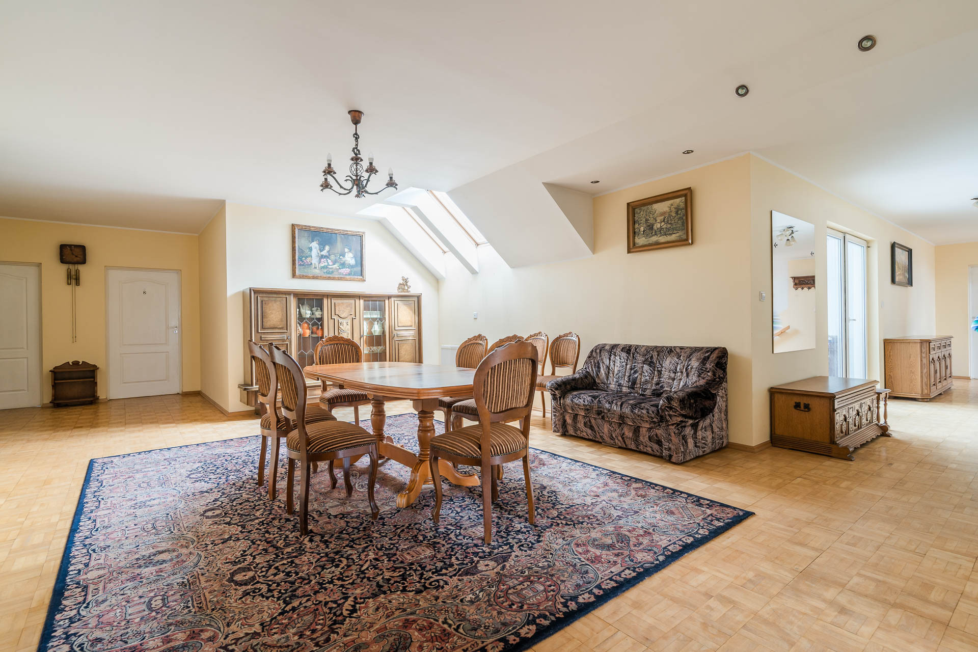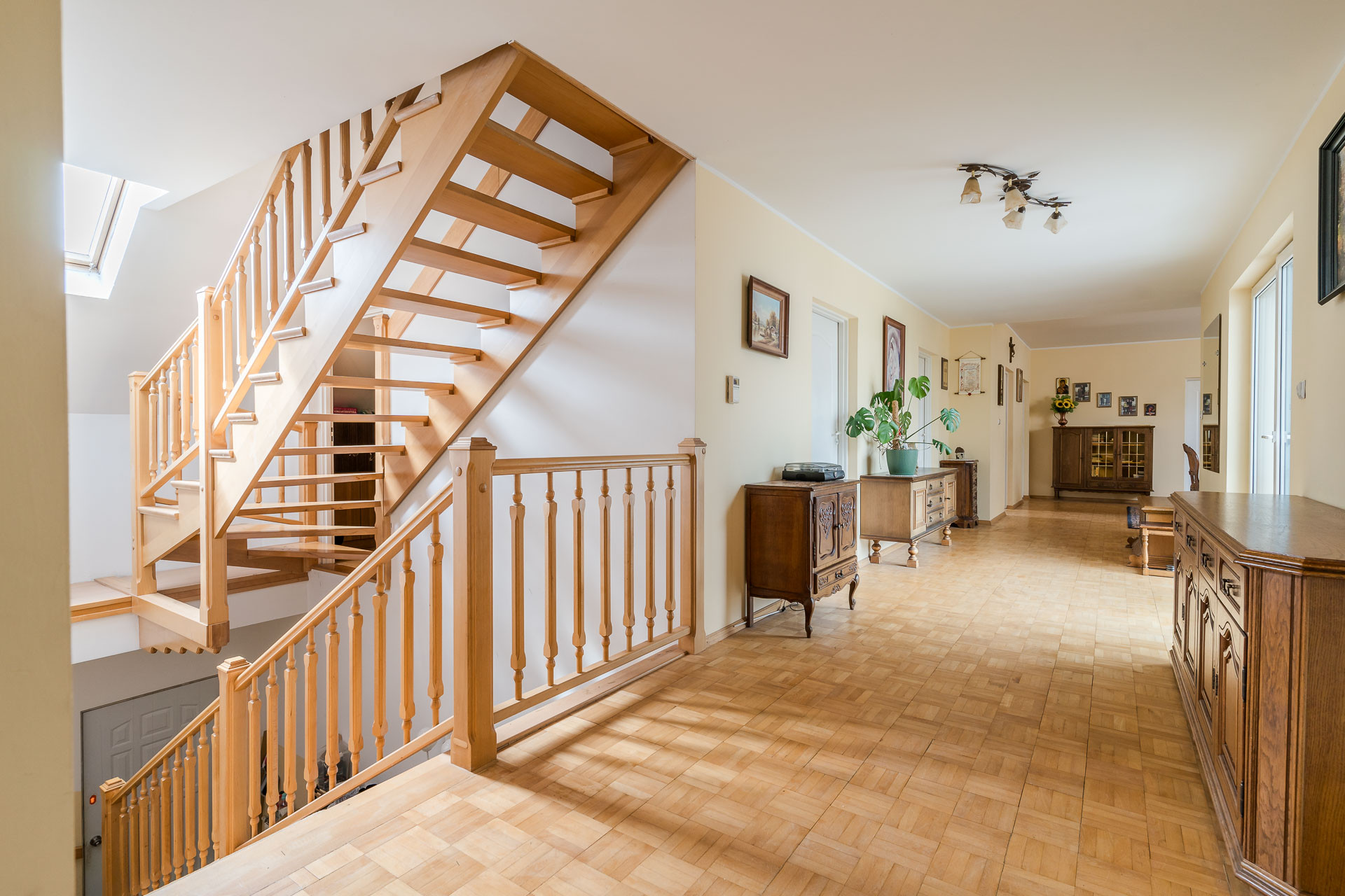 Na kolejnej kondygnacji jest strych, który jest otwartą przestrzenią na całej długości dachu – zdjęcie ukazuje tylko 1/3 powierzchni. Aktualnie prowadzą do niego jedne schody ale jest możliwość zrobienia drugich od strony głównego hallu domu.