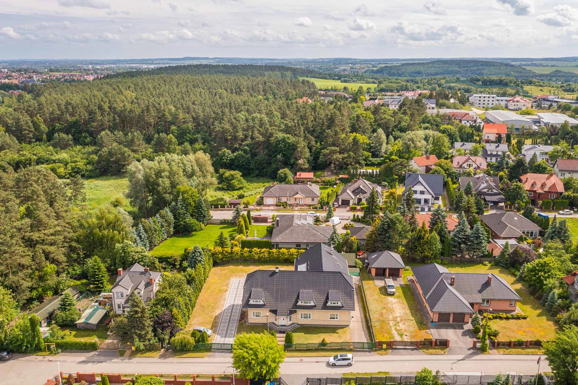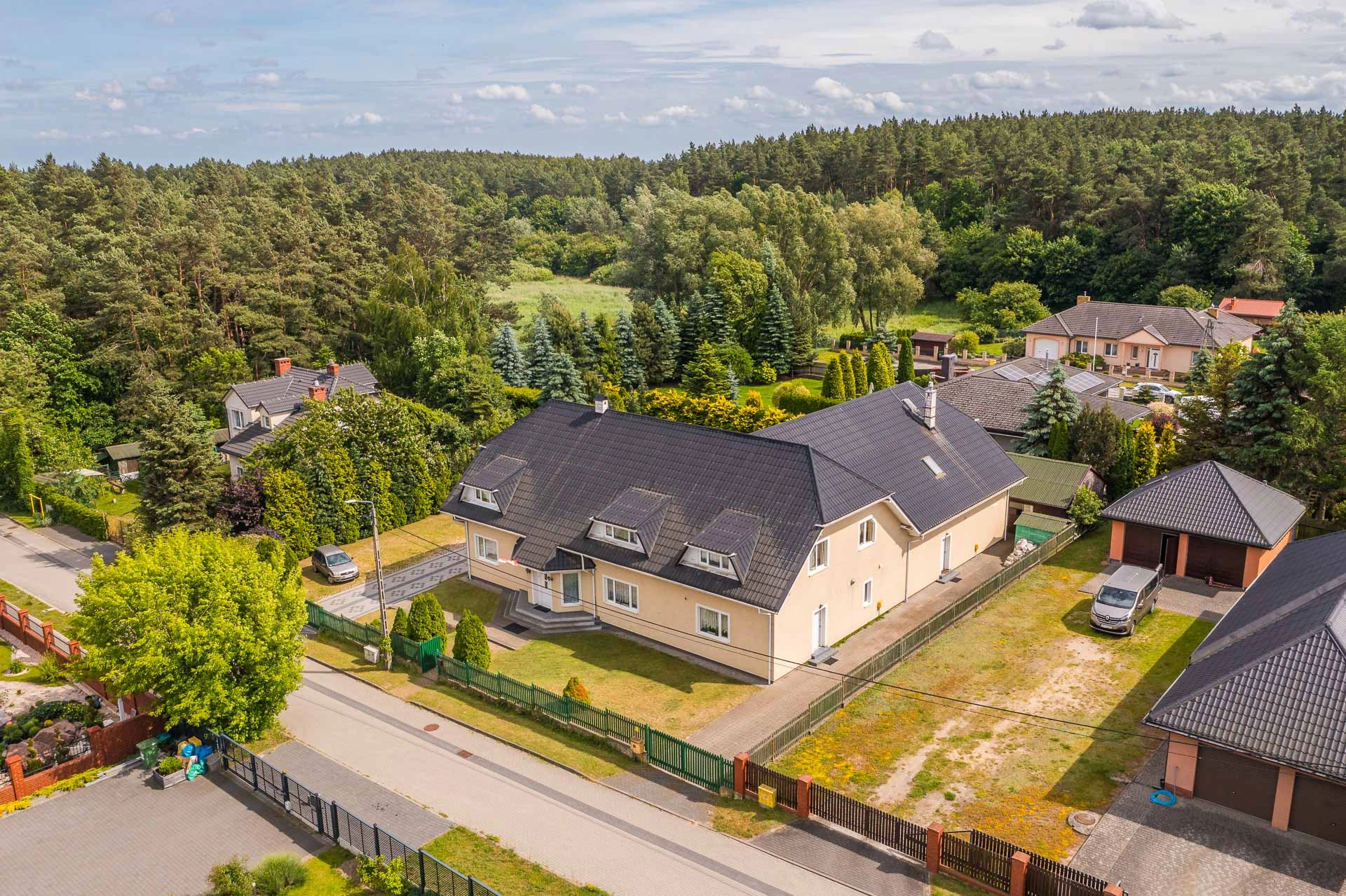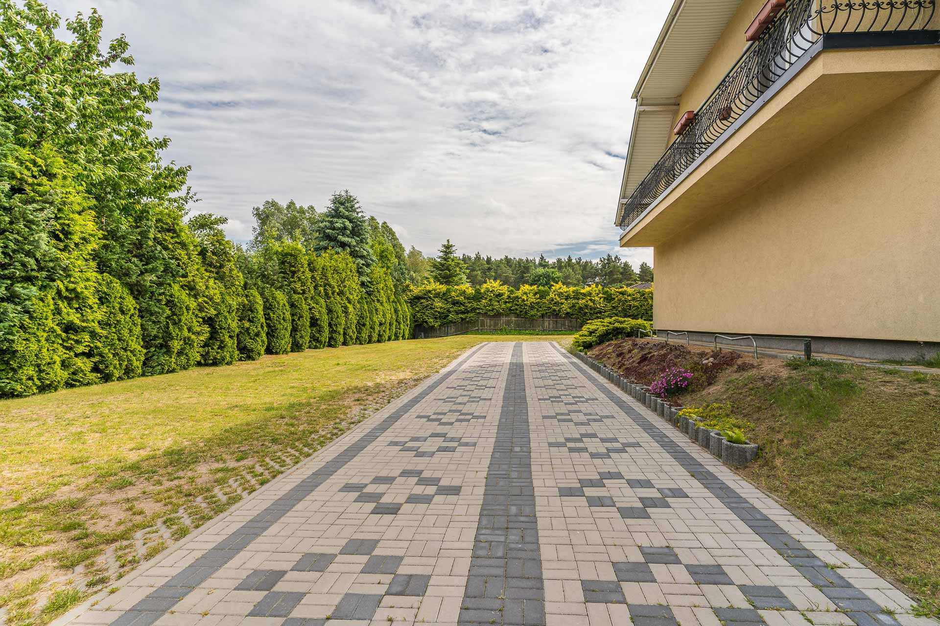 Działka jest płaska i ma wymiary 40m x 40m. Za domem znajduję się dodatkowy garaż na dwa mniejsze auta.