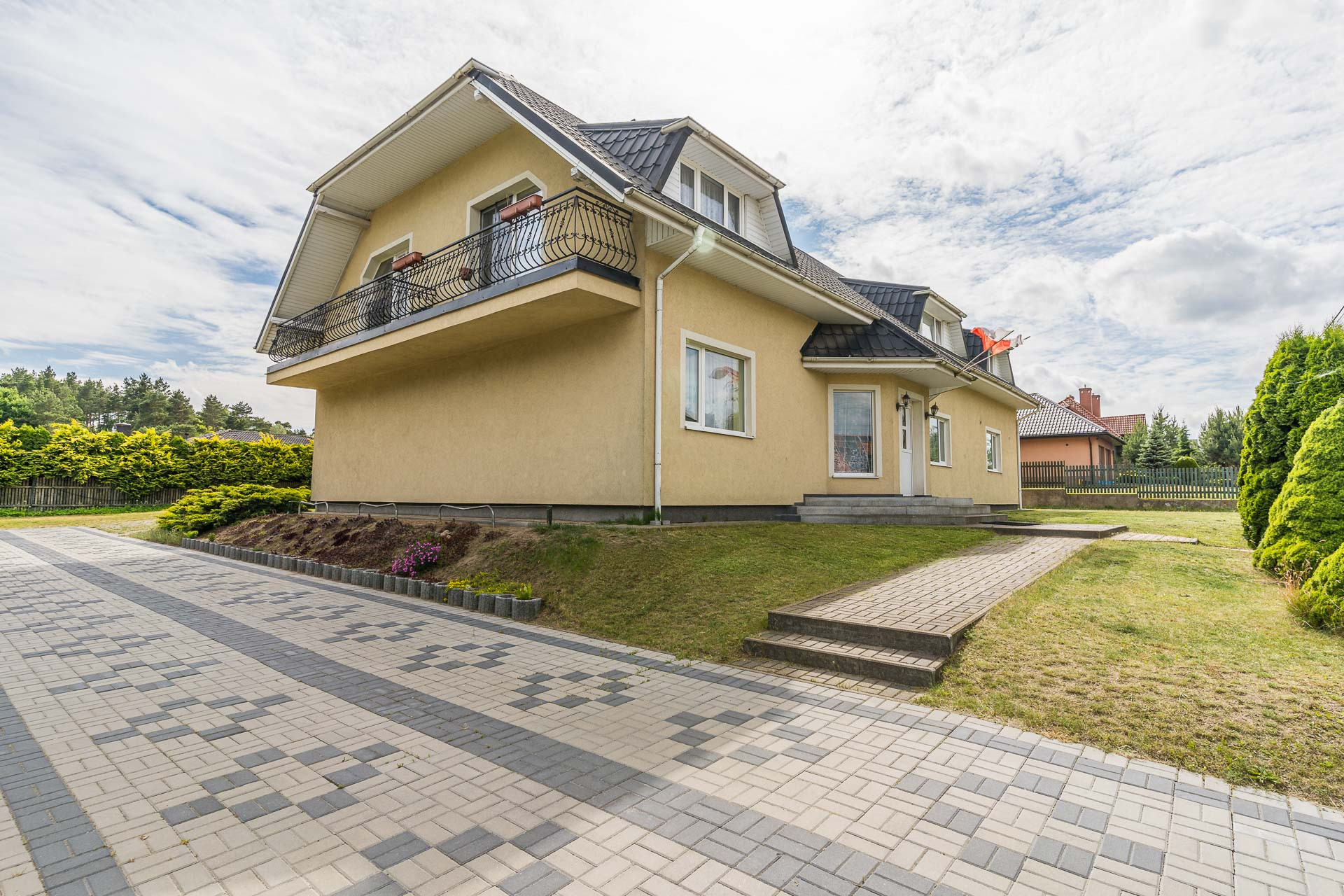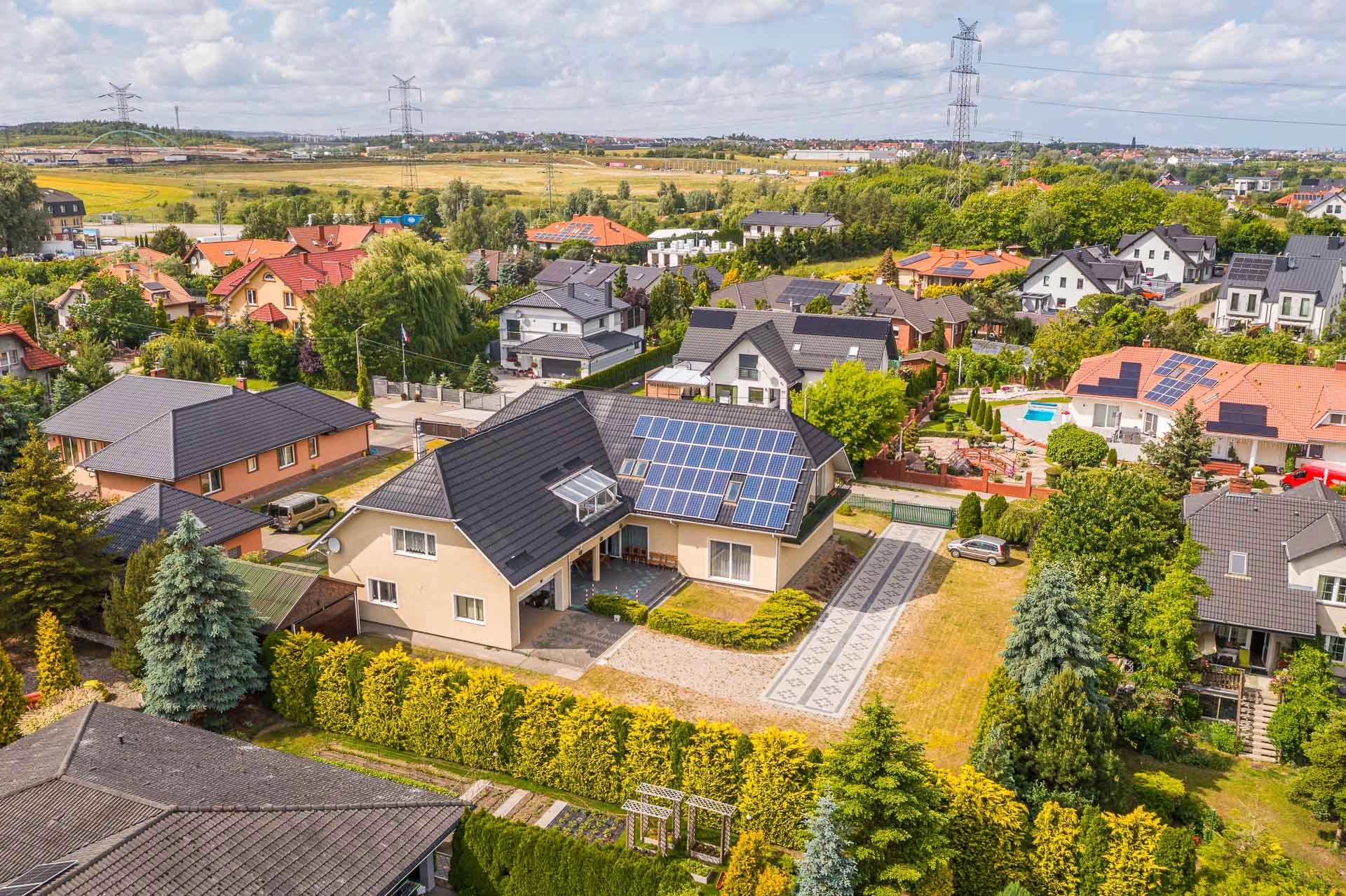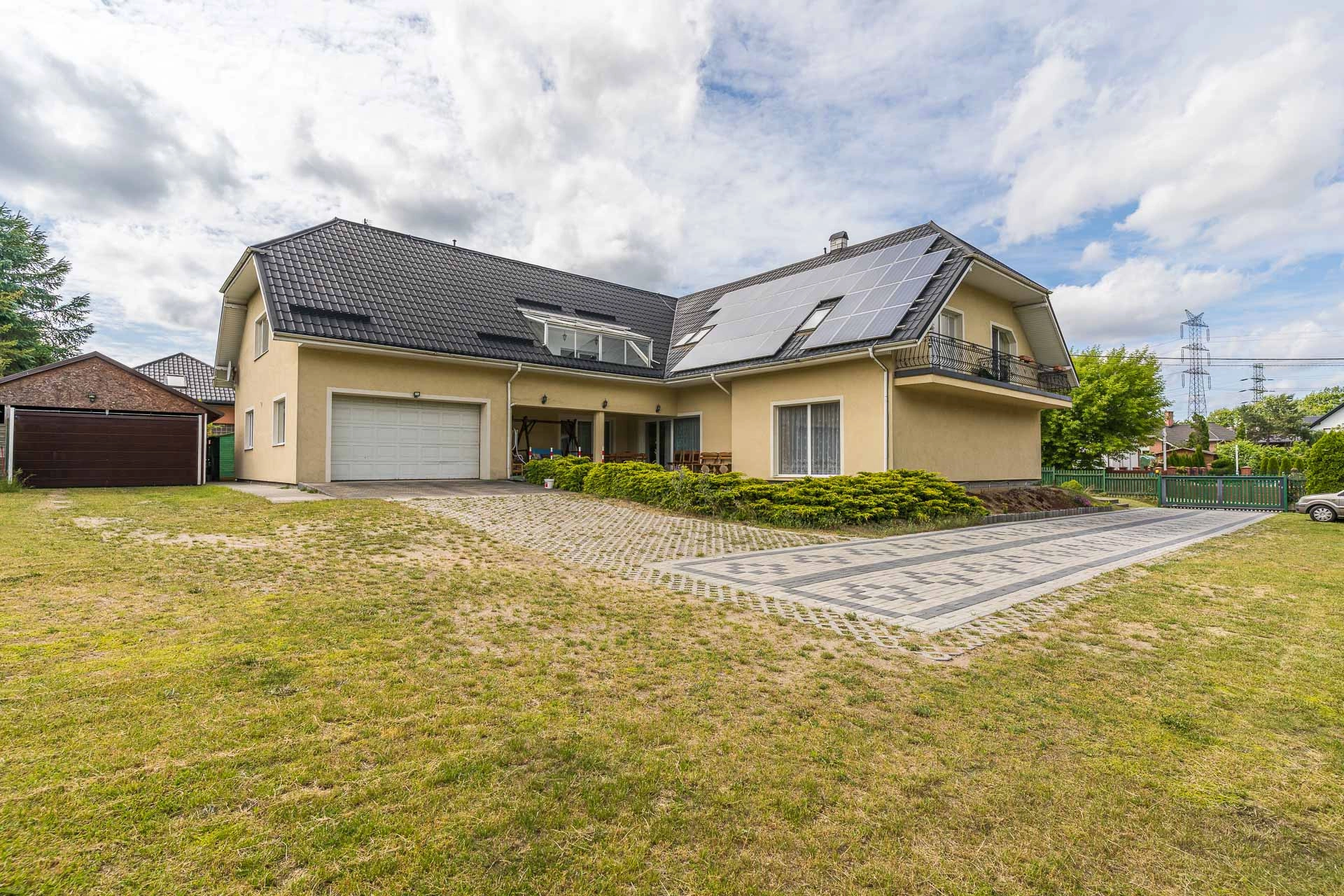Działka jest płaska i ma wymiary 40m x 40m. Za domem znajduję się dodatkowy garaż na dwa mniejsze auta.
