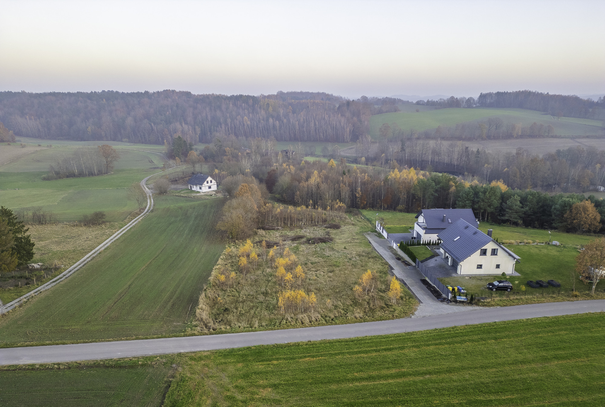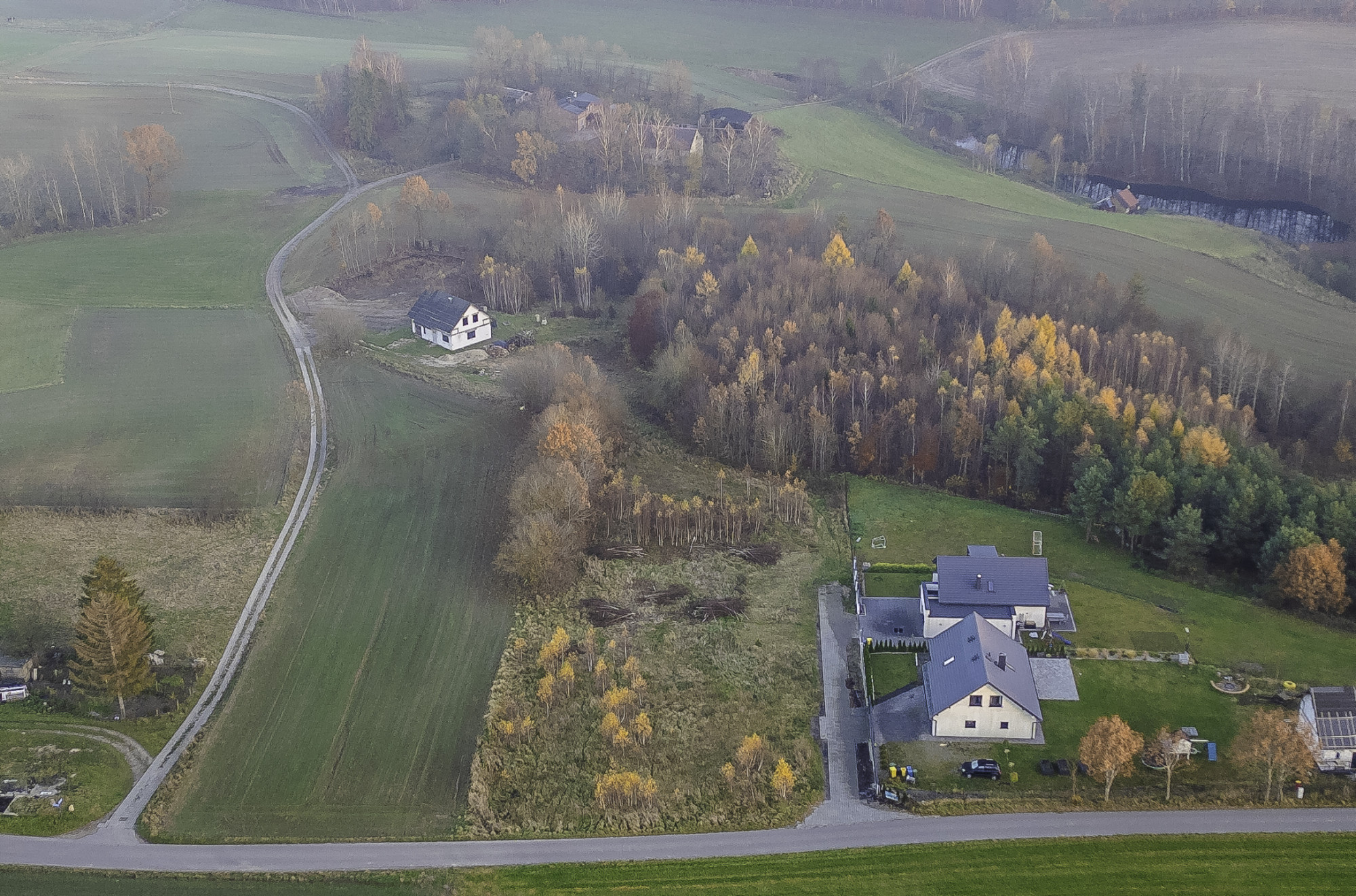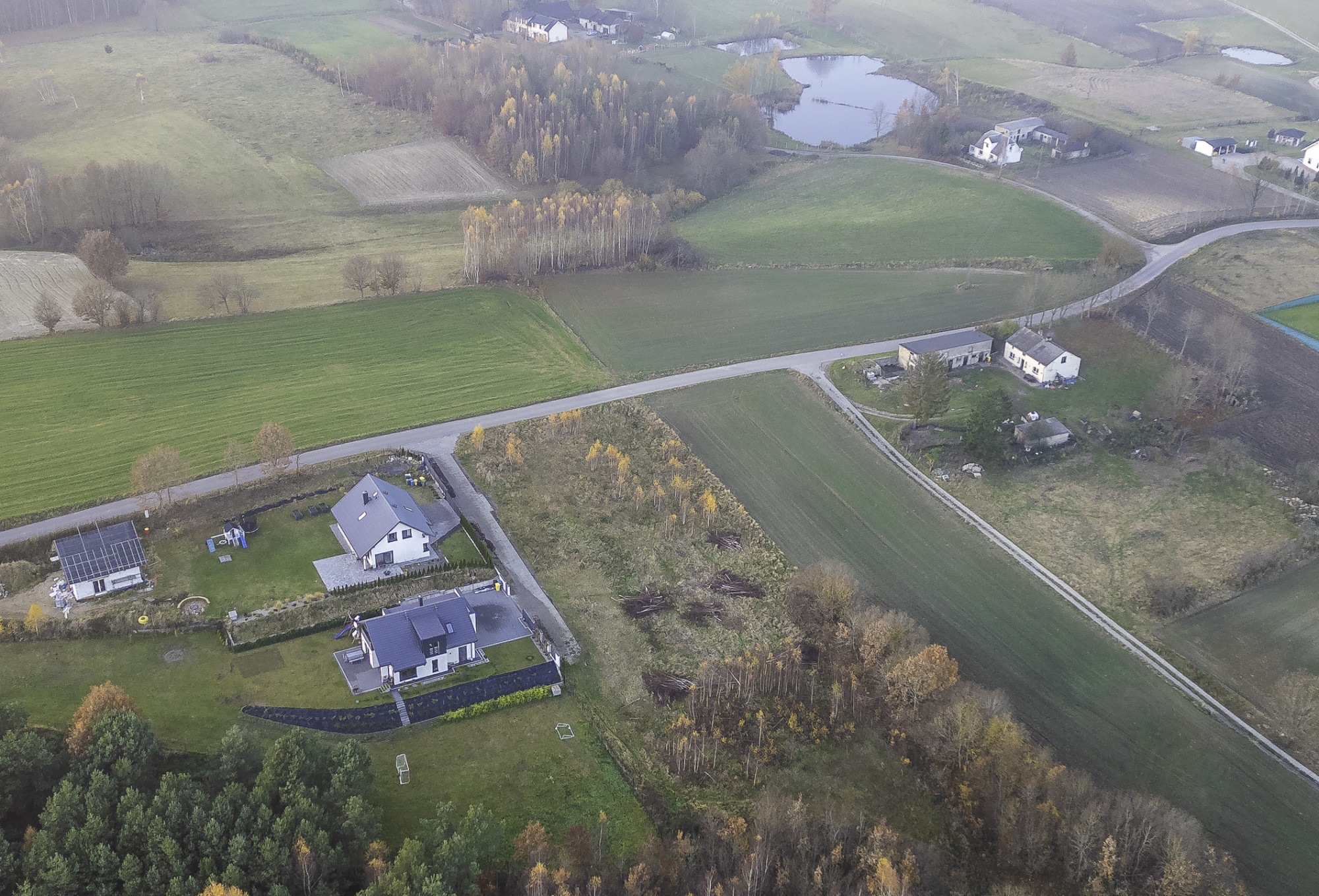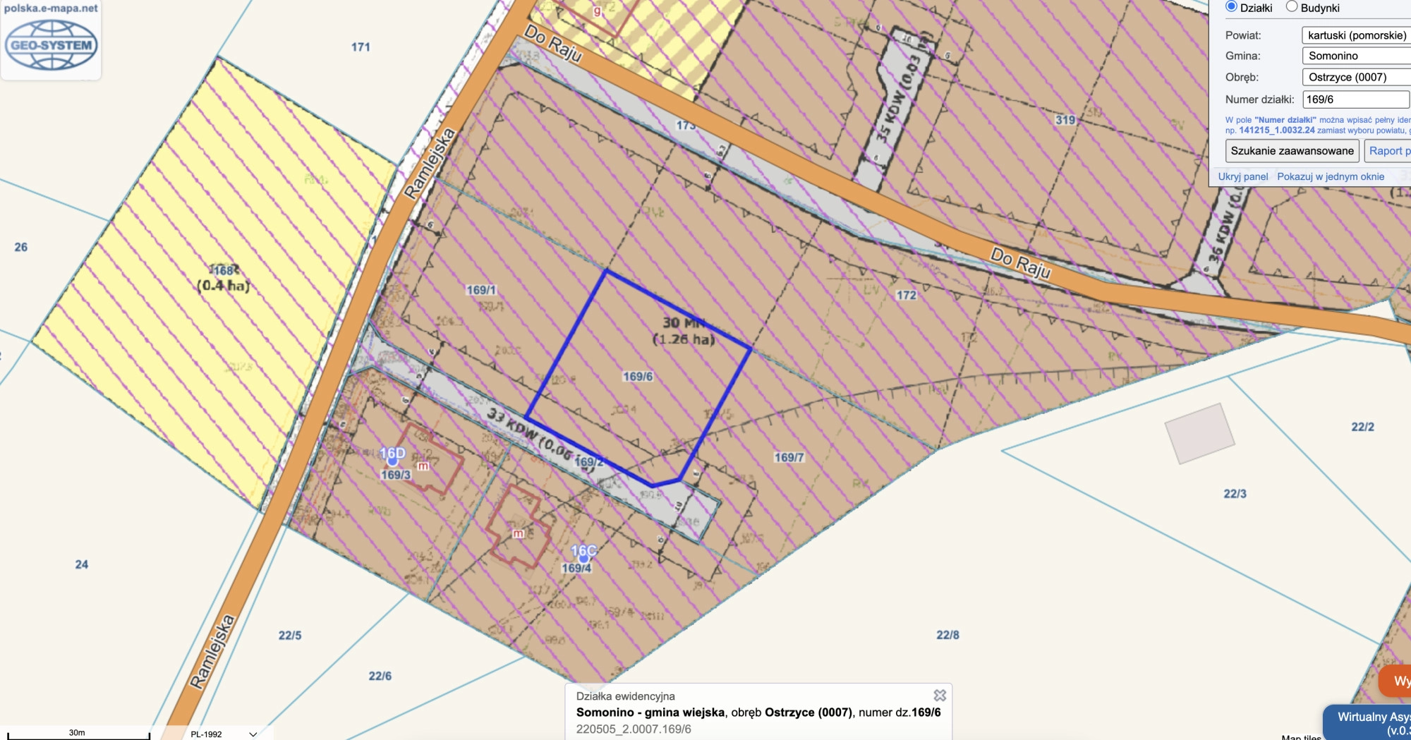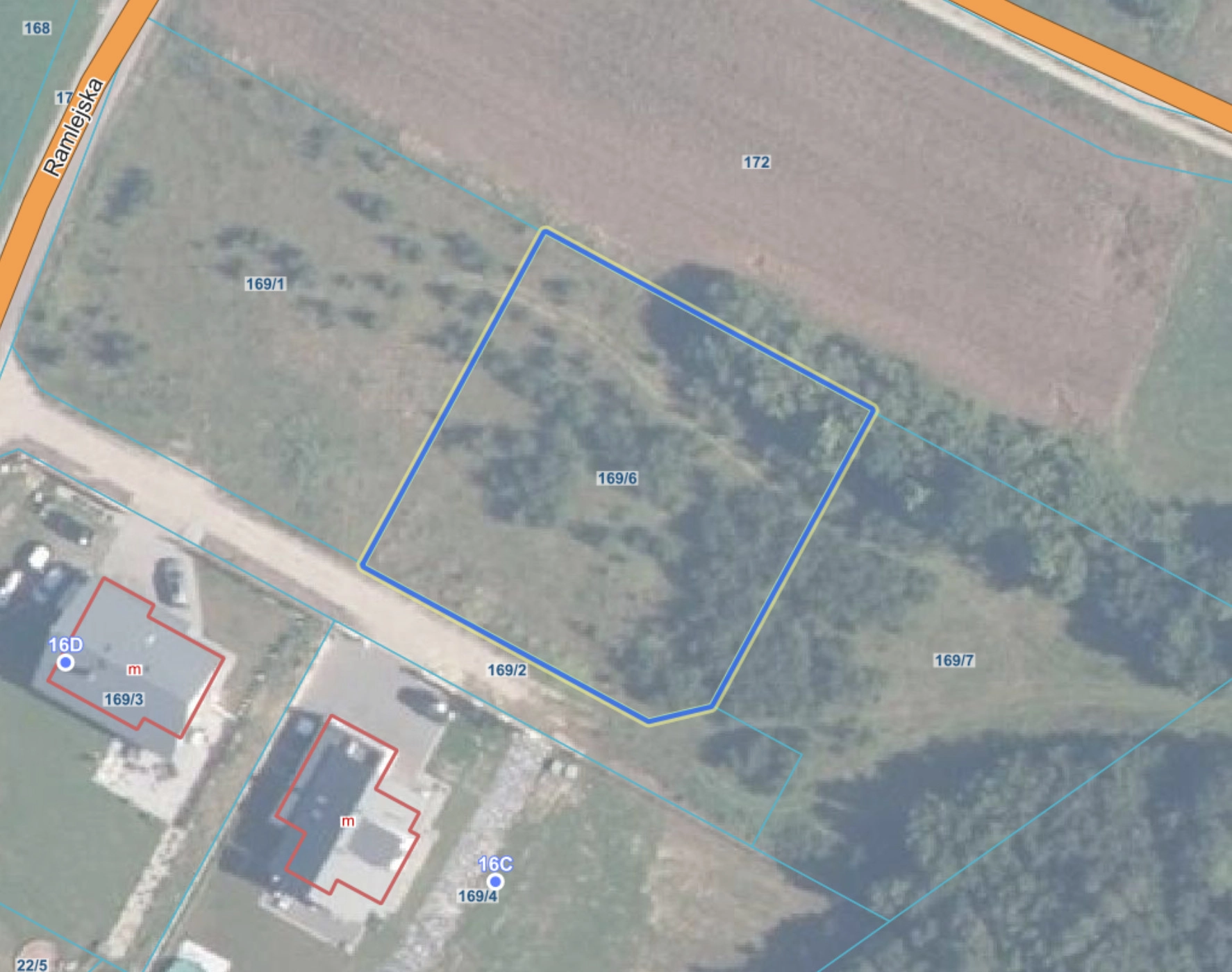 Działka o powierzchni 1267 m², w kształcie zbliżonym do kwadratu, o lekko nachylonym terenie. Dojazd do nieruchomości prowadzi utwardzoną drogą z płyt betonowych (ok. 100 m drogi prywatnej), która łączy się z gminną, asfaltową ulicą Ramlejską. W drodze dostępne media: prąd i woda.