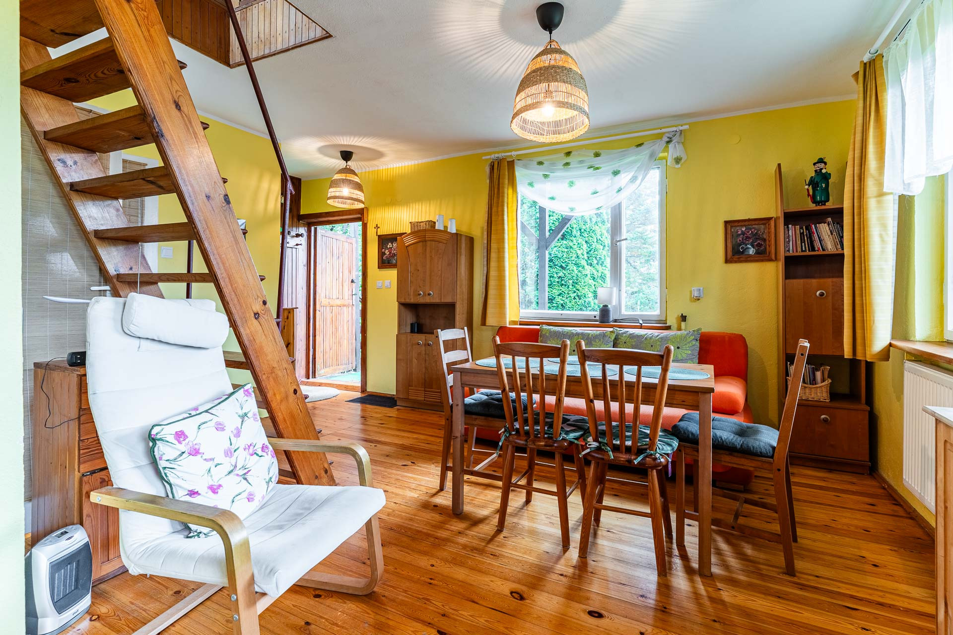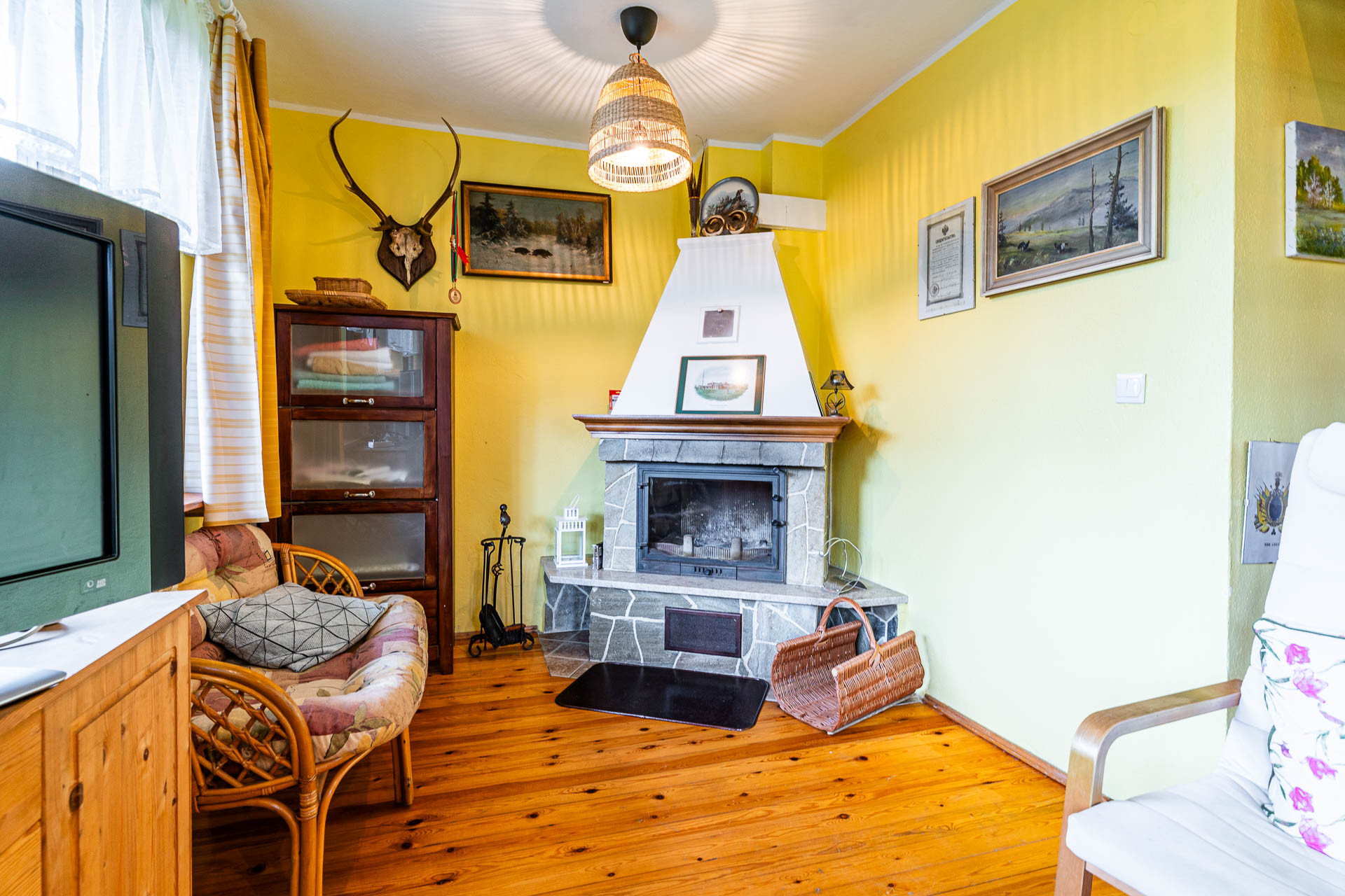 -jasny salon z kominkiem i wyjściem na słoneczny taras,