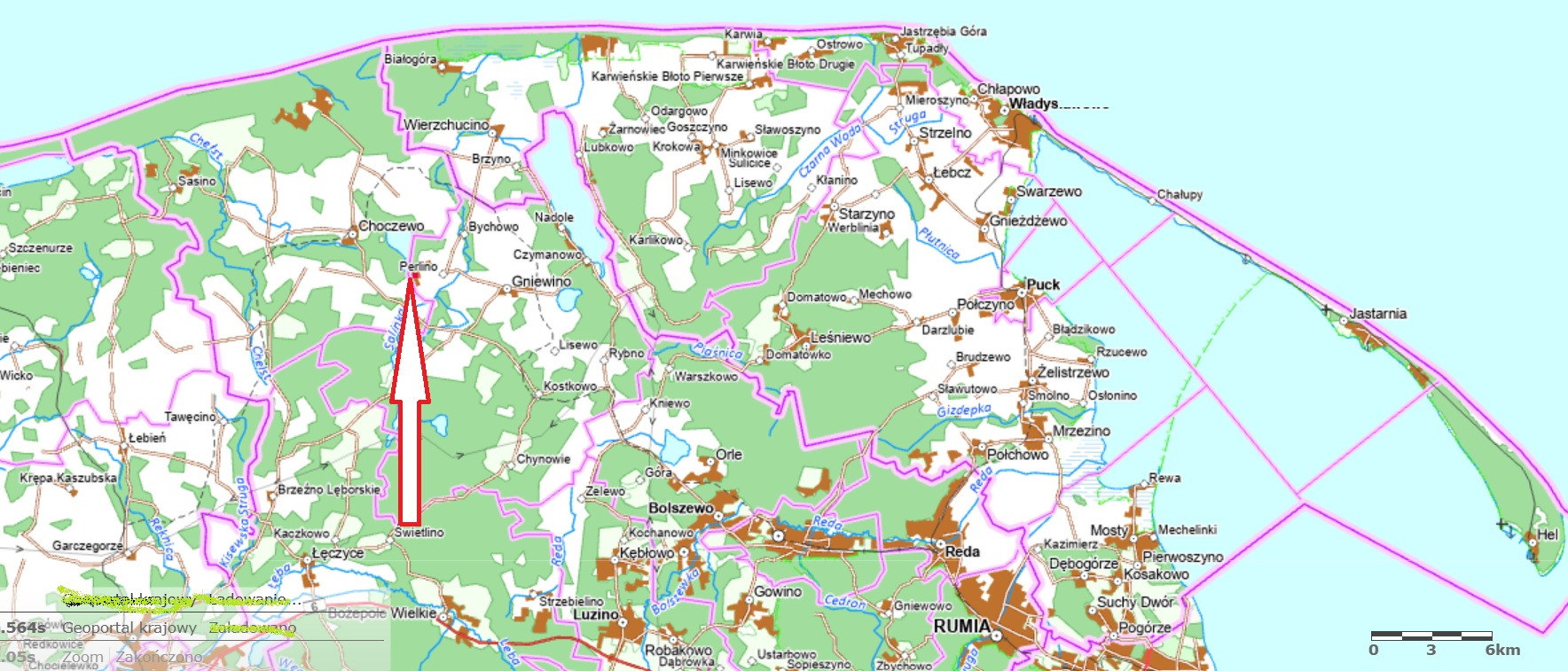Działka położona jest w kameralnej i spokojnej kaszubskiej wsi- Perlino, w powiecie wejherowskim, w gminie Gniewino. W okolicy znajdują się głównie domki letniskowe. Miejsce to ma wiele atutów- lasy, tereny zielone, kontakt z naturą, bliskość Jeziora Choczewskiego, do którego przez las spacerkiem można dojść w kilka minut; do morza około 12 kilometrów, a do Jeziora Żarnowieckiego- 10 kilometrów. Perlino zlokalizowane jest w odległości 3,2 km od znanej wsi Gniewino, 26 km od popularnego turystycznego kurortu Łeba i 22 km od Wejherowa.
