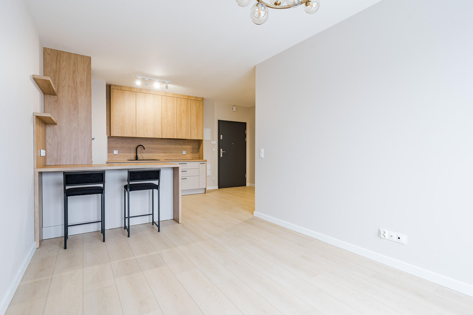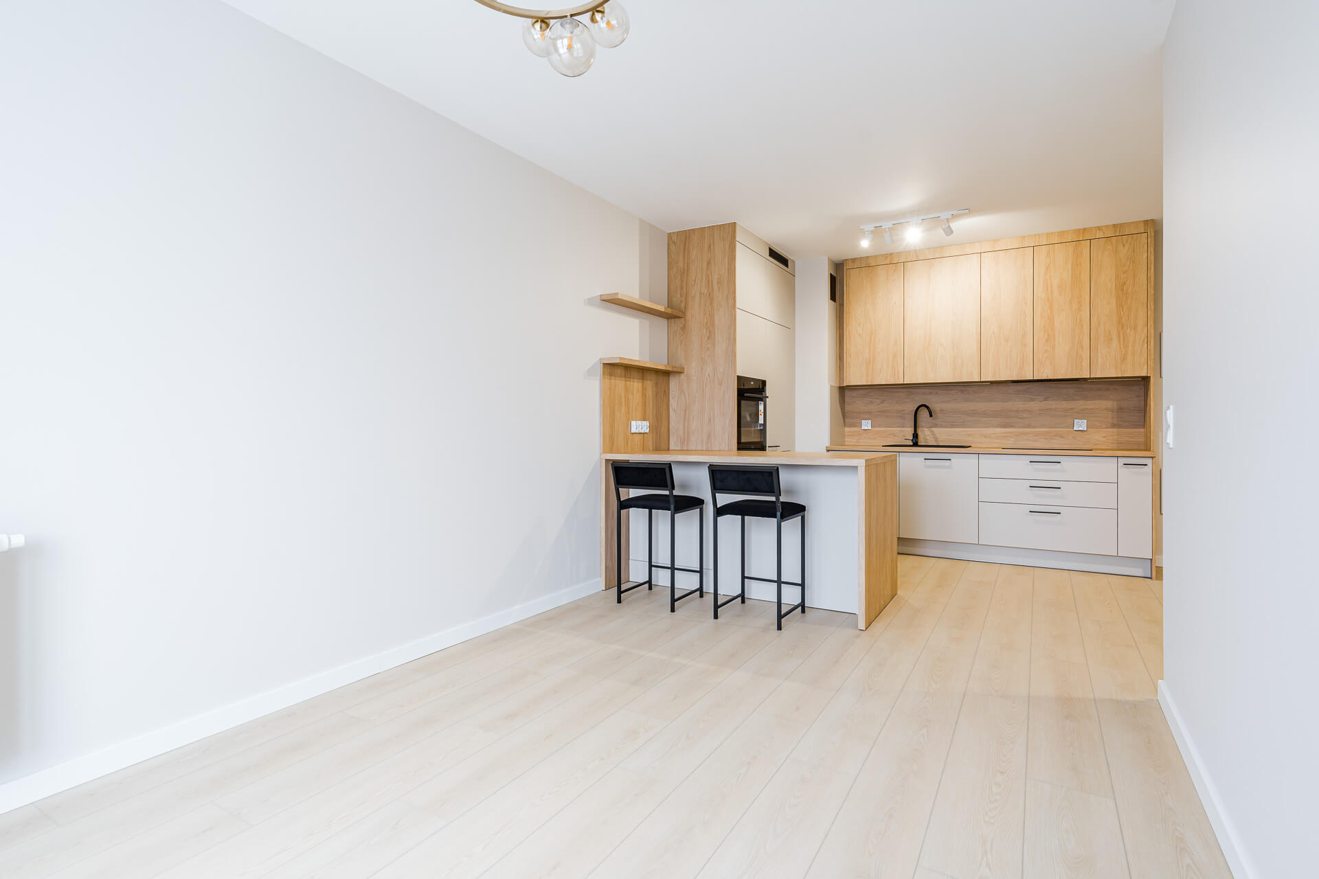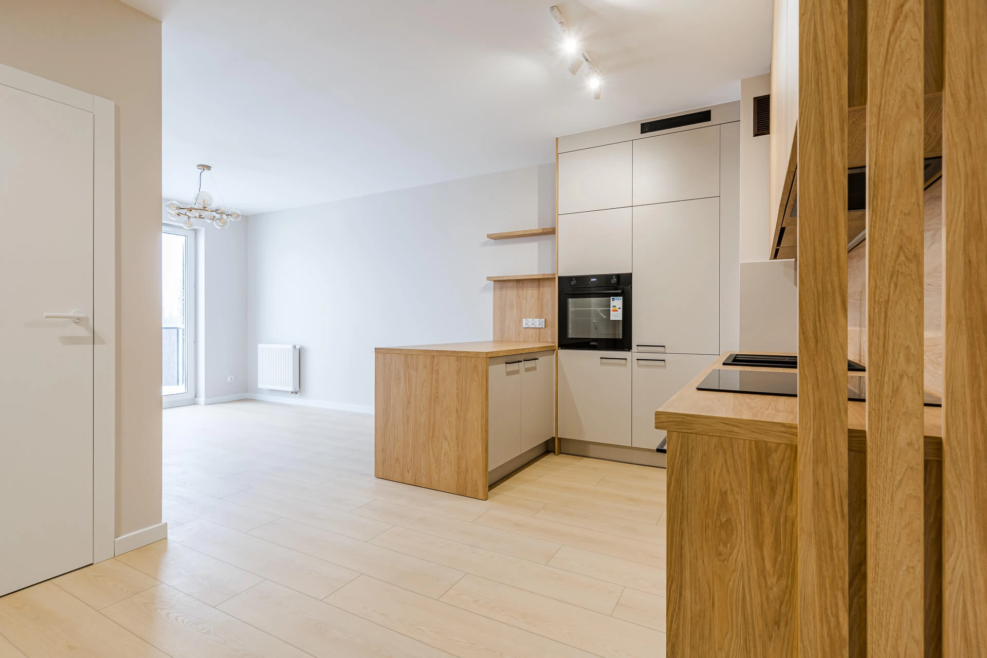 W całym mieszkaniu położone zostaną panele podłogowe, a ściany pomalowane są w jasnych, ponadczasowych kolorach, które stanowią doskonałą bazę do dalszej aranżacji wnętrza. Kuchnia wykonana na wymiar przez doświadczonego stolarza i wyposażona w kompletny sprzęt AGD, co zapewni komfort codziennego użytkowania. Dodatkowo w mieszkaniu znajduje się duża, pojemna szafa w zabudowie, również wykonana na zamówienie, idealnie wpisująca się w nowoczesny charakter wnętrza.