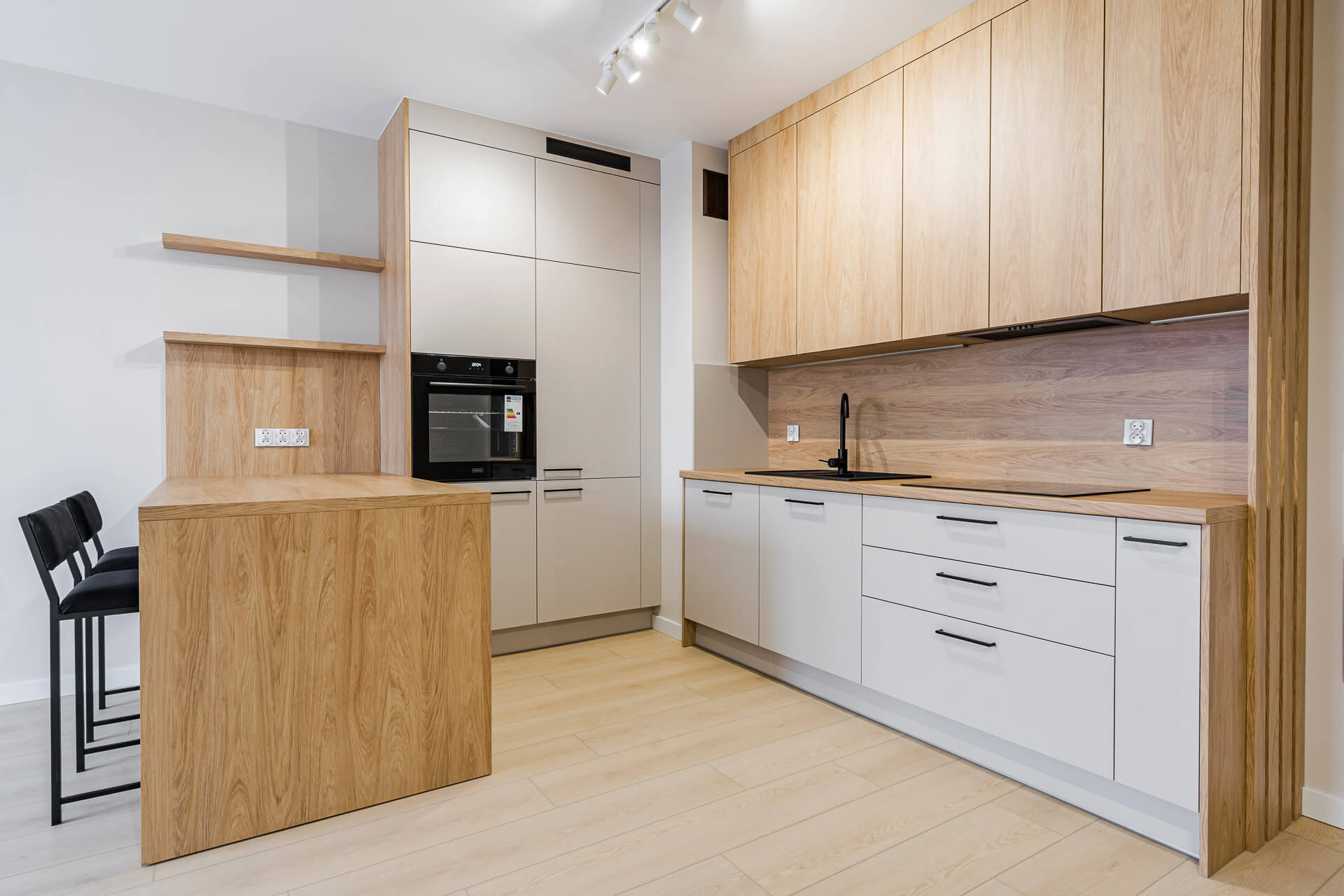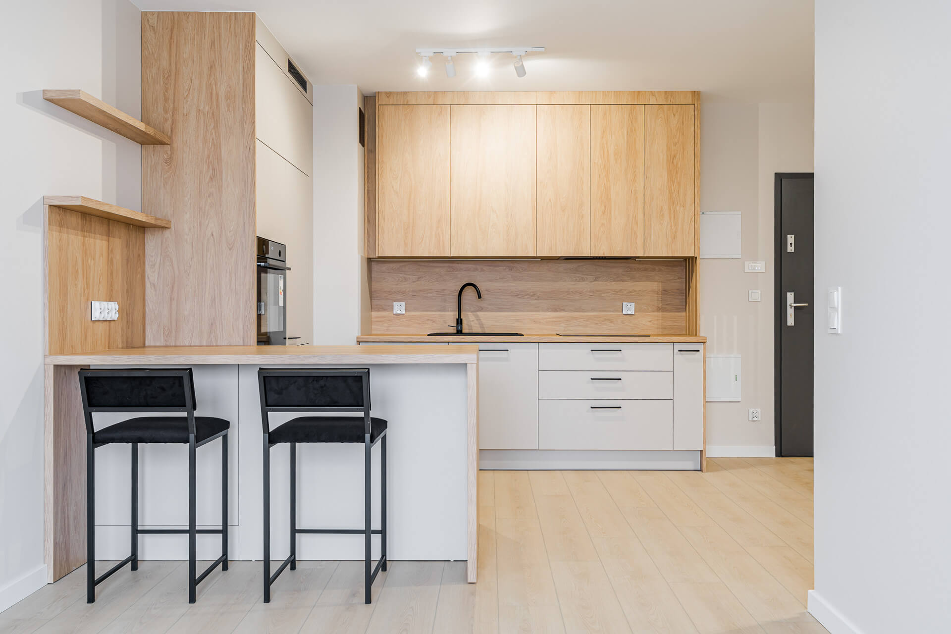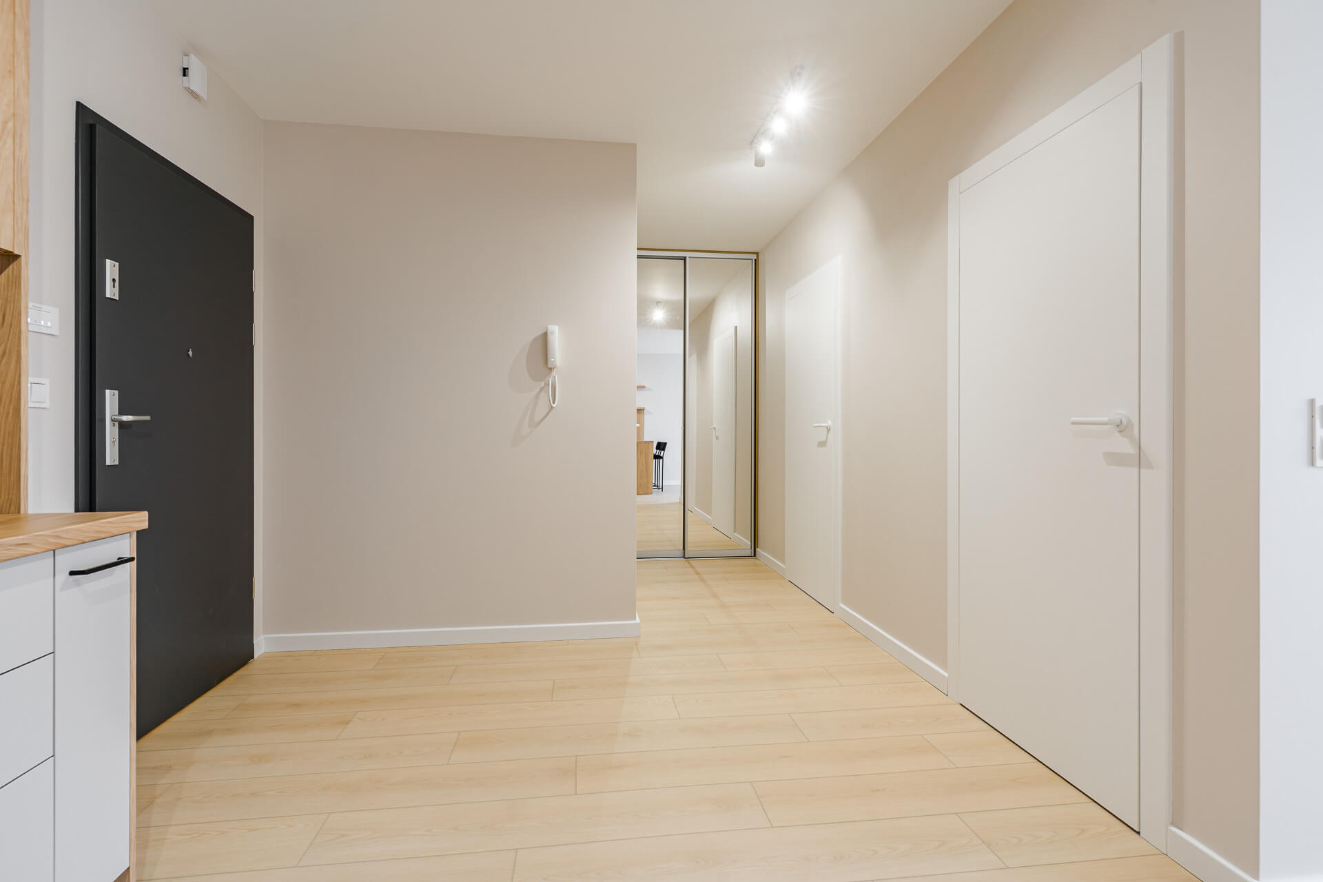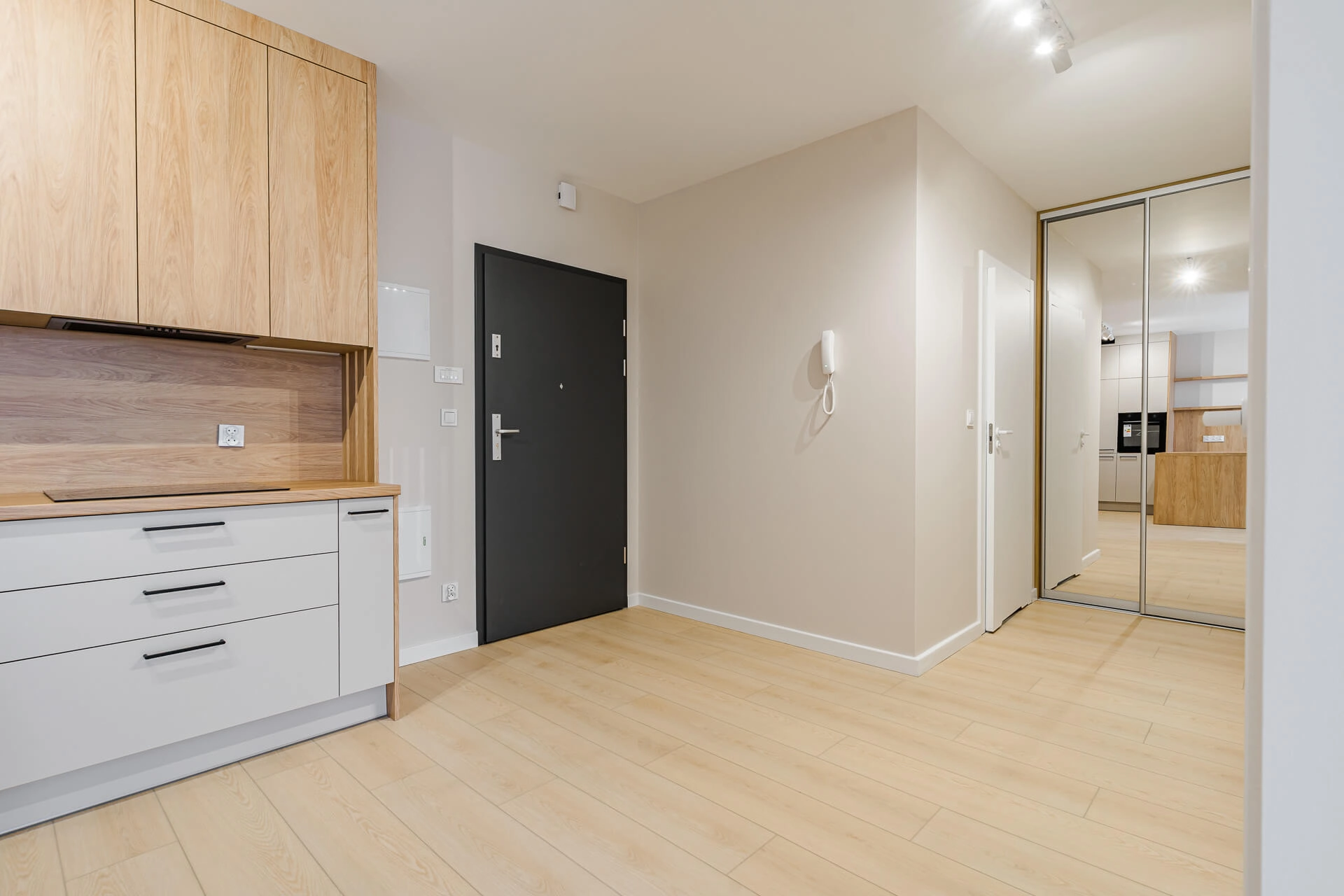 W całym mieszkaniu położone zostaną panele podłogowe, a ściany pomalowane są w jasnych, ponadczasowych kolorach, które stanowią doskonałą bazę do dalszej aranżacji wnętrza. Kuchnia wykonana na wymiar przez doświadczonego stolarza i wyposażona w kompletny sprzęt AGD, co zapewni komfort codziennego użytkowania. Dodatkowo w mieszkaniu znajduje się duża, pojemna szafa w zabudowie, również wykonana na zamówienie, idealnie wpisująca się w nowoczesny charakter wnętrza.