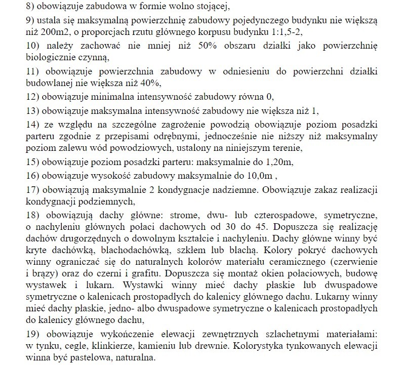 teren przeznacza się pod zabudowę usługową z dopuszczeniem wbudowanej zabudowy mieszkaniowej jednorodzinnej (U/MN). Warunkiem wprowadzenia zabudowy mieszkaniowej jednorodzinnej jest wcześniejsza lub równoległa realizacja zabudowy usługowej. Obowiązuje zakaz realizacji obiektów handlowych o powierzchni sprzedaży jednego obiektu powyżej 400m2. W ramach terenu dopuszcza się realizację wolnostojących budynków gospodarczych i garaży.