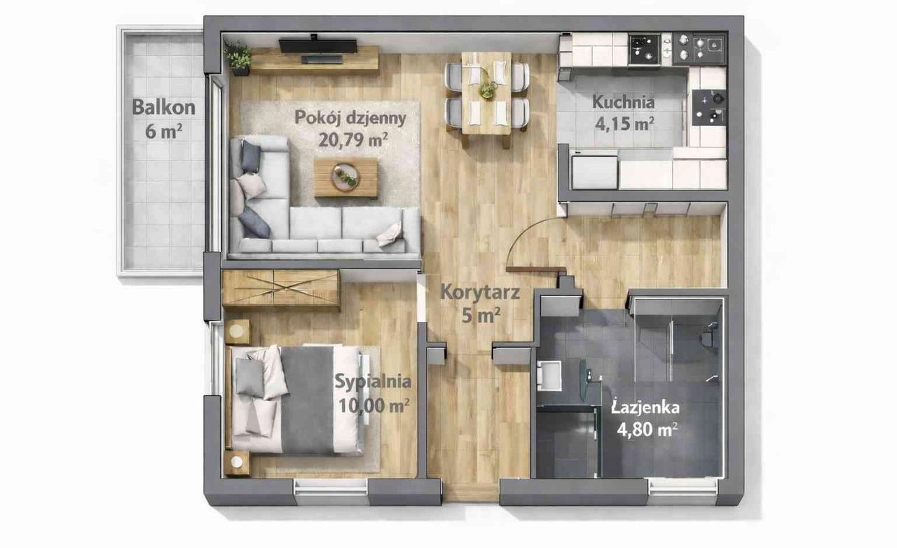 Lokal o powierzchni 44 m² znajduje się na 2 piętrze nowoczesnego budynku. Wyróżnia się funkcjonalnym i ustawnym układem pomieszczeń, który zapewnia wygodę codziennego użytkowania. W skład mieszkania wchodzi przestronny salon z aneksem kuchennym, komfortowa sypialnia, łazienka oraz korytarz z miejscem na zabudowę. Dodatkowym atutem jest duży balkon, który stanowi idealną przestrzeń do relaksu po pracy.