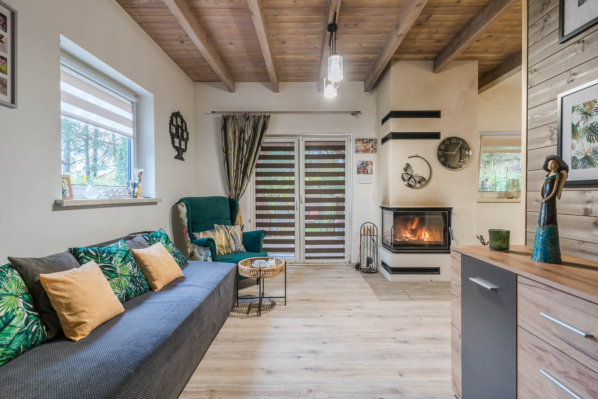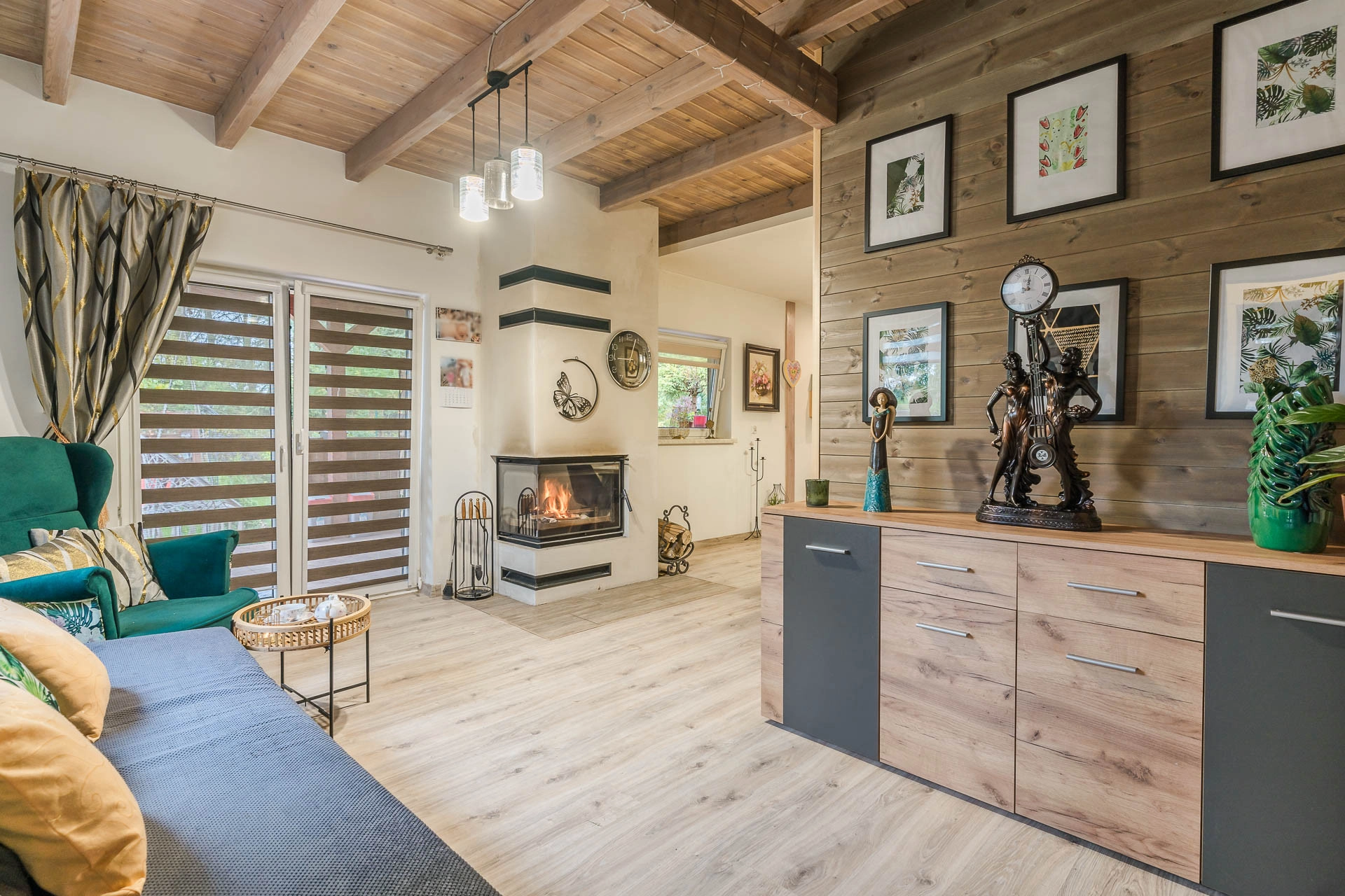 Wyjątkowego klimatu nadaje kominek z płaszczem wodnym, który jest w stanie ogrzać cały dom.