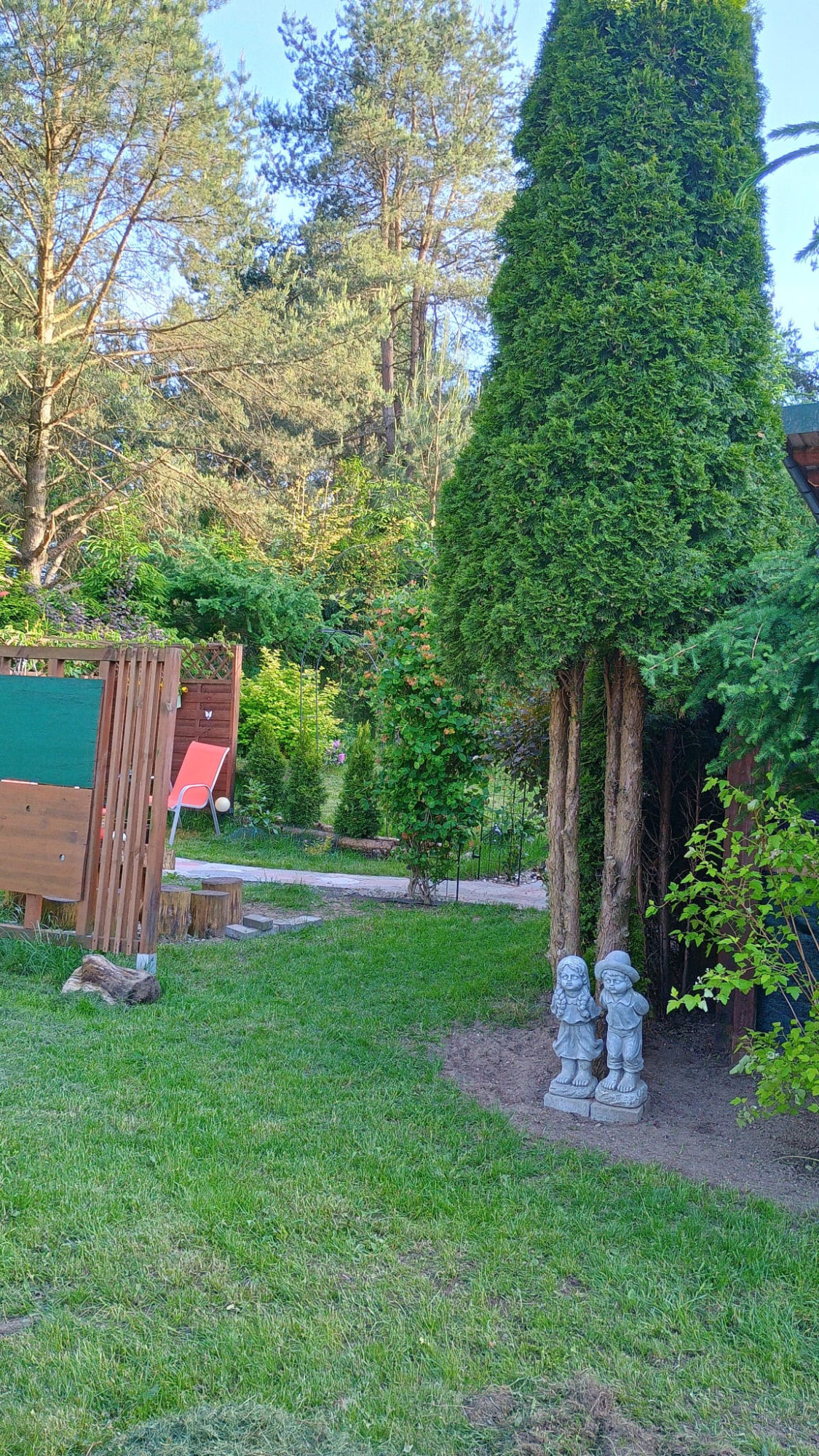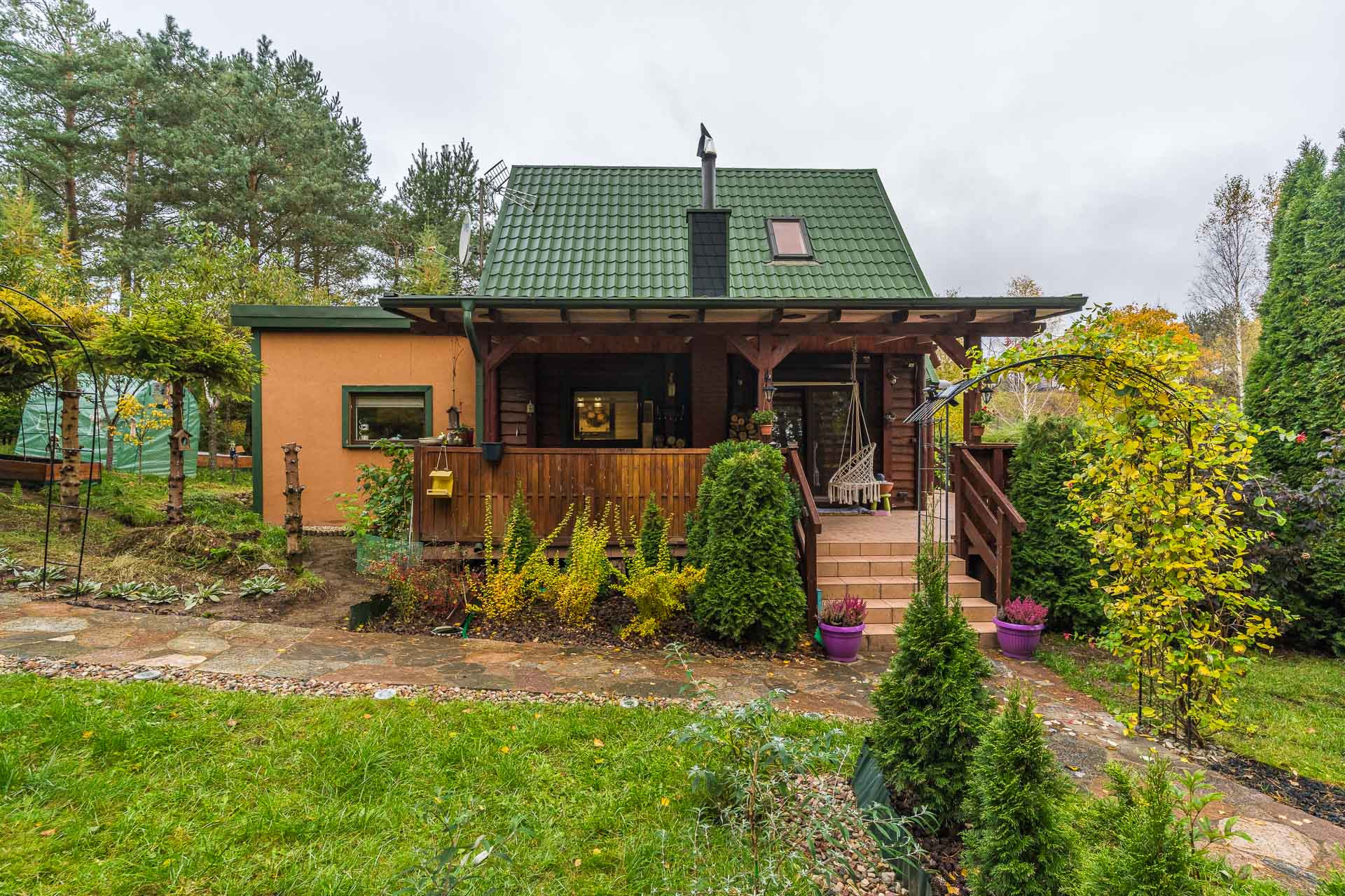 Działka w kształcie prostokąta o powierzchni 1124 m2, z pięknie zaaranżowanym ogrodem, zagospodarowana licznymi nasadzeniami, drzewkami i krzewami owocowymi, szklarnia z warzywami, ścieżki usypane z kamieni. Wydzielona została część wypoczynkowa, gdzie w pełnej intymności można rozpalić ognisko czy też kąpać się w basenie.