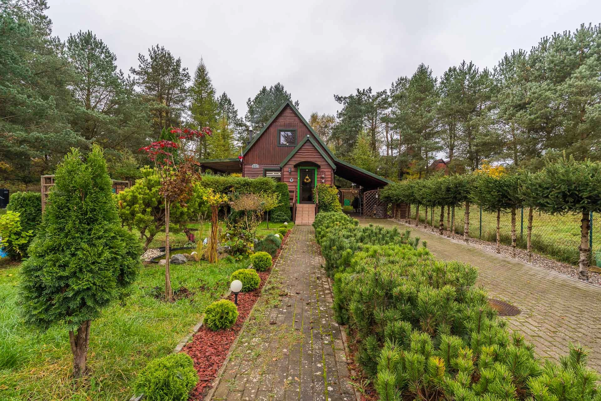 Przy domu dobudowana została duża wiata, umożliwiająca zaparkowanie samochodu oraz drewutnia.