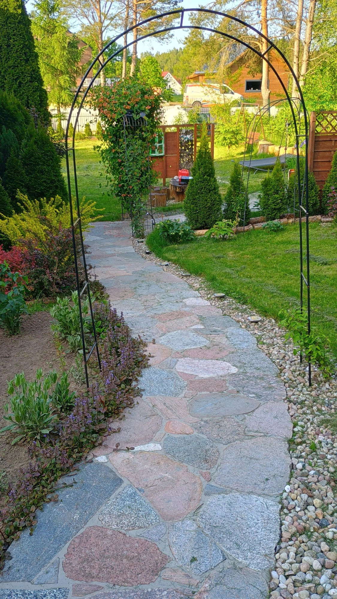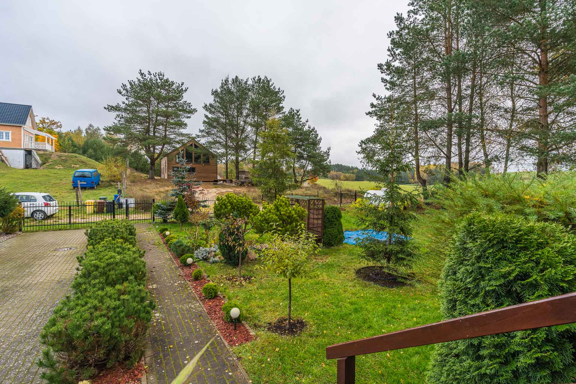 Cała działka jest w pełni ogrodzona siatką, natomiast od frontu zamontowano stylową kutą bramę żeliwną. Dojście do domu i wjazd na posesję wyłożony polbrukiem.