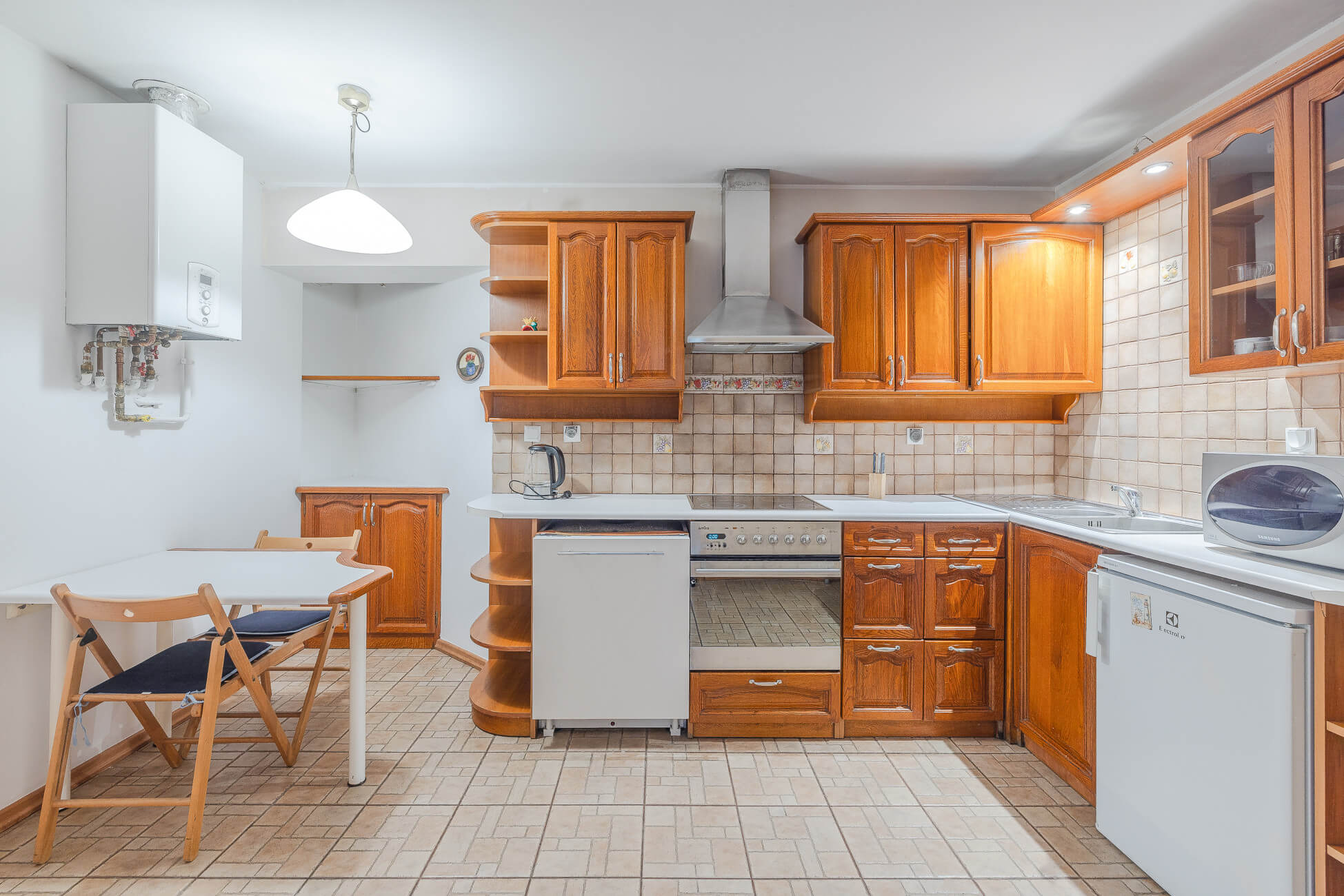 Na podłogach panele i płytki. Wysokość pomieszczeń: 2,45 m – 2,63 m. Instalacja elektryczna miedziana. W mieszkaniu zainstalowany jest 2-funkcyjny piec gazowy odpowiedzialny za ogrzewanie, jak również dostarczanie ciepłej wody. Okna są drewniane, a ich wystawa północno-wschodnia, wschodnio-południowa i południowo-zachodnia.