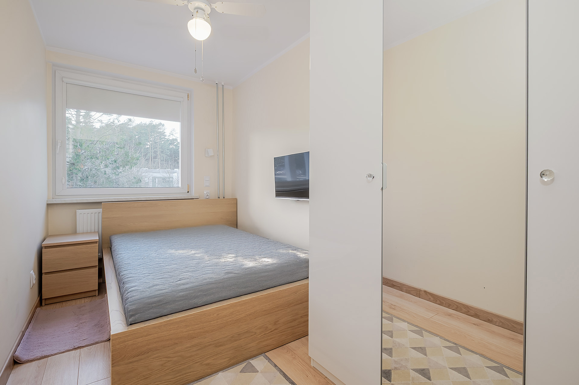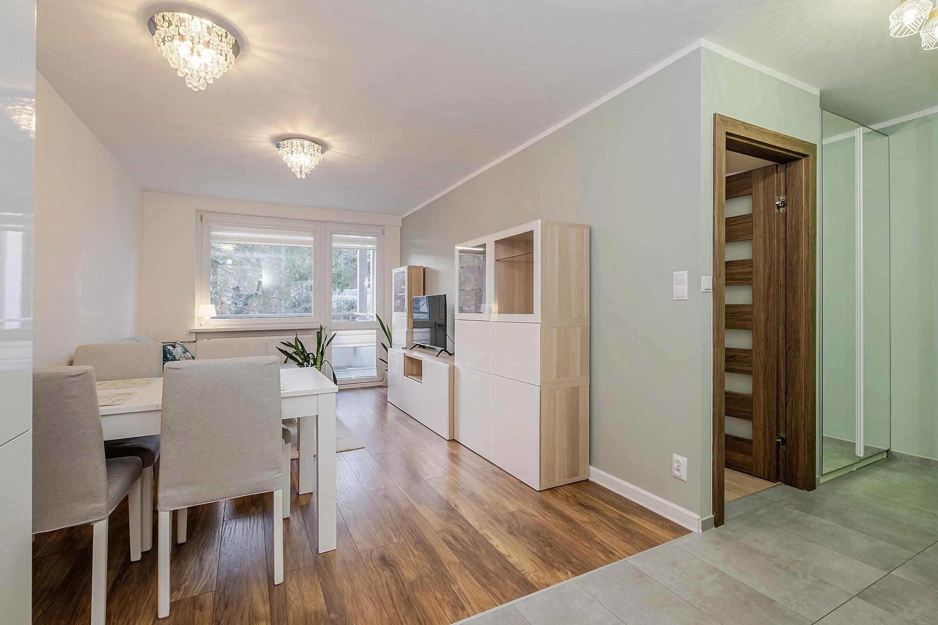 Na sprzedaż funkcjonalne 2-pokojowe mieszkanie znajdujące się na 3 piętrze, na które wjeżdżamy cichobieżną windą. Mieszkanie po generalnym remoncie z wymienionymi instalacjami i nowymi posadzkami, oraz panelami, aneks kuchenny wyposażony we wszystkie niezbędne sprzęty: zmywarka, piekarnik z funkcją mikrofali, energooszczędna lodówka z zamrażarką. W szafce narożnej ukryte cargo. W mieszkaniu zastosowano nastrojowe oświetlenie. W sypialni w letnie gorące dni wypoczynek ułatwia dodatkowy wentylator sufitowy. W salonie znajduje się wygodna sofa z funkcją spania, stół w jadalni jest rozkładany więc mieszkanie swobodnie pomieści 4 osoby. W czasie wolnym można delektować się na balkonie kawą i pięknym widokiem na zieleń. W łazience zainstalowano kabinę prysznicową, dużą, wygodną umywalkę zintegrowaną z pojemną szafką. Mieszkanie mieści się blisko windy, a nowe drzwi antywłamaniowe zapewniają dobrą akustykę, prywatność i poczucie bezpieczeństwa.