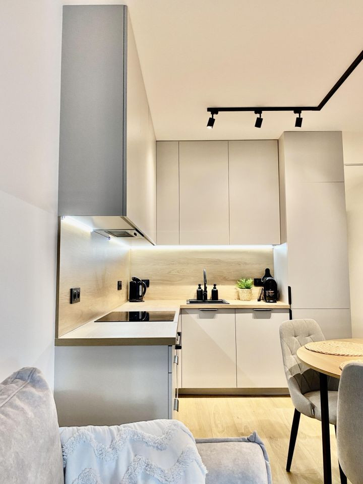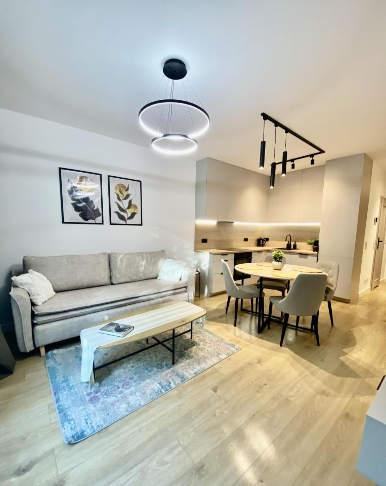 Apartament jest w pełni wyposażony w nowe sprzęty AGD na gwarancji, w tym telewizor, lodówkę, zmywarkę, płytę indukcyjną, piekarnik i okap. W cenie pozostaje również komplet nowych mebli: dwie pojemne szafy, rozkładana sofa, łóżko z materacem, okrągły stół z czterema krzesłami, stolik kawowy oraz stylowe oświetlenie.