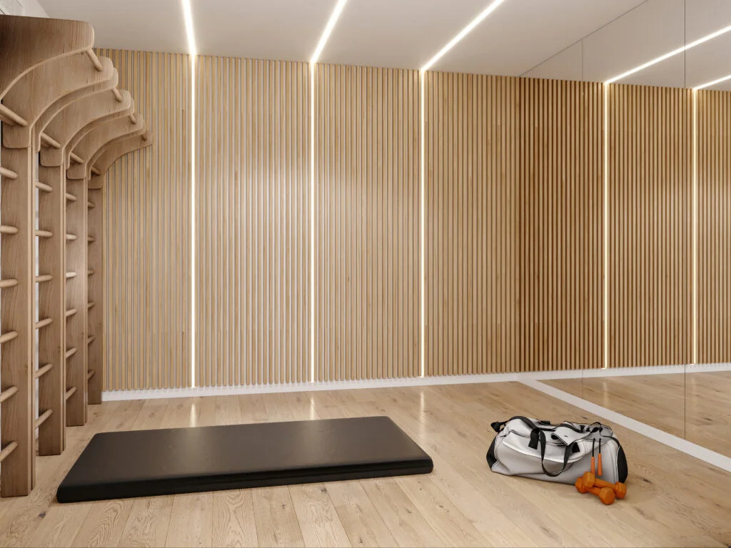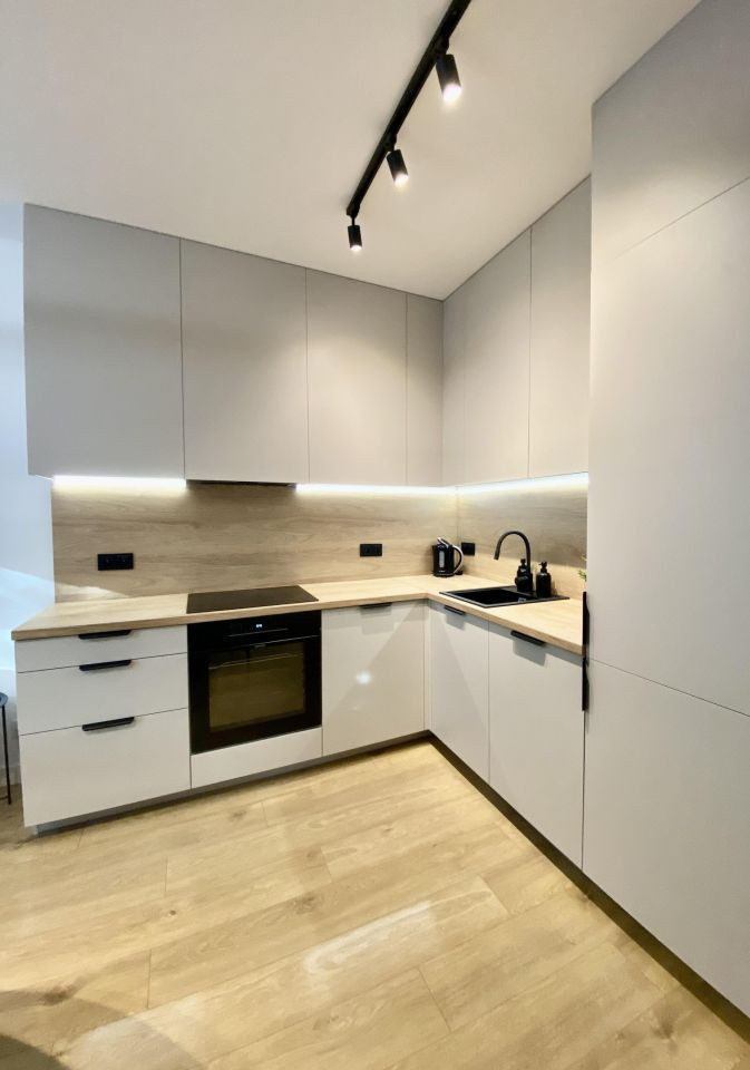Przestrzeń została wykończona materiałami najwyższej jakości. Znajdziemy tu wykonaną na zamówienie zabudowę kuchenną, jakościowe panele podłogowe Kronostep AC6 o grubości 12 mm, drzwi wewnętrzne tworzone specjalnie do tego projektu oraz drewniane, trzyszybowe okna.