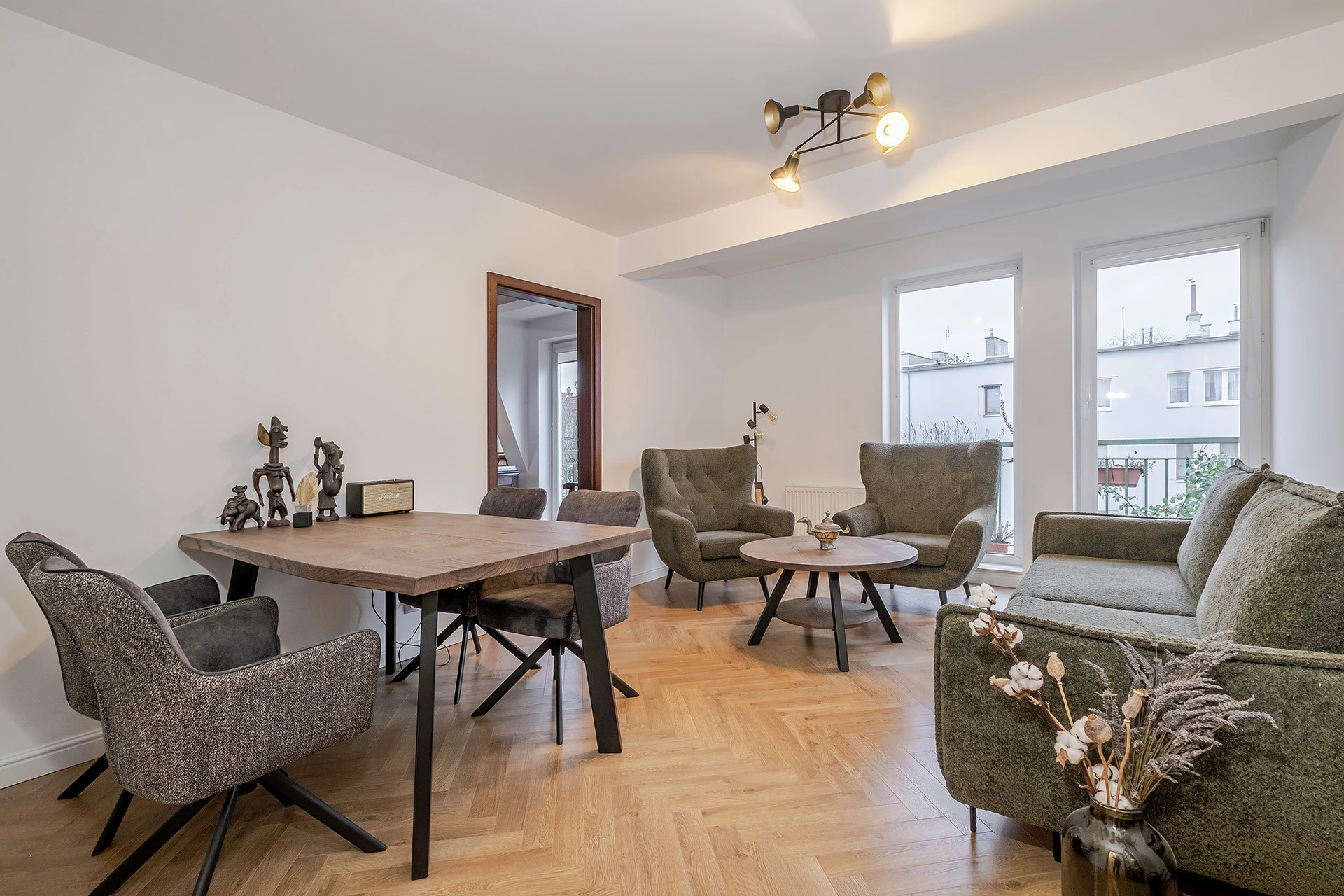 Salon – przestronny, jasny, z dużymi oknami i wyjściem na balkon. Idealny do odpoczynku i spotkań.