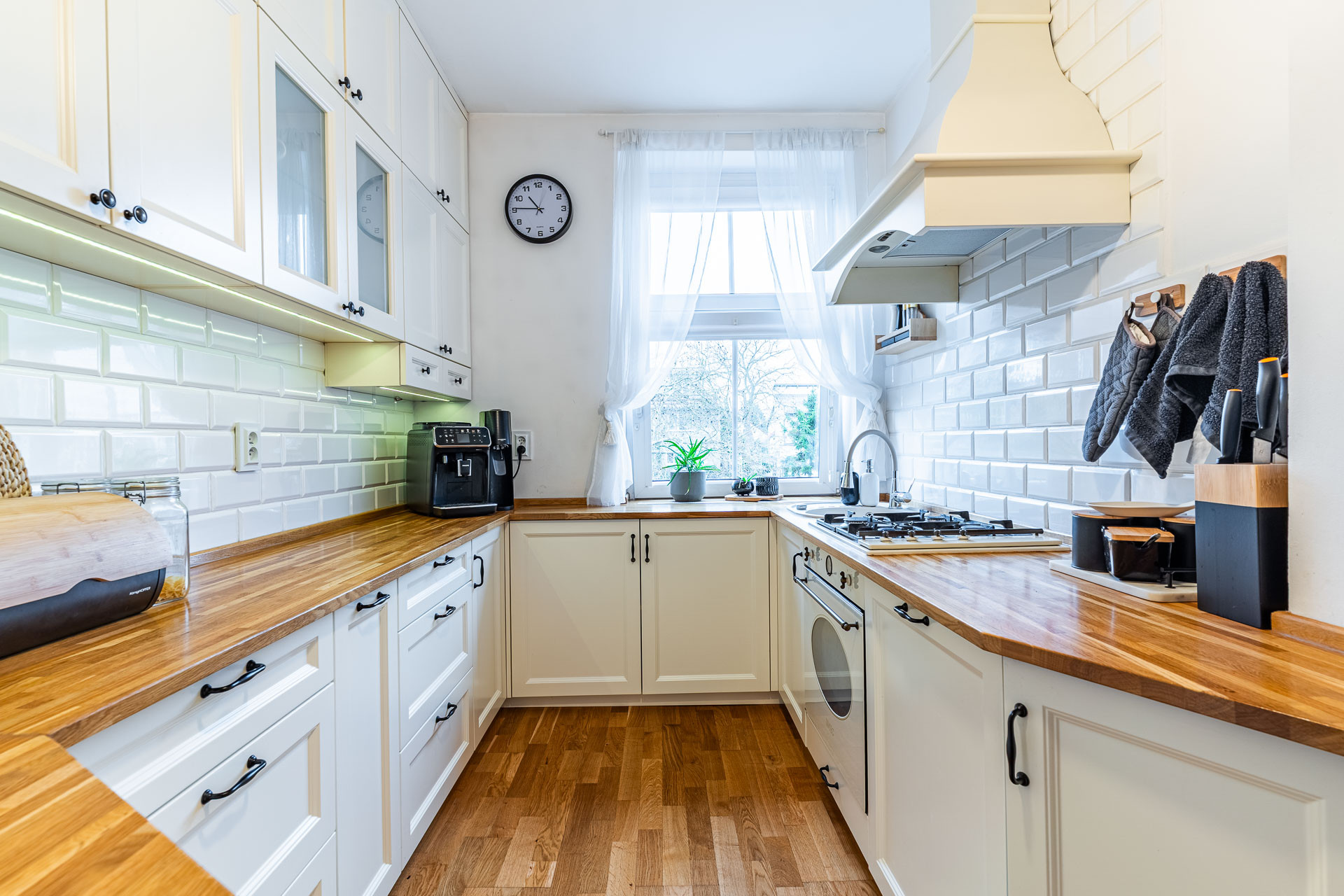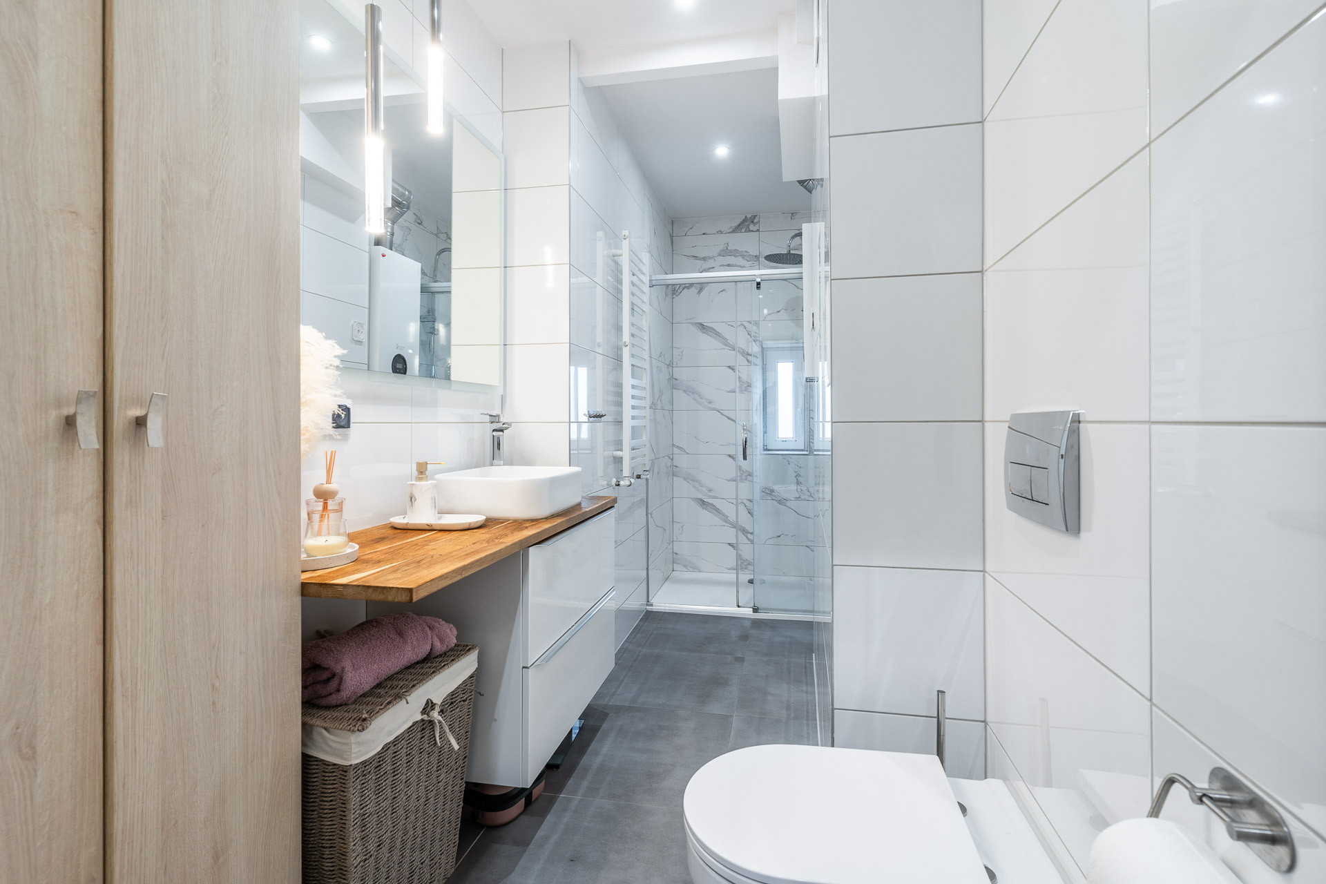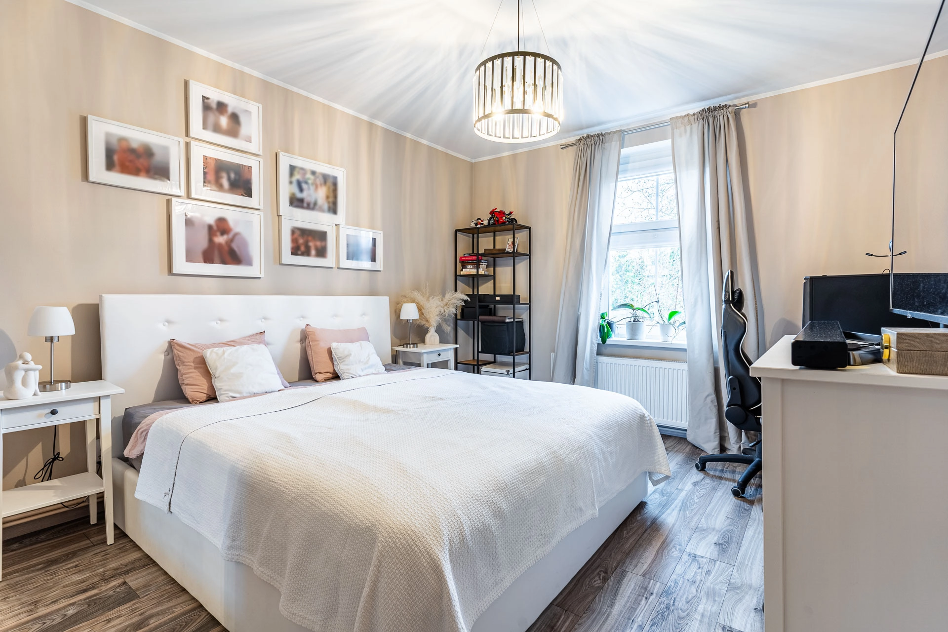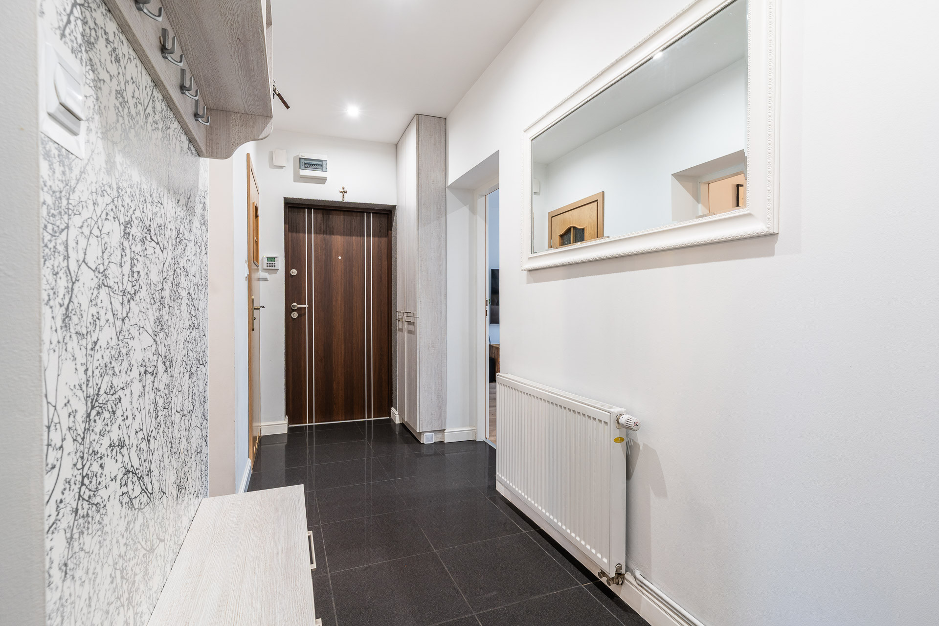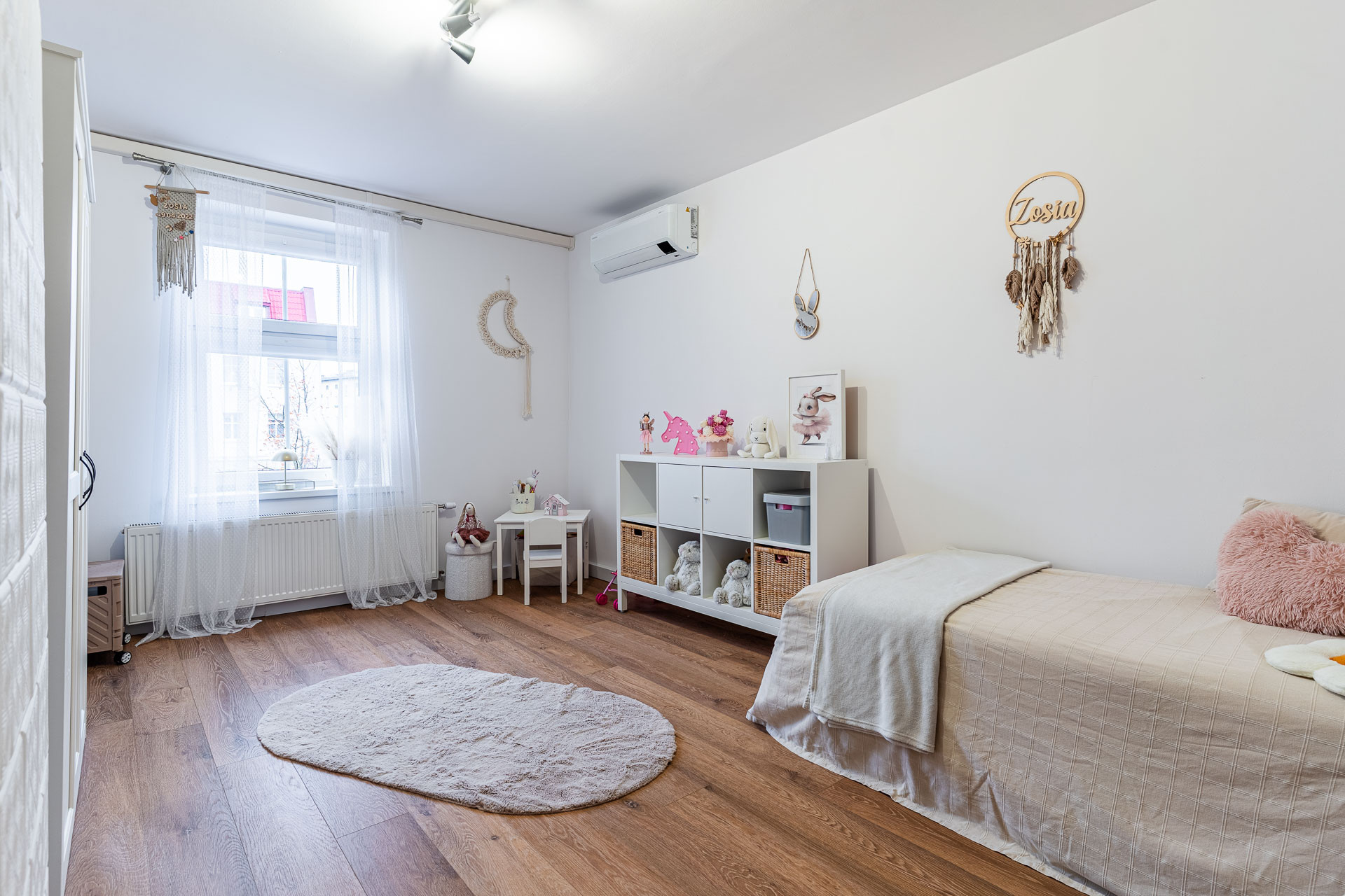 Mieszkanie dwustronne idealna ekspozycja – kuchnia, łazienka i sypialnia główna od zachodu, sypialnia dziecięca i salon od wschodu. W oknach zamontowane automatyczne żaluzje odbijające promienie słoneczne firmy FAKRO