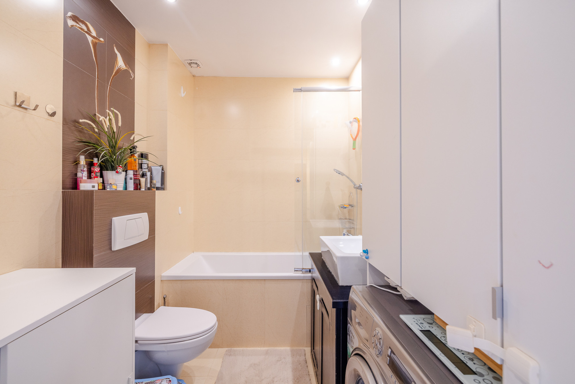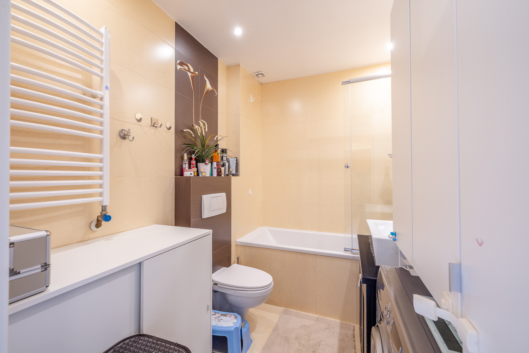 – łazienka z WC, wanną z parawanem, pralką, umywalką, lustrem, grzejnikiem drabinkowym,
