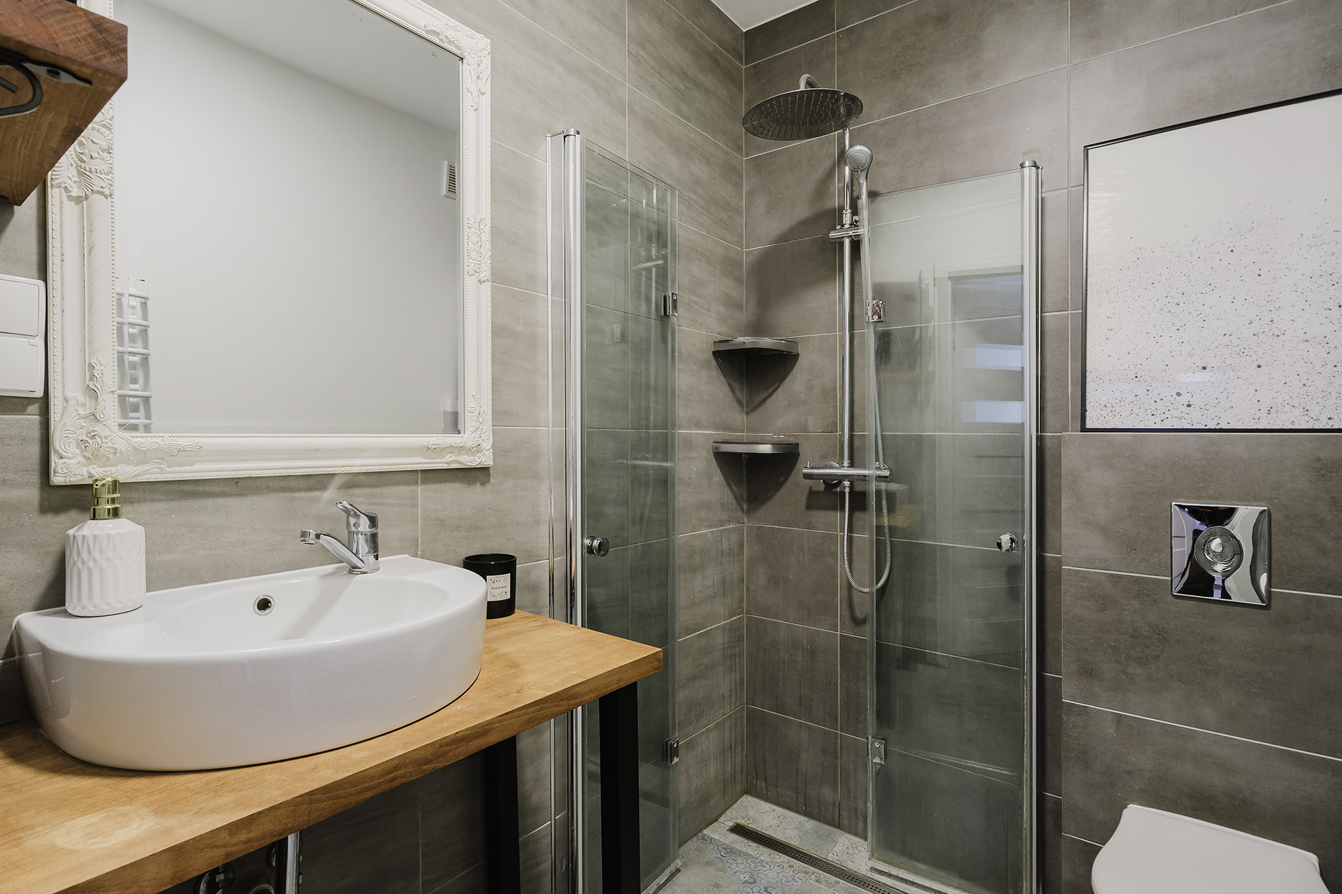 * Łazienka (3 m²) – wyposażona w prysznic i WC.
