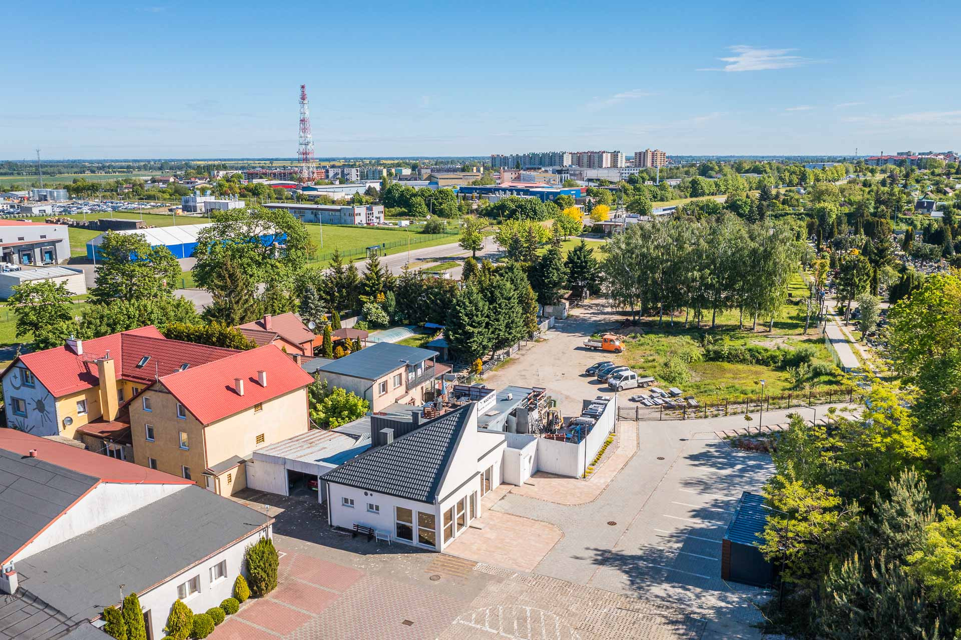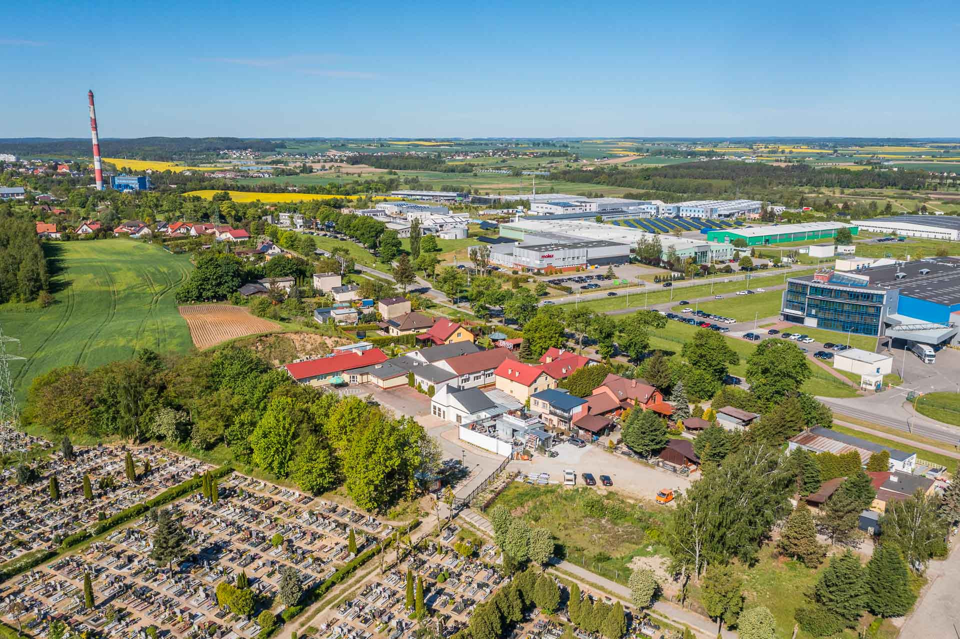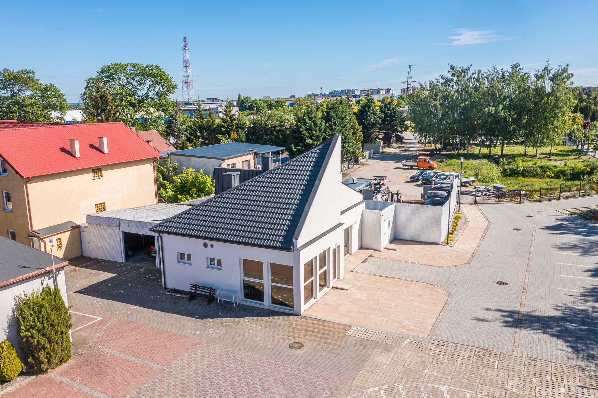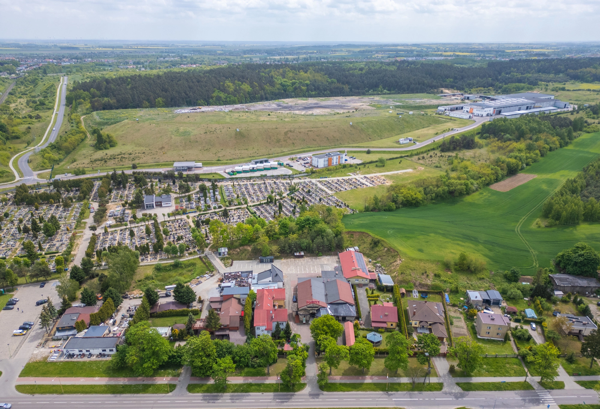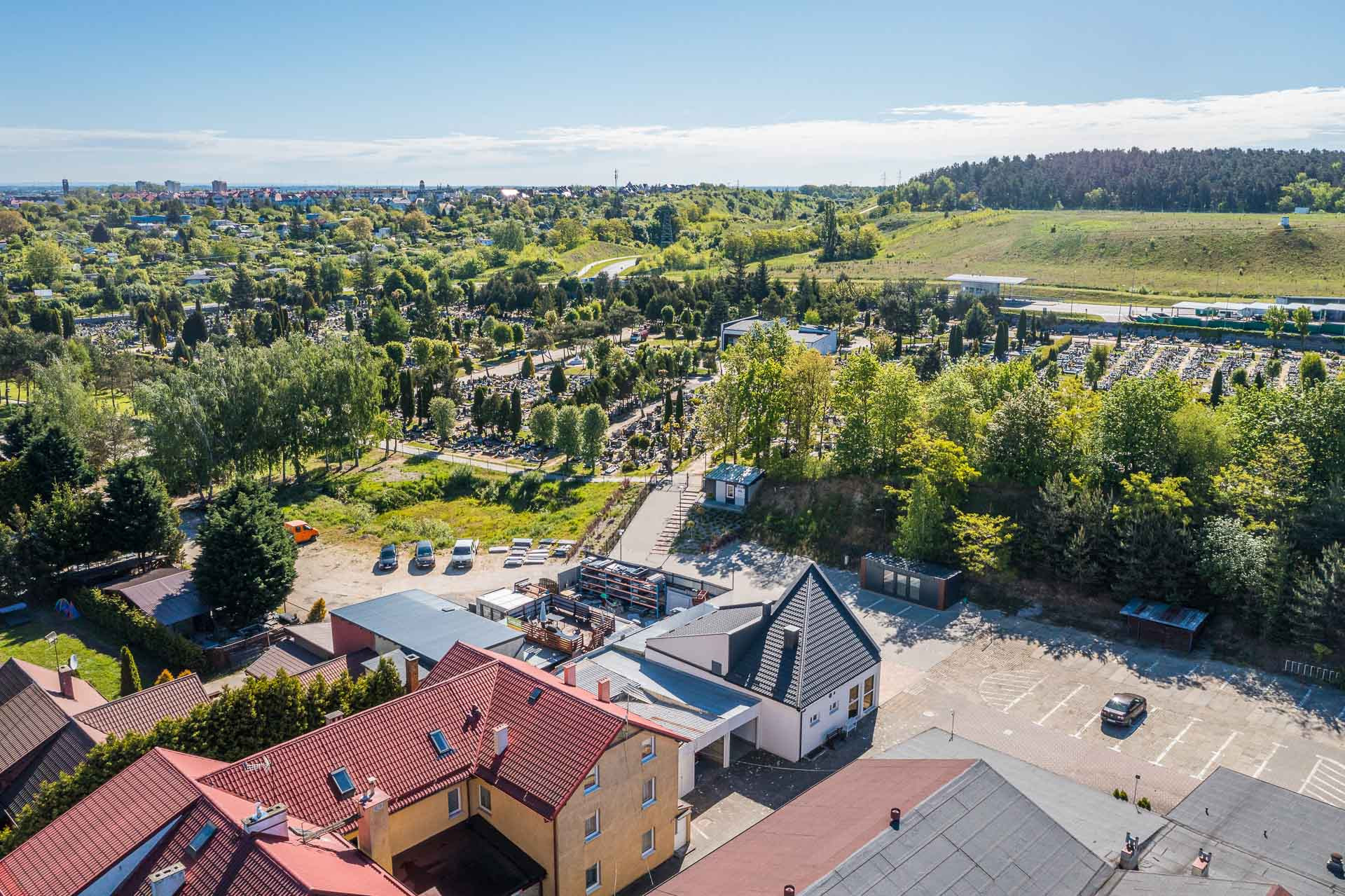 – Parterowego budynku usługowego z 2017 roku, podpiwniczonego o powierzchni ok. 225 m². Na parterze znajduje się sala pożegnań ok. 50 m², biuro ok. 12 m², kuchnia i pomieszczenie socjalne. W piwnicy zlokalizowane są pomieszczenia obsługi sekcyjnej oraz chłodnia do przechowywania zmarłych. Obiekt wyposażony jest w nowoczesny system wentylacji, który zapewnia komfortowe warunki dla personelu.