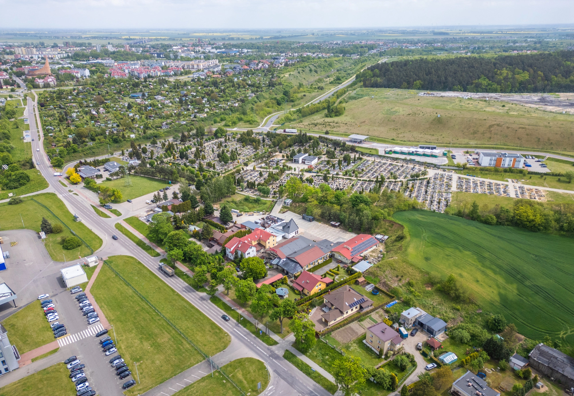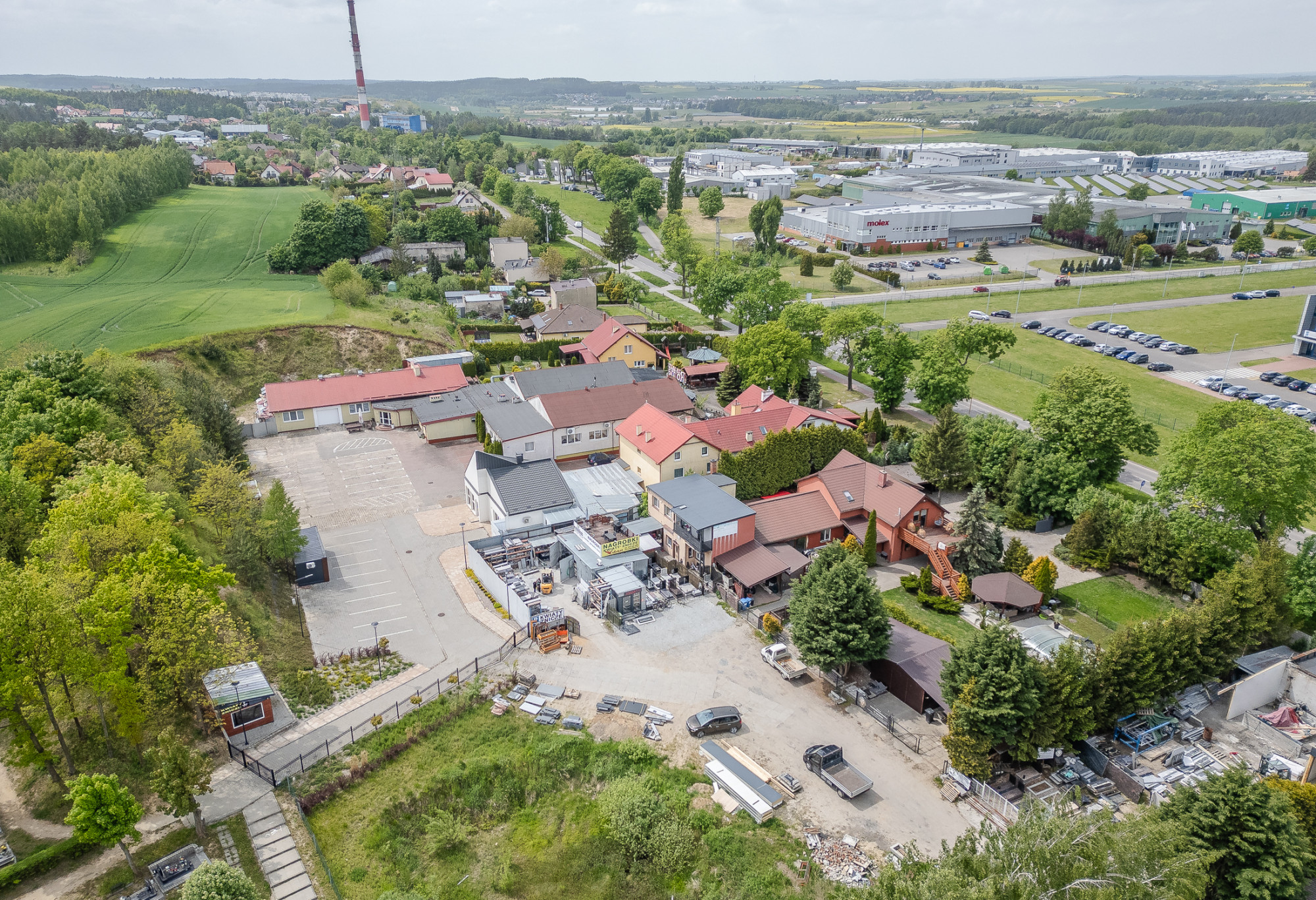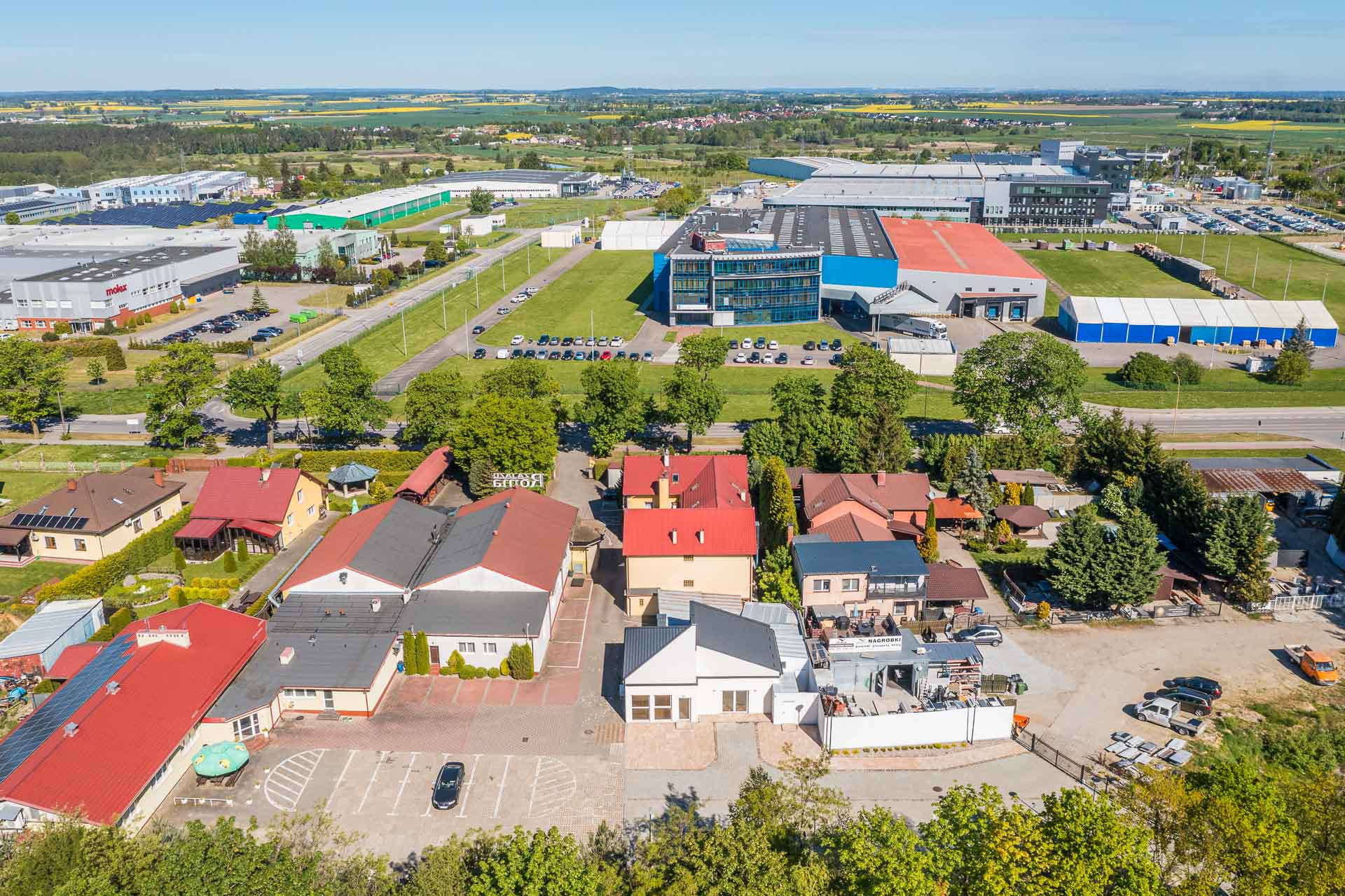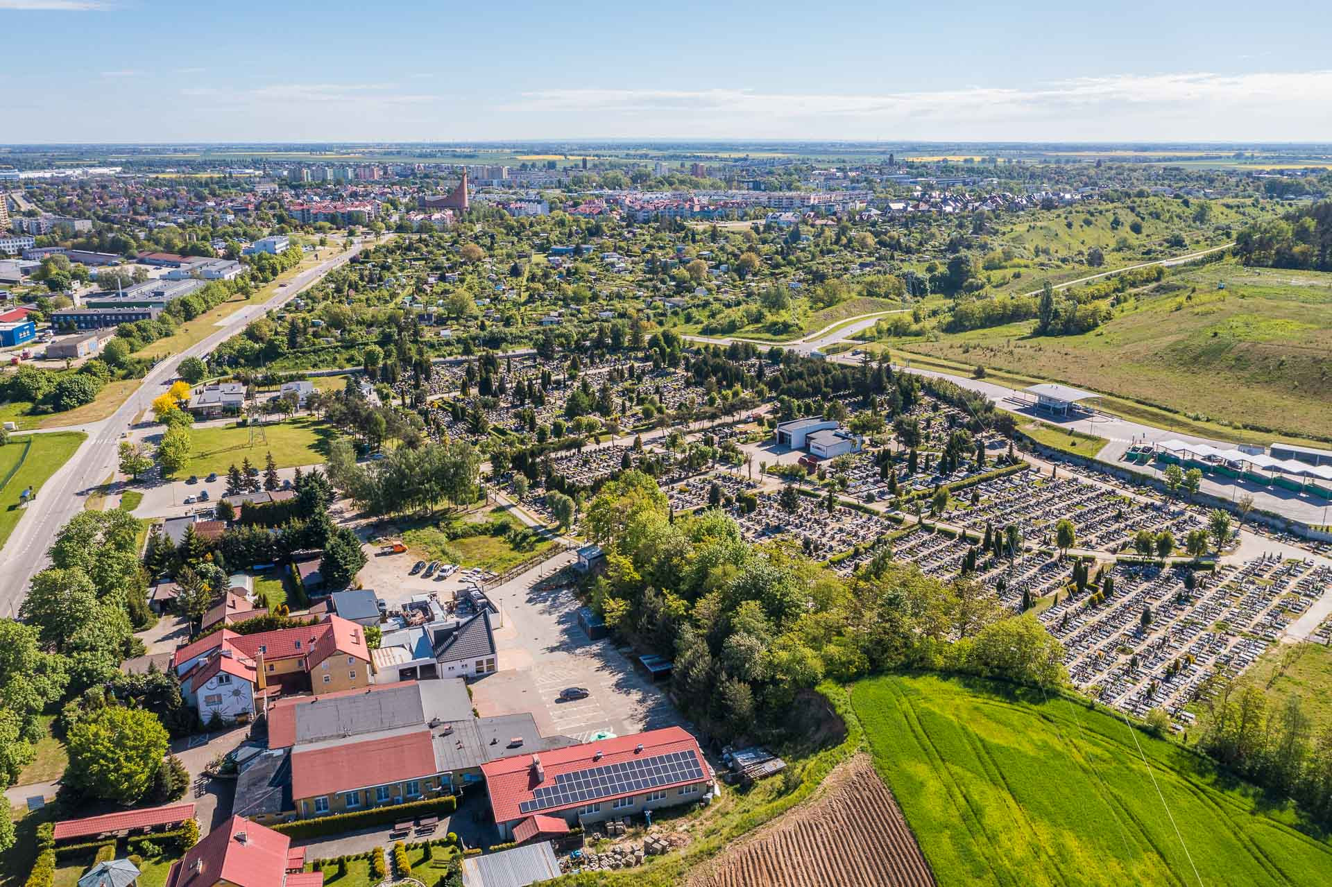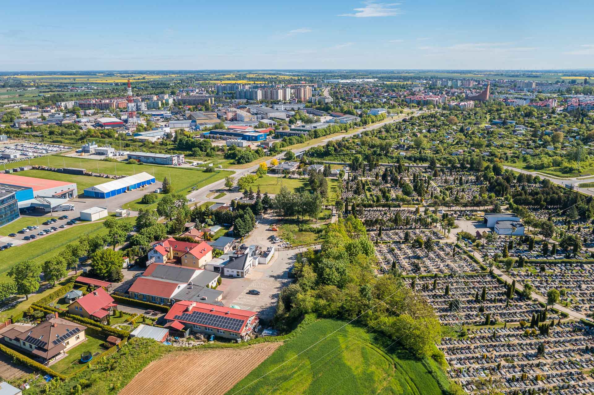 – Parterowego budynku usługowego z 2017 roku, podpiwniczonego o powierzchni ok. 225 m². Na parterze znajduje się sala pożegnań ok. 50 m², biuro ok. 12 m², kuchnia i pomieszczenie socjalne. W piwnicy zlokalizowane są pomieszczenia obsługi sekcyjnej oraz chłodnia do przechowywania zmarłych. Obiekt wyposażony jest w nowoczesny system wentylacji, który zapewnia komfortowe warunki dla personelu.