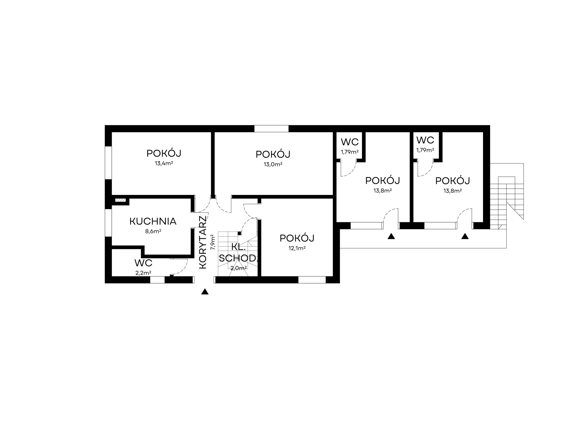 Od strony ogrodu mamy osobne wejście do czterech pokoi z łazienkami.