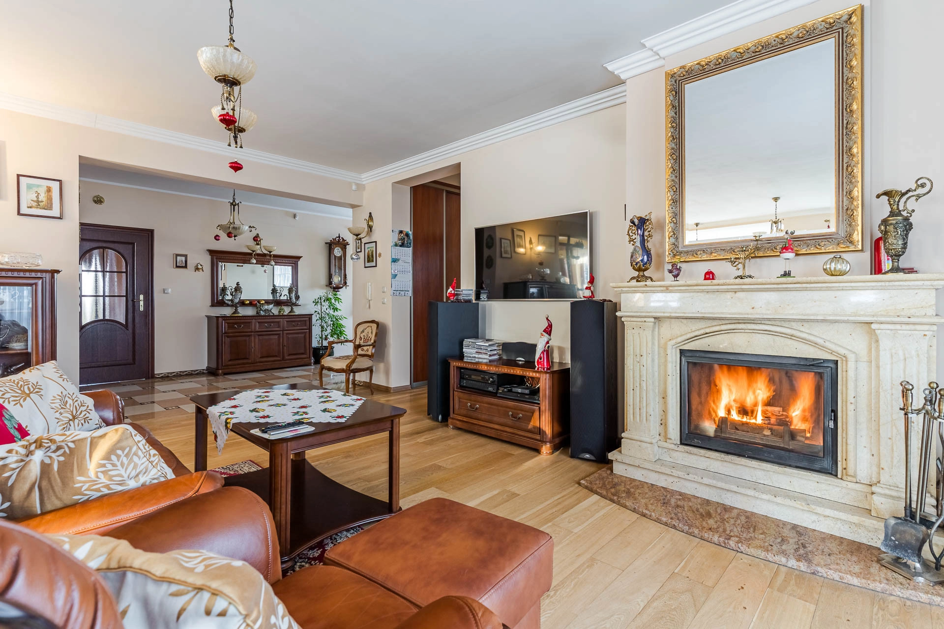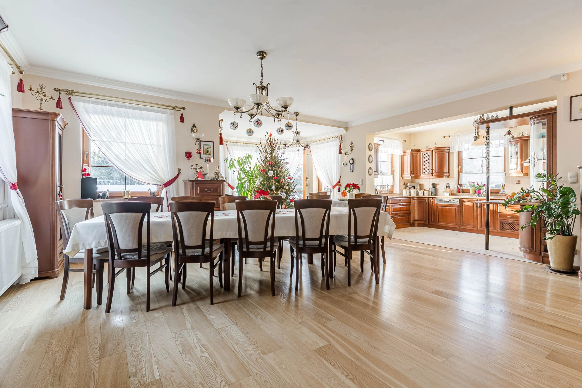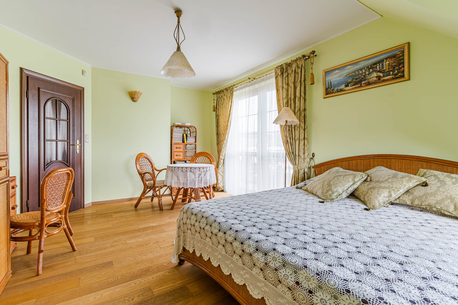 Nieruchomość zachwyca przestronnym, otwartym układem wnętrz, zaprojektowanym z dbałością o każdy detal. Prestiżowy charakter podkreślają materiały najwyższej klasy: naturalna dębowa deska na podłogach oraz kuchnia łącząca szlachetną drewnianą zabudowę z granitowymi blatami i marmurowymi kafelkami. Dzięki wysokości pomieszczeń (2,70 m), wnętrza są jasne i pełne dobrej enegii.