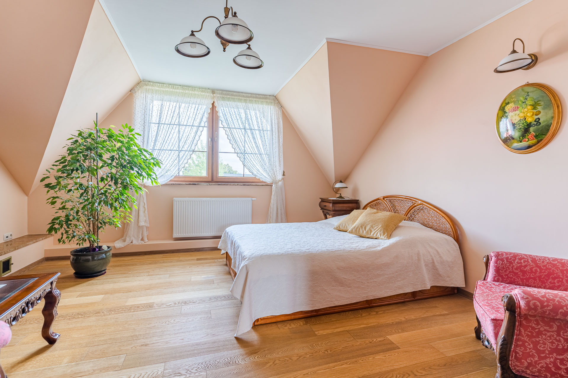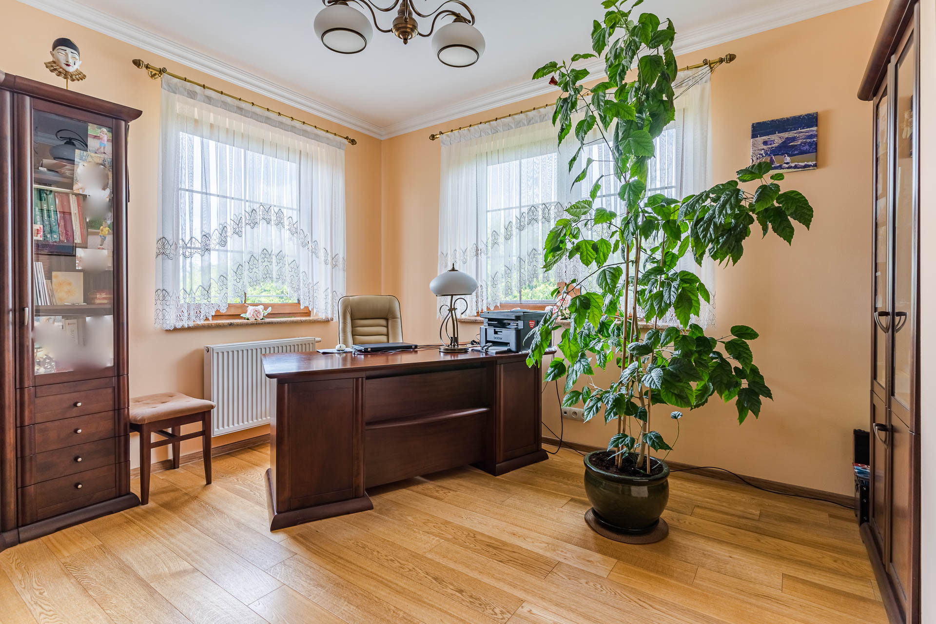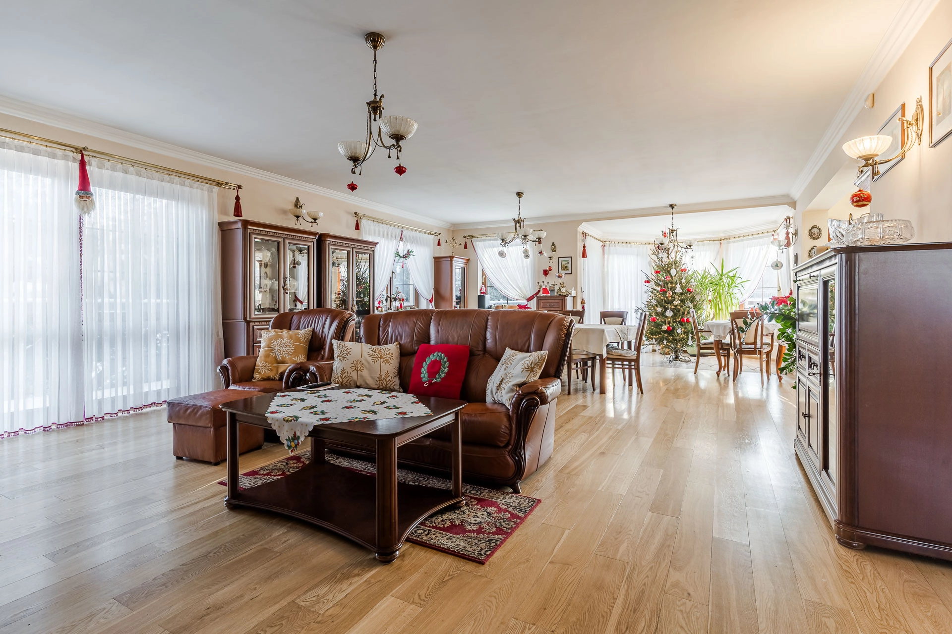Nieruchomość zachwyca przestronnym, otwartym układem wnętrz, zaprojektowanym z dbałością o każdy detal. Prestiżowy charakter podkreślają materiały najwyższej klasy: naturalna dębowa deska na podłogach oraz kuchnia łącząca szlachetną drewnianą zabudowę z granitowymi blatami i marmurowymi kafelkami. Dzięki wysokości pomieszczeń (2,70 m), wnętrza są jasne i pełne dobrej enegii.