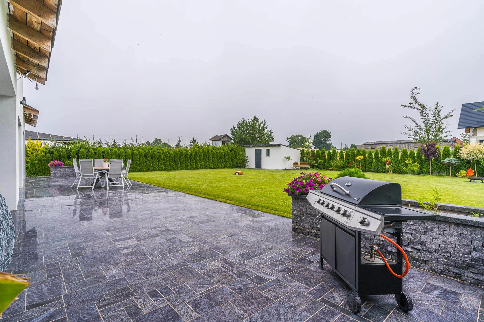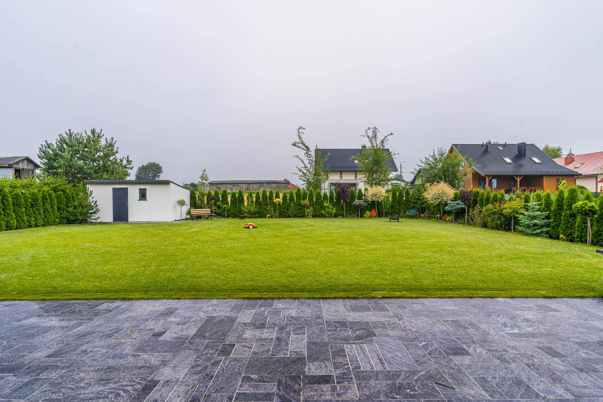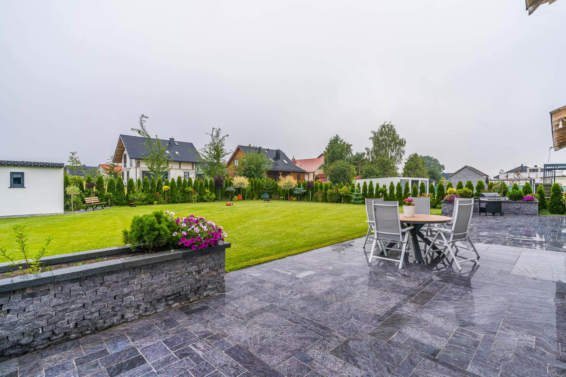 Działka o powierzchni 1004 m² jest w pełni zagospodarowana i ogrodzona z trzech stron. Ogród o ekspozycji południowej, wyposażono w automatyczny system nawadniania marek Rain Bird i Hunter, a jego przestrzeń uzupełniają liczne nasadzenia, tuje oraz granitowe donice. Do dyspozycji mieszkańców pozostaje przestronny taras z naturalnego granitu o powierzchni około 100 m², z bezpośrednim wyjściem z dwóch pomieszczeń. Na terenie posesji znajduje się miejsce na ognisko, duży grill oraz automatyczna kosiarka, która pozostaje w cenie. Dodatkowo dostępny jest ocieplony domek gospodarczy o powierzchni około 18 m², zasilany prądem i wyposażony w oświetlenie. Na działce znajdują się wszystkie niezbędne media: prąd, woda, gaz oraz szambo.