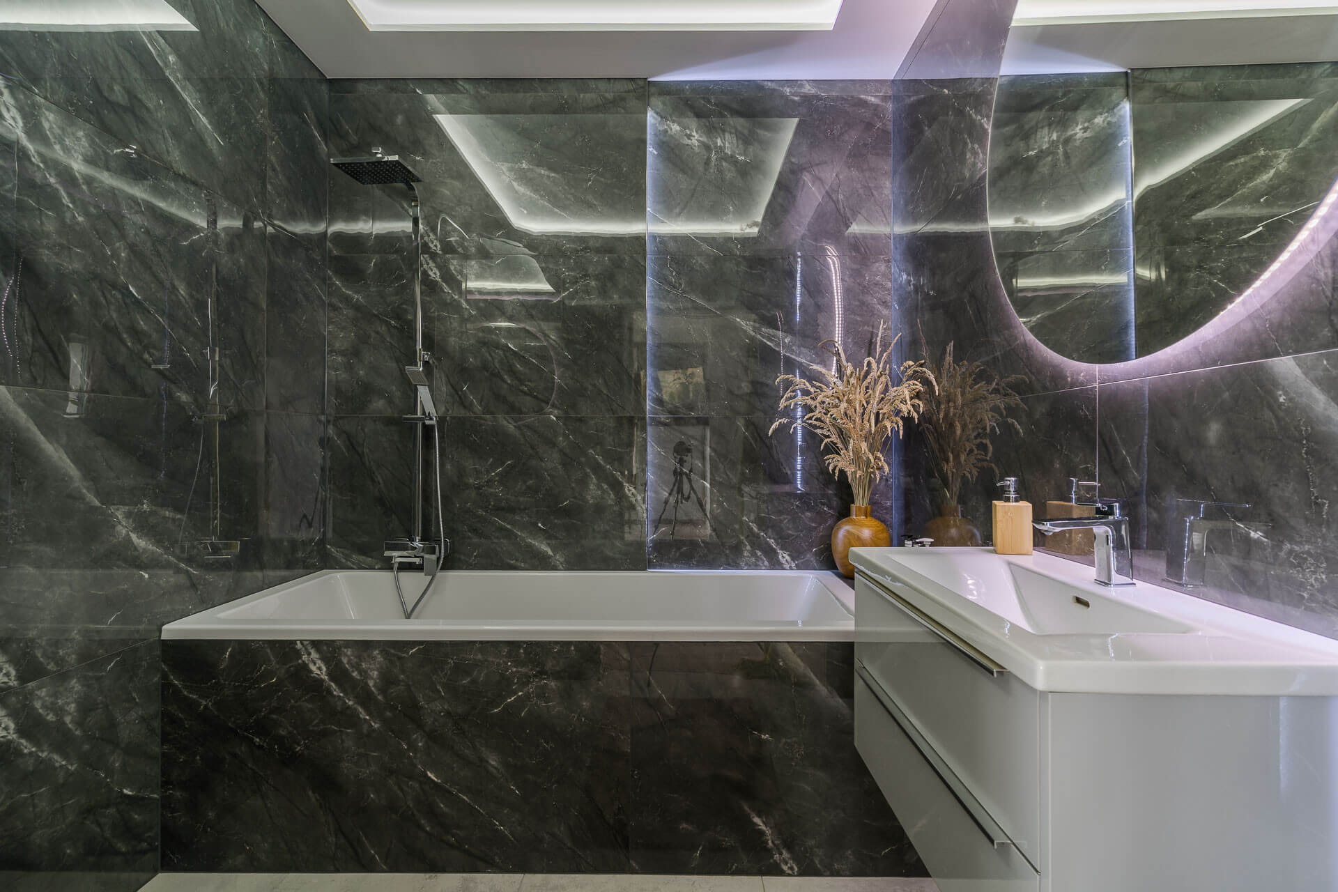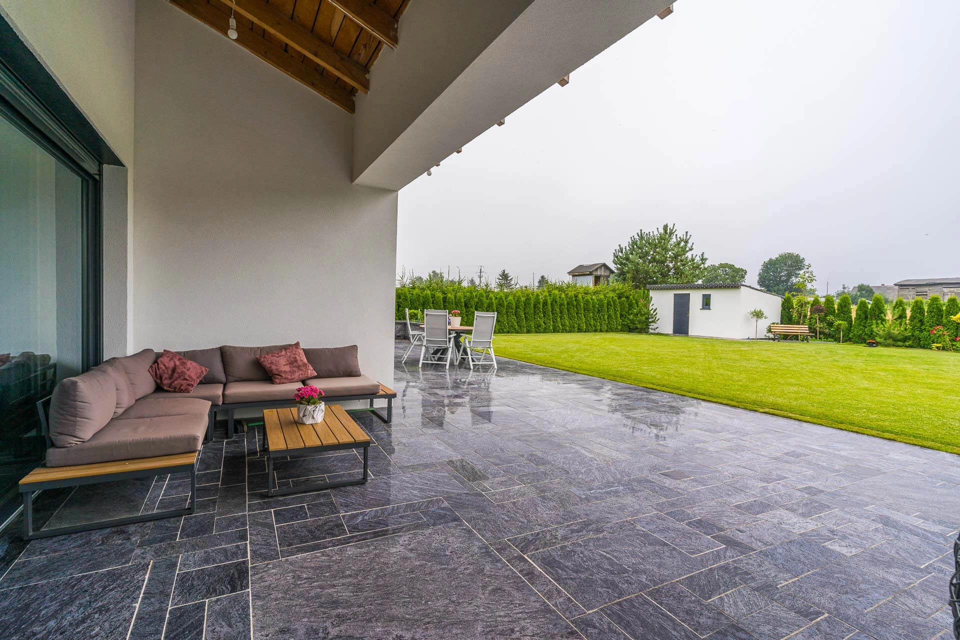 -Wnętrze wykończone jest naturalnym granitem (taras, parapety, blaty) oraz litym drewnem dębowym (drzwi i schody)