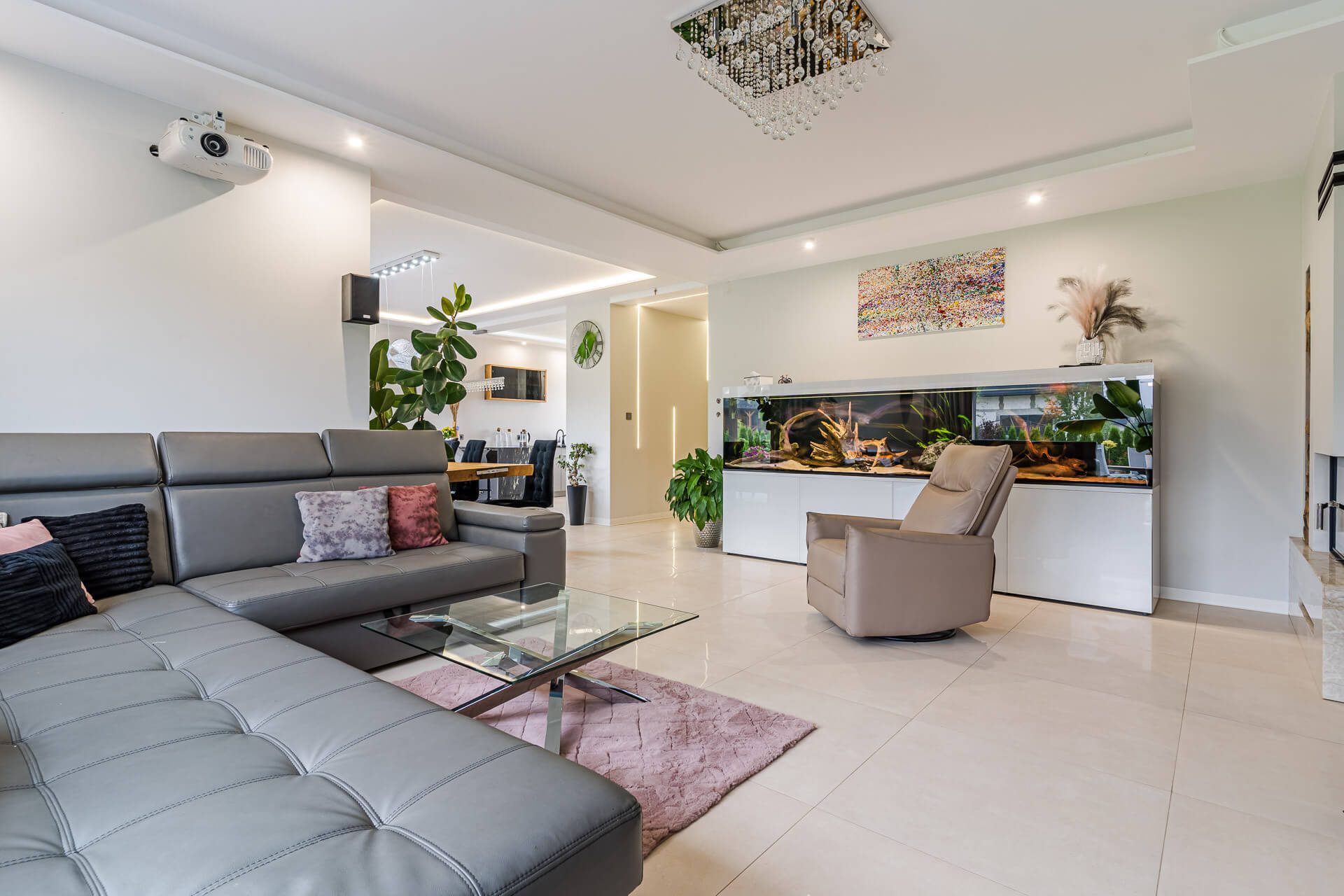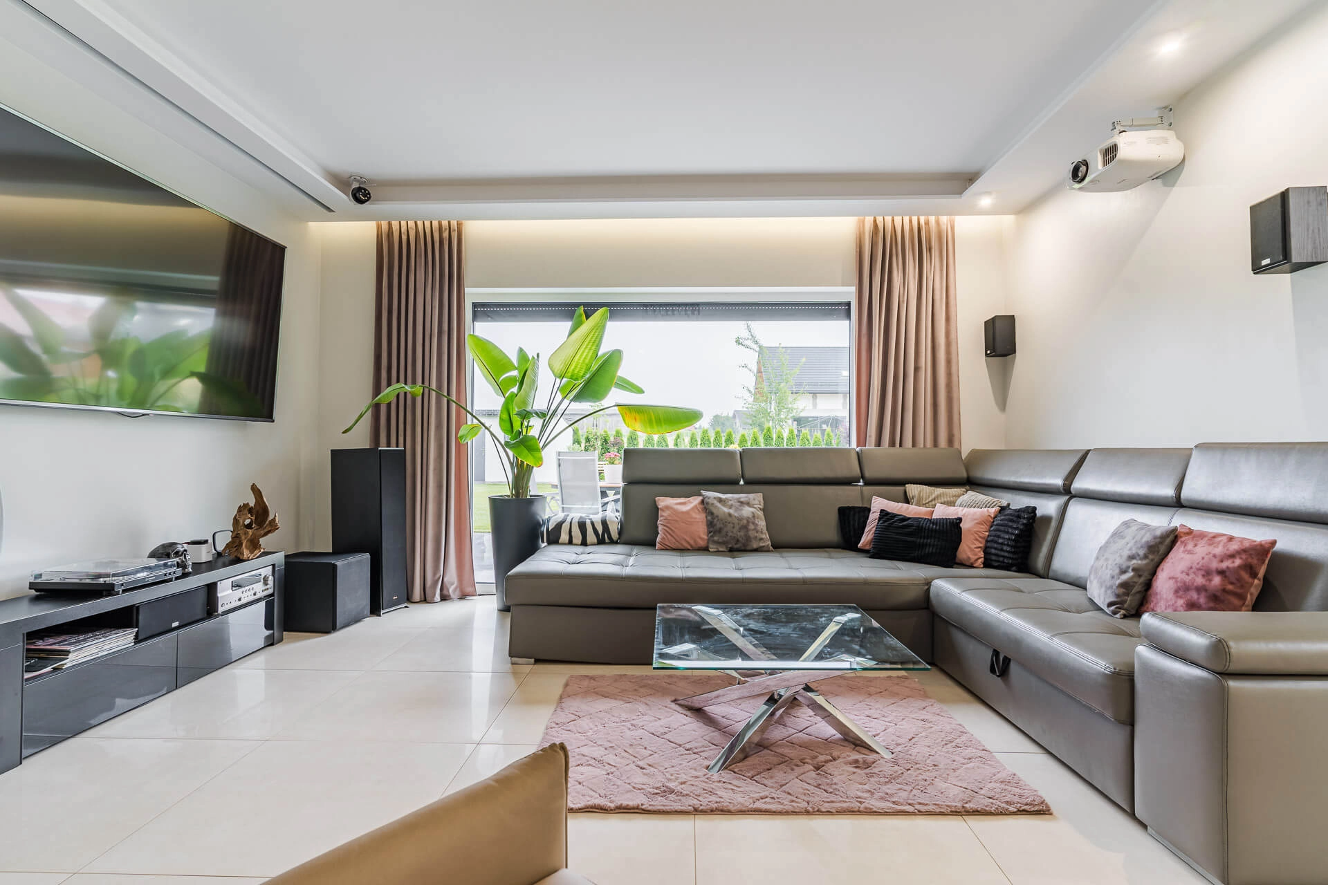 -Zainstalowano system kina domowego (projektor Epson, elektryczny ekran), bramę garażową Wiśniowski z napędem, a także rozprowadzono instalacje pod alarm i monitoring