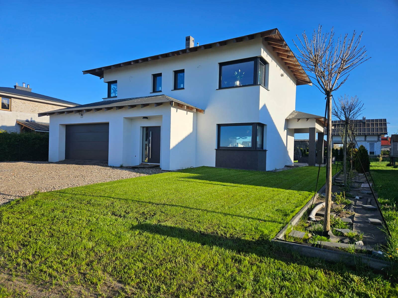 Do wykończenia pozostały ostatnie elementy zewnętrzne: ostateczny wybór pokrycia dachowego, ułożenie kostki brukowej przed domem oraz wykonanie frontowego ogrodzenia z bramą wjazdową