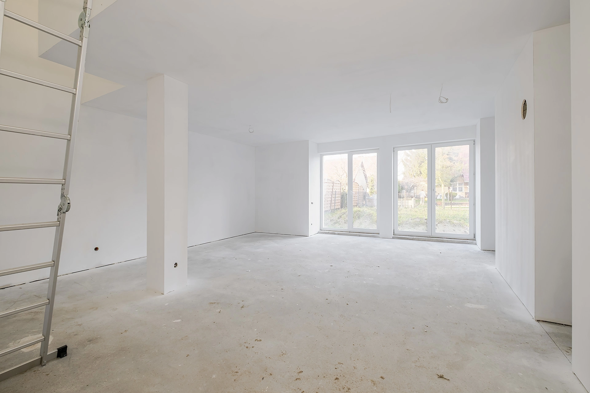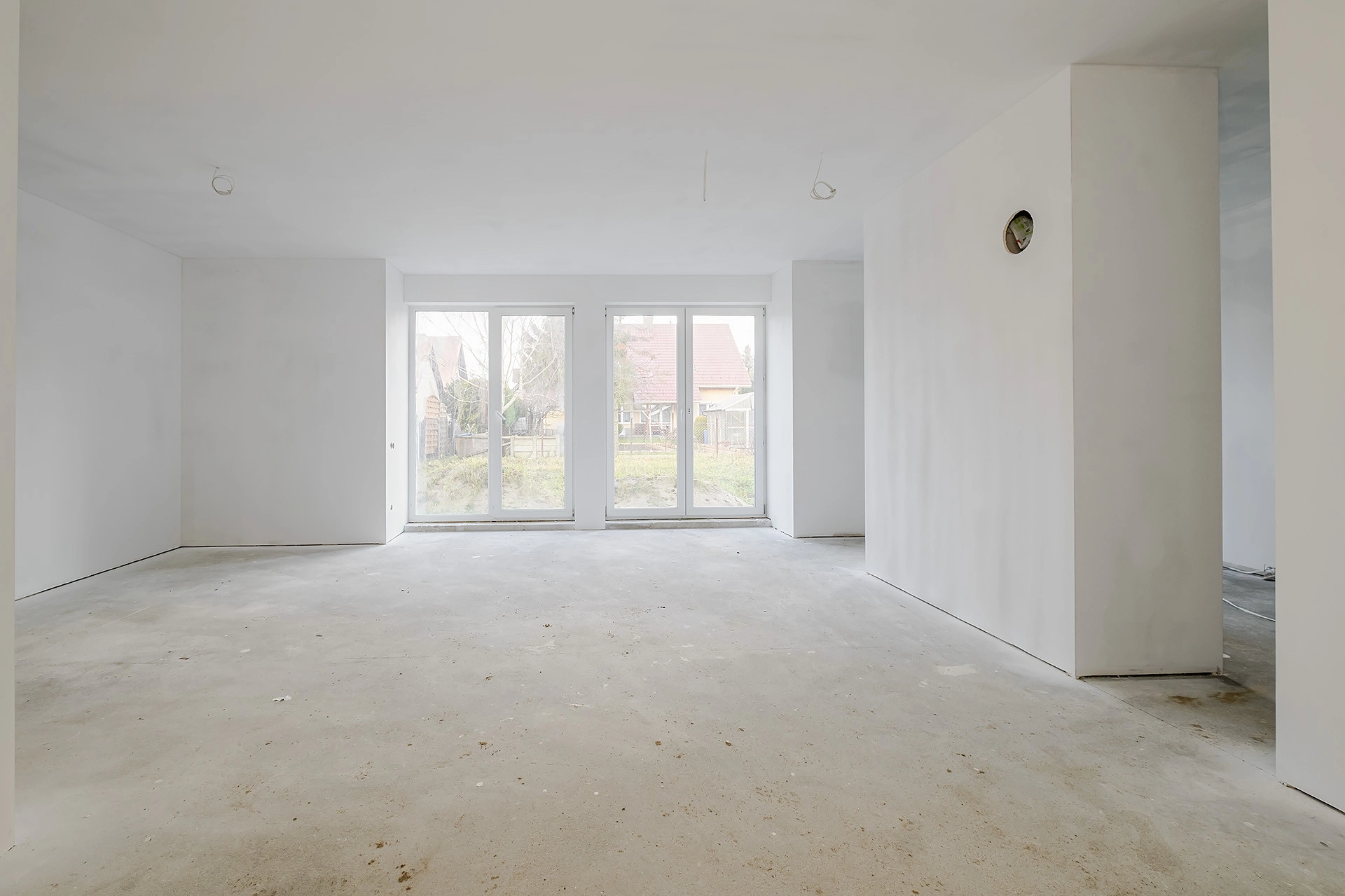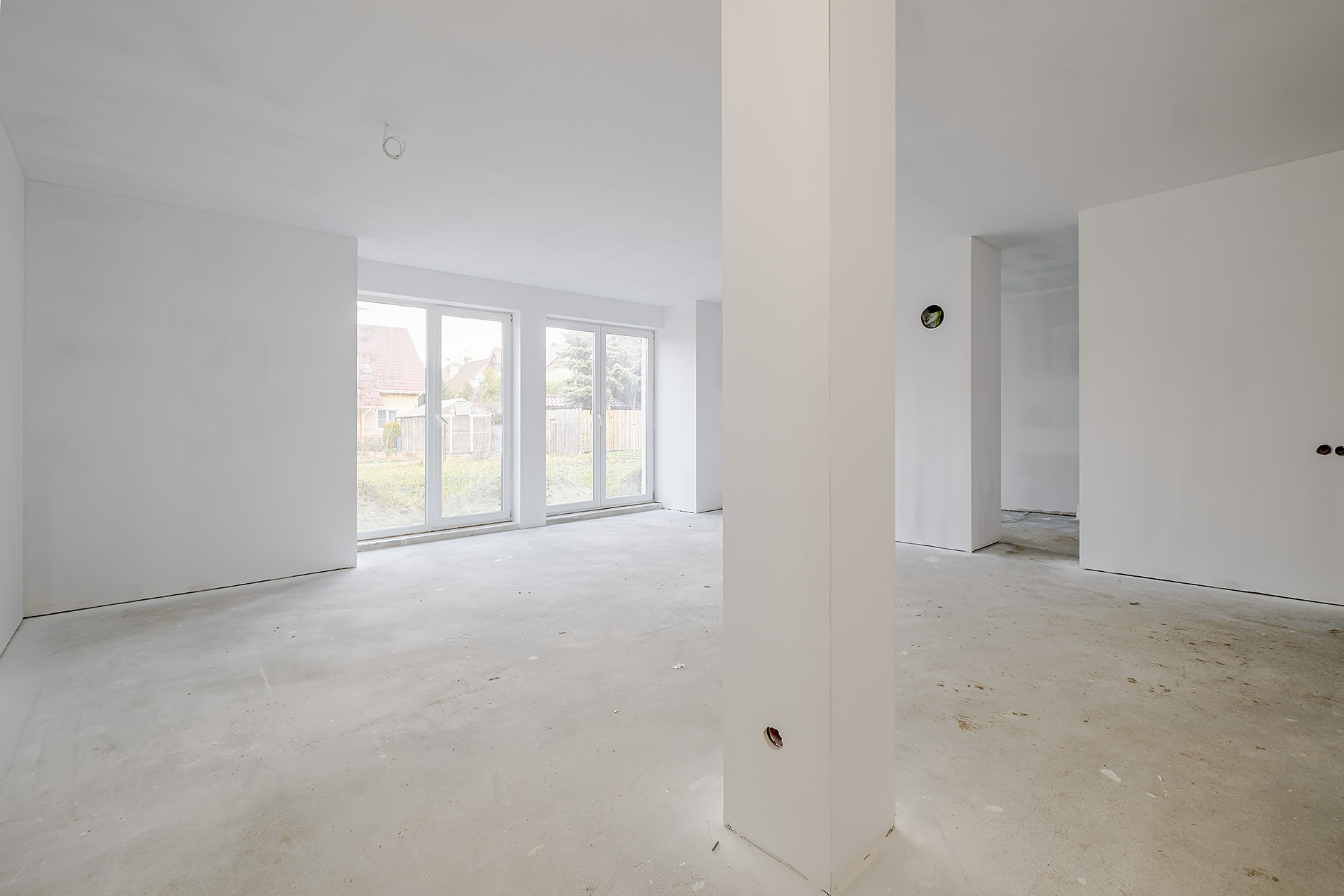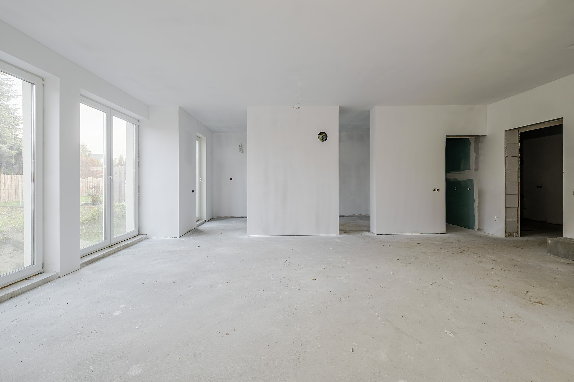* przestronny salon z jadalnią i wyjściem do ogrodu