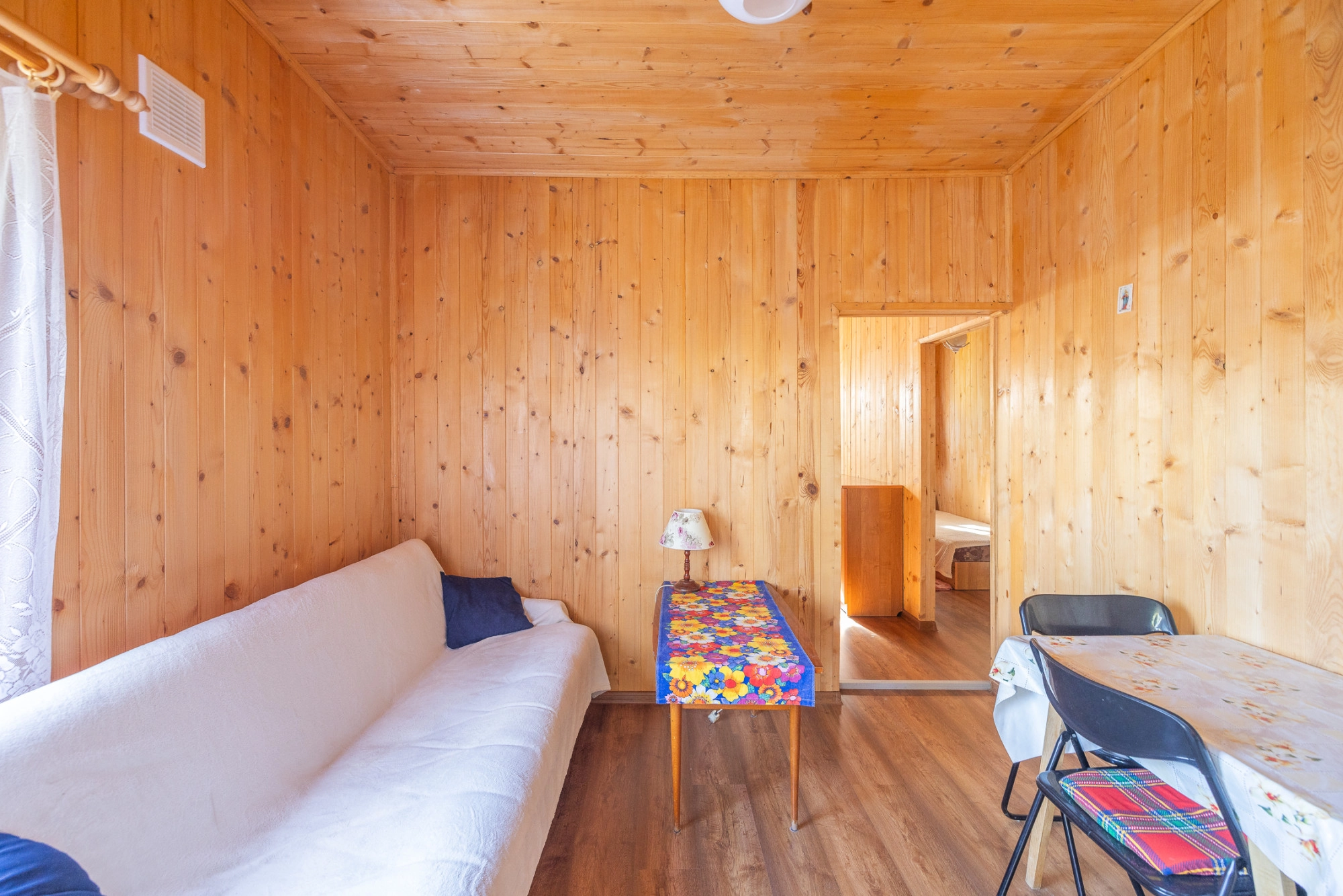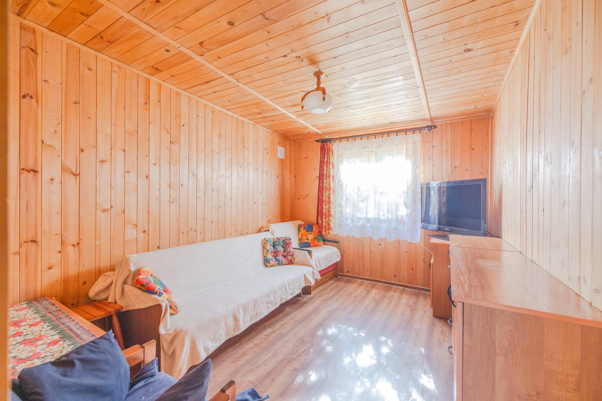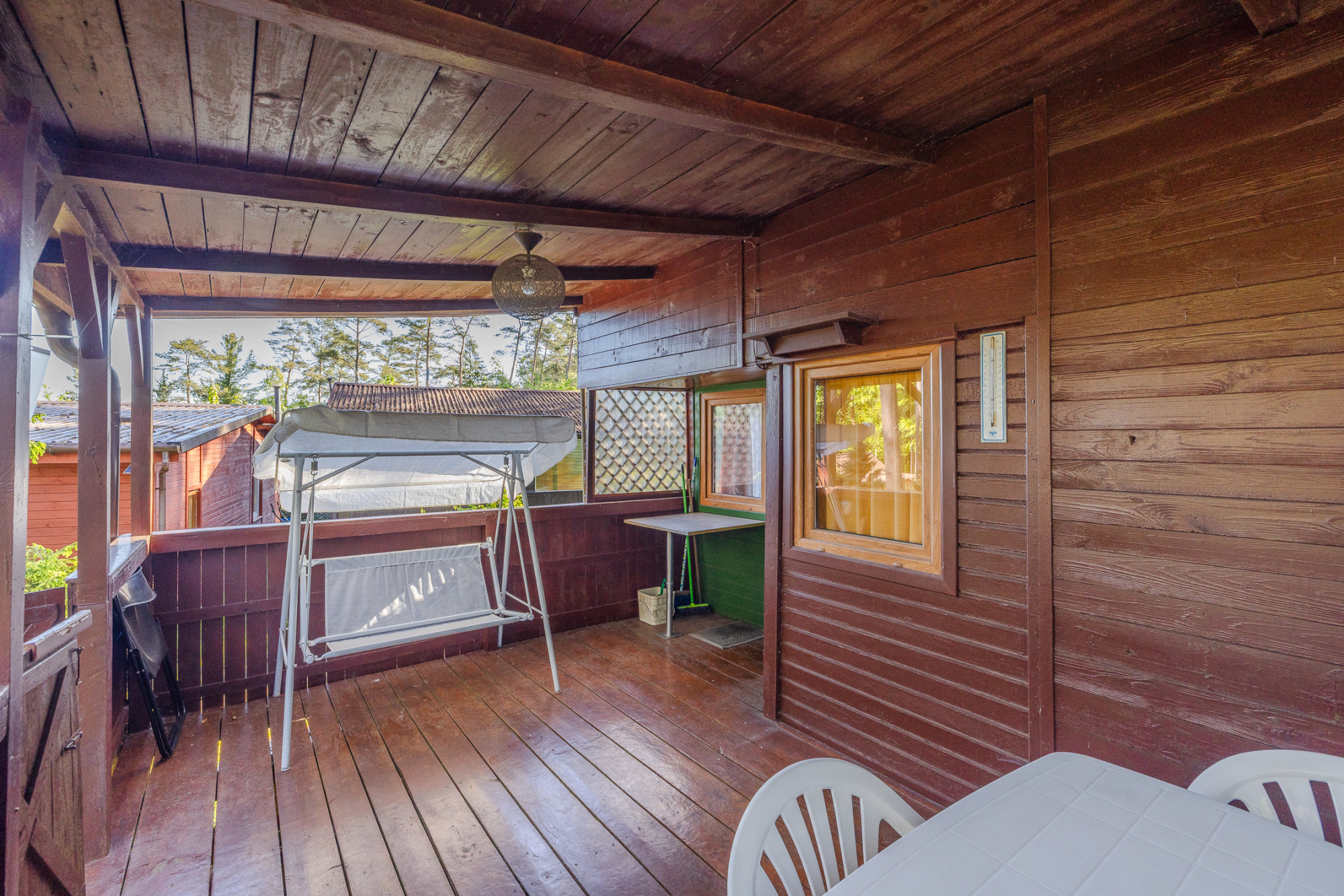 Domek zbudowany i wykończony z drewna (boazeria). Jest w dobrym stanie technicznym, na nowych drewnianych legarach, okna drewniane.