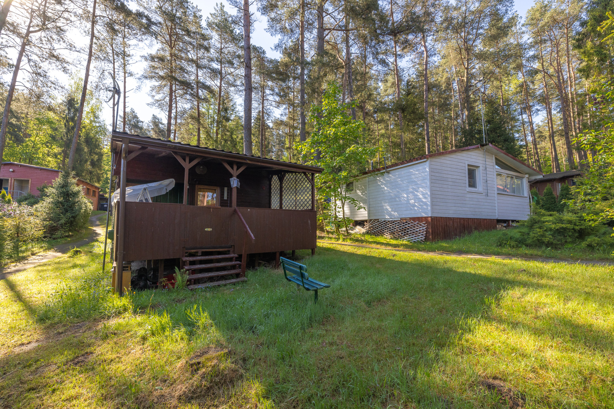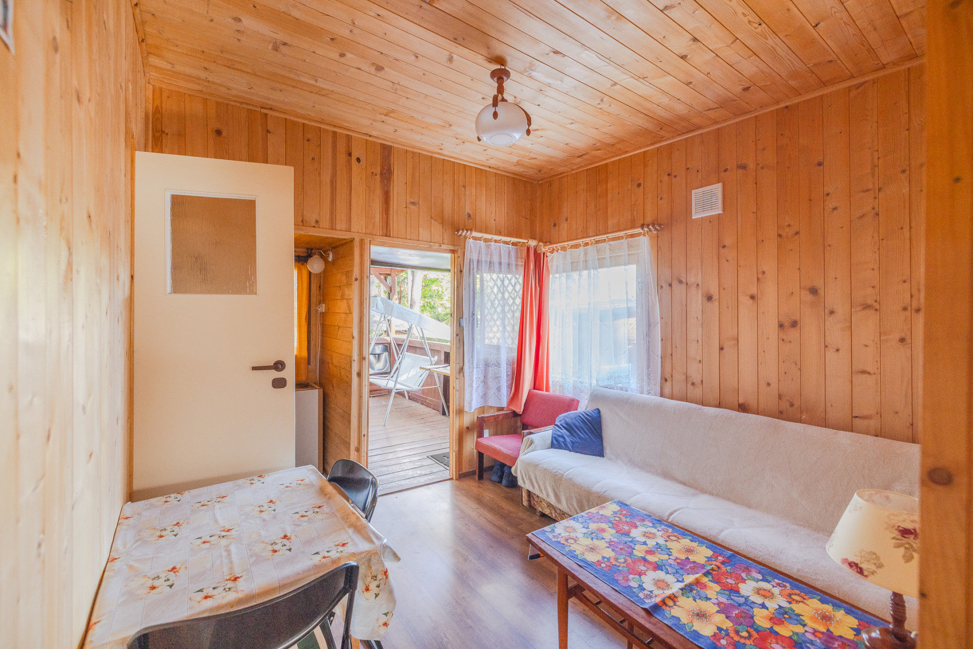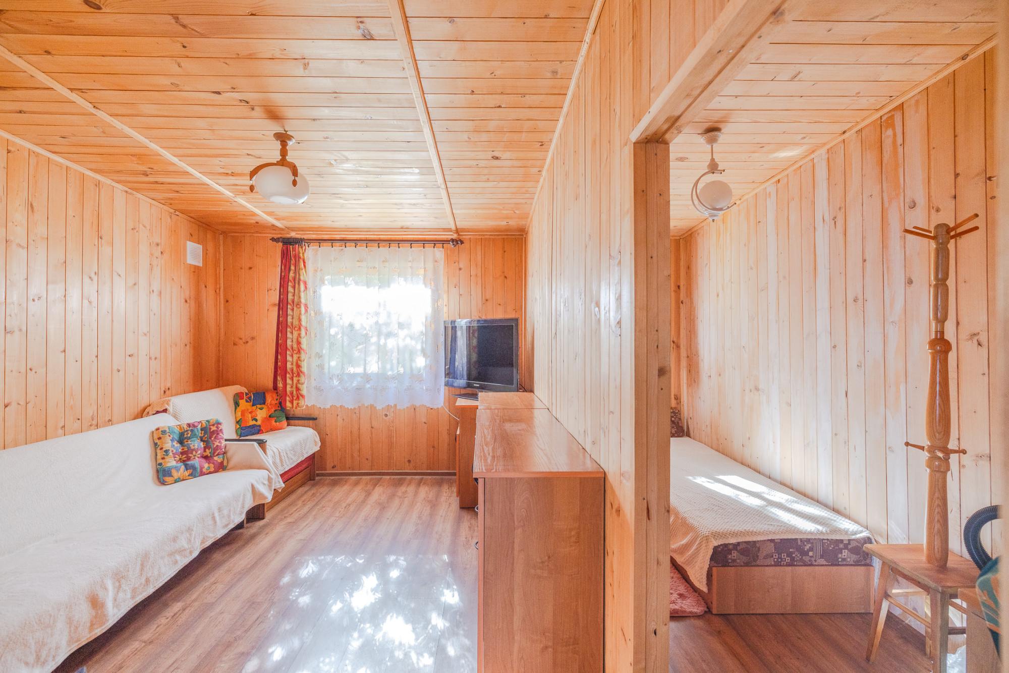 Domek zbudowany i wykończony z drewna (boazeria). Jest w dobrym stanie technicznym, na nowych drewnianych legarach, okna drewniane.