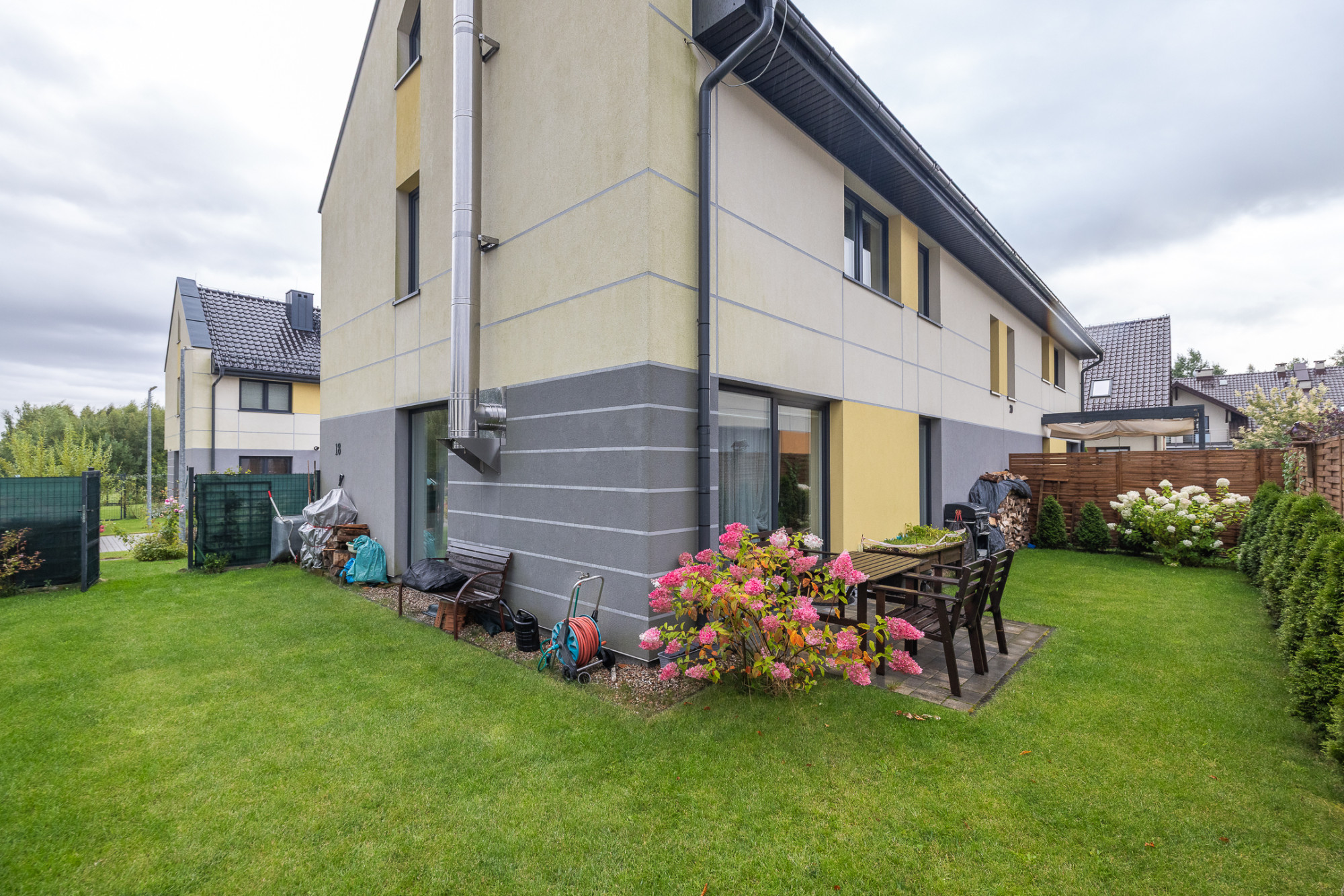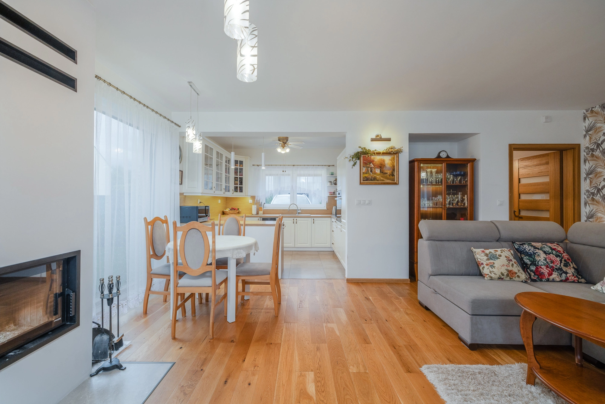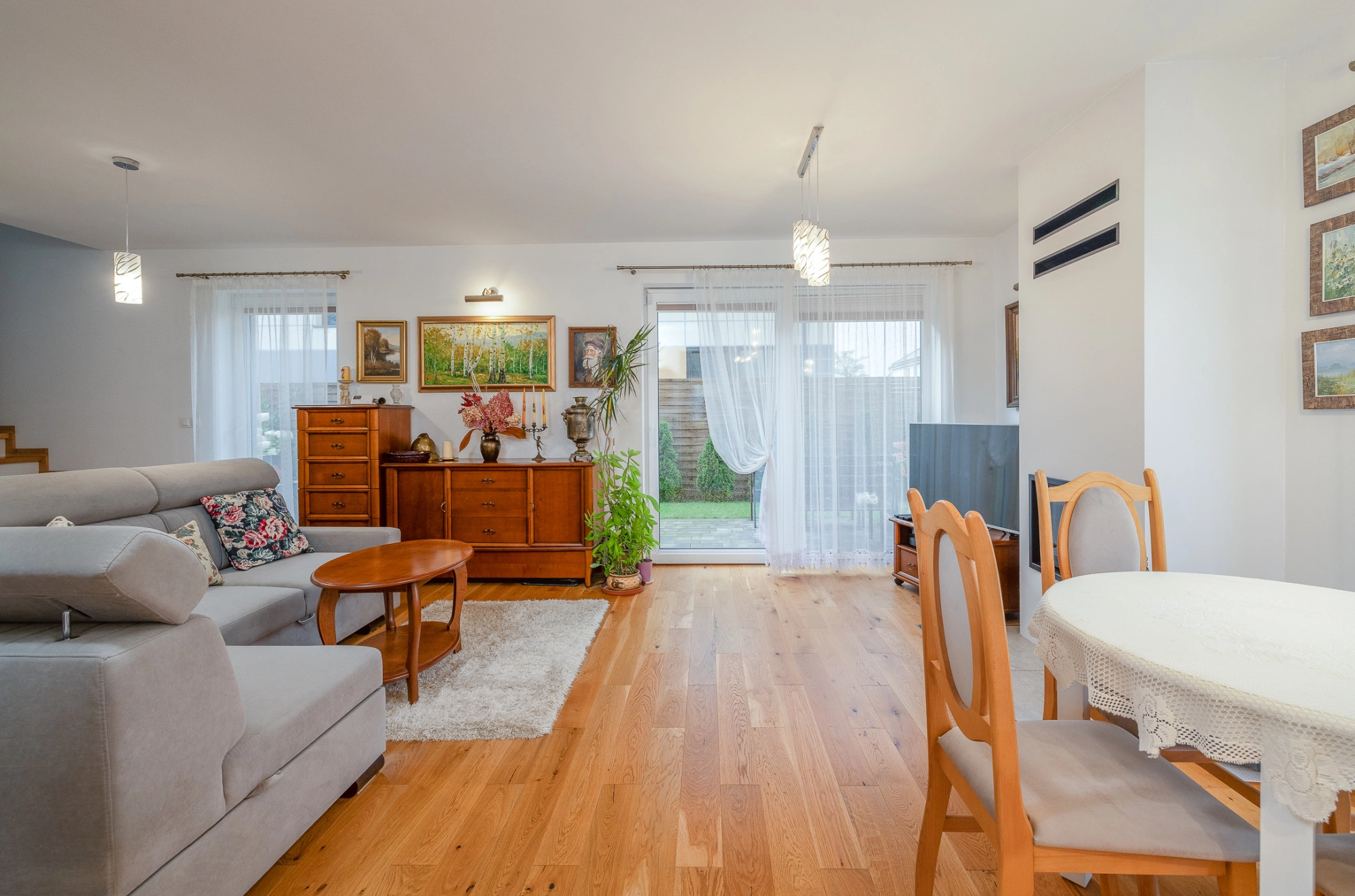 Na sprzedaż nowoczesny dom-bliźniak z 2021r. o powierzchni użytkowej 136m2, z tarasem, ogrodem i kominkiem. Dom jest funkcjonalny, wykończony w klasycznym stylu, z wysokiej jakości materiałów.